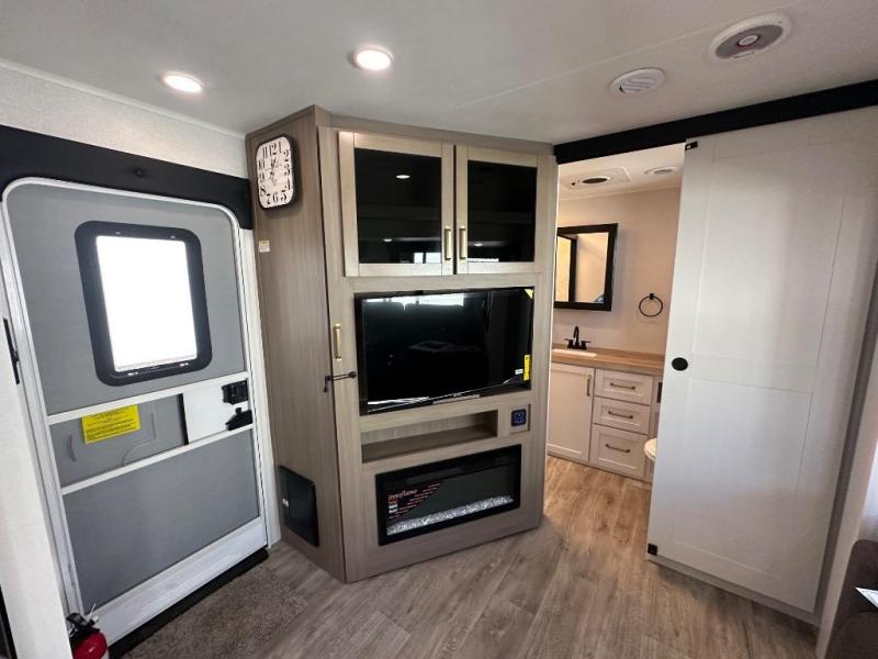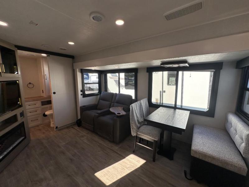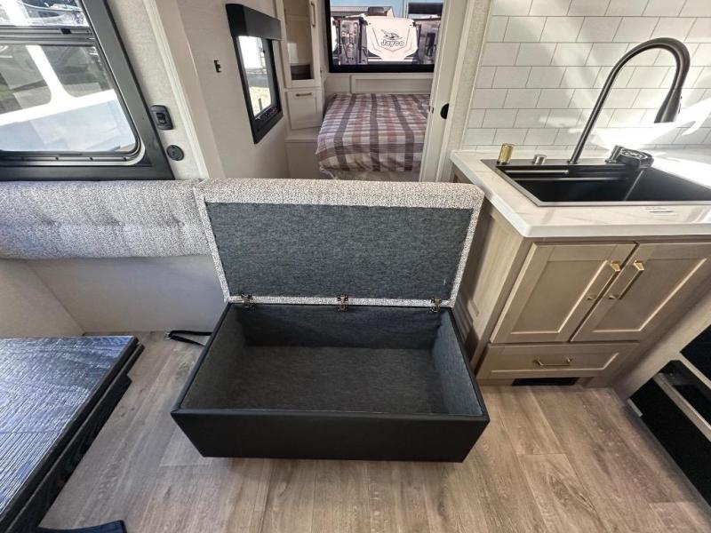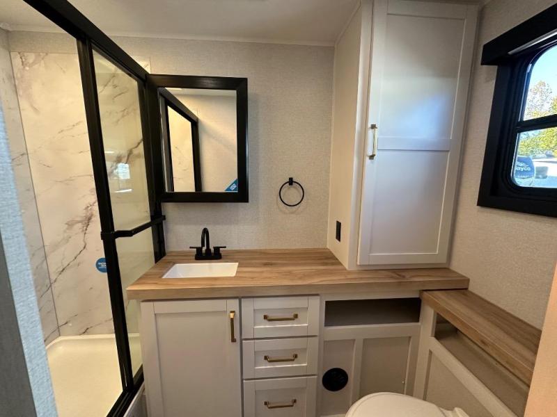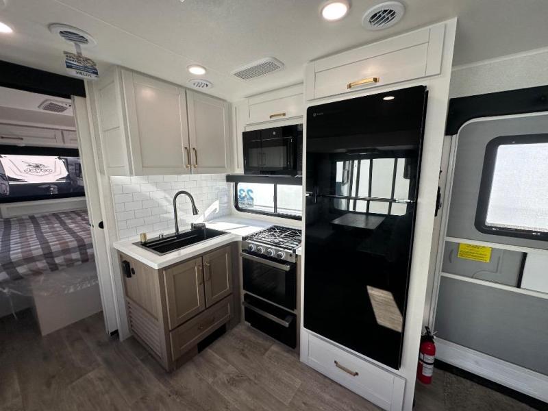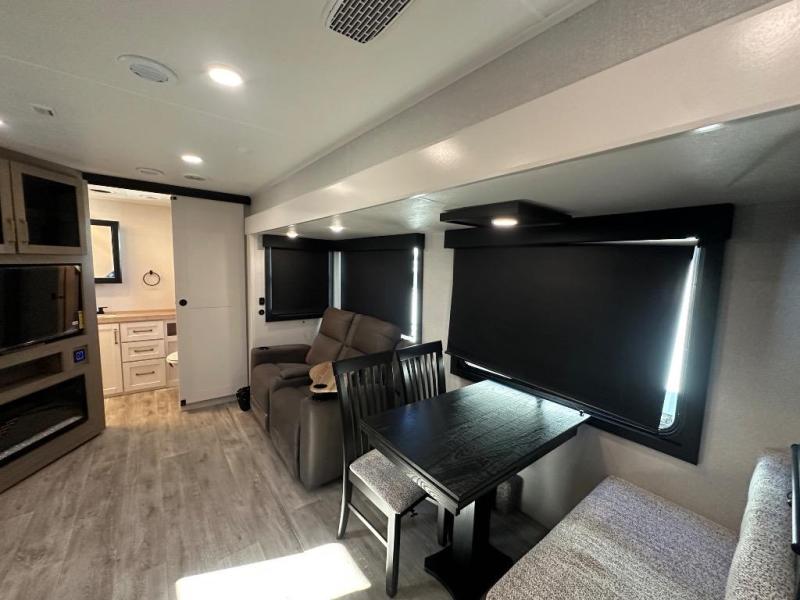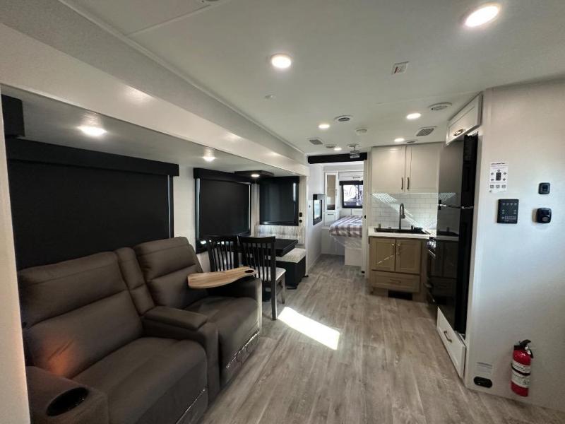 There's a lot to love about this travel trailer, from the full rear bath to the front private bedroom with an Olympic queen-size bed! The tri-fold sofa with cup holders will provide a comfy place to relax, and there is a table with chairs and a bench to dine at, and both of these pieces of furniture are within a large slide out for more floor space. The fully-equipped kitchen comes with a GE microwave and 21 in. range plus a GE 10 cu. ft. 12V refrigerator and walk-in pantry for food storage. And an exterior Jayport with LP Quick Connect and hot/cold water makes it possible to hook up your own grill!