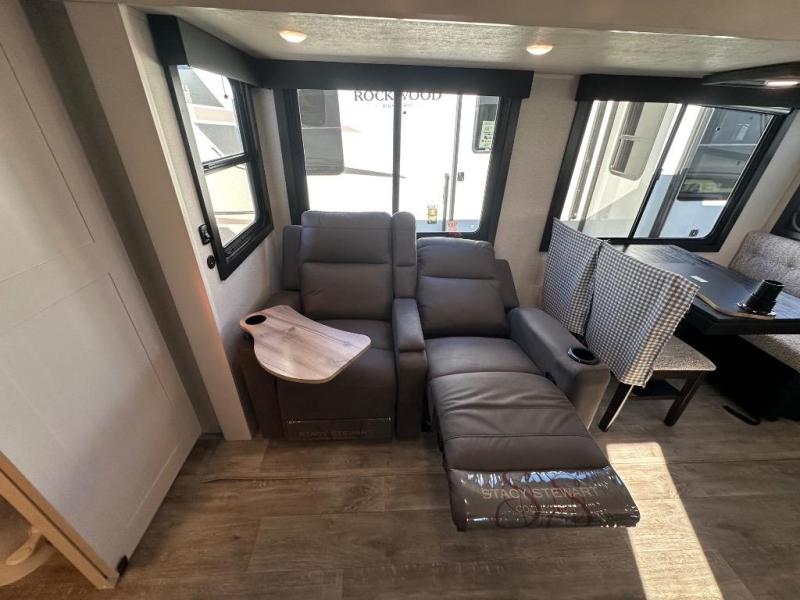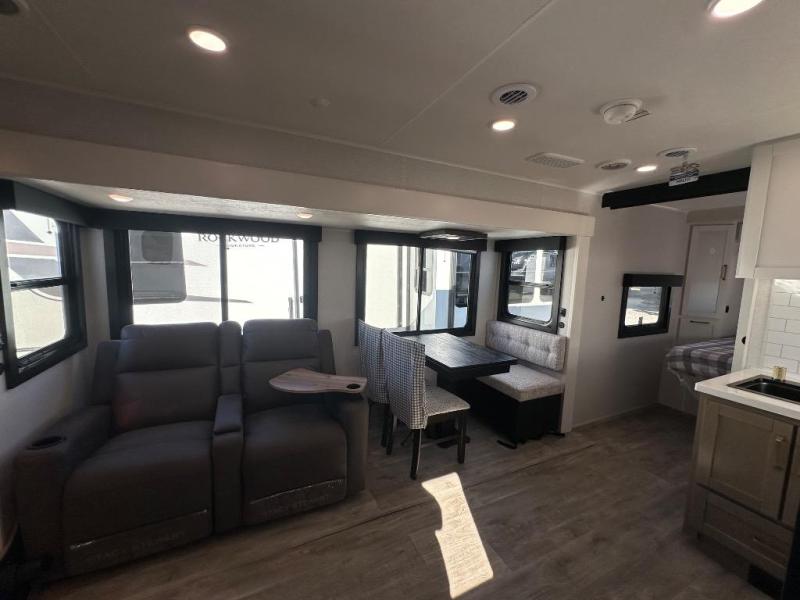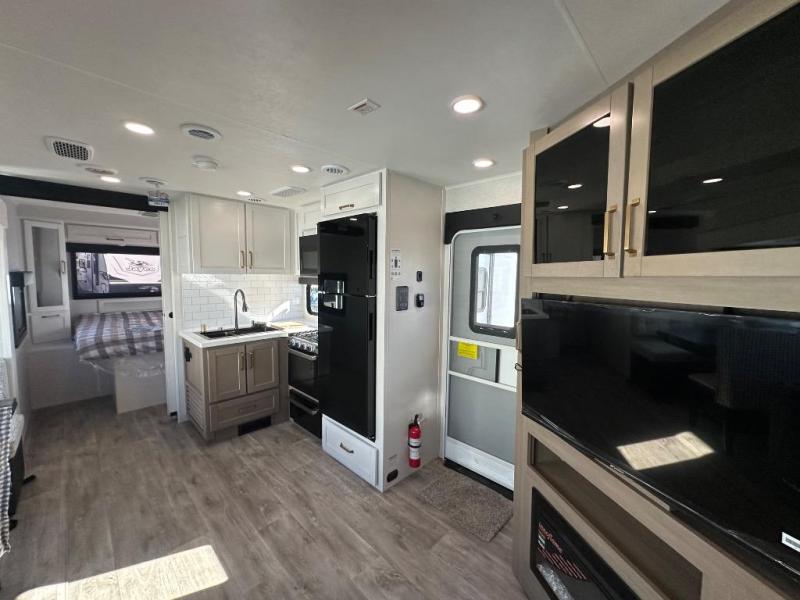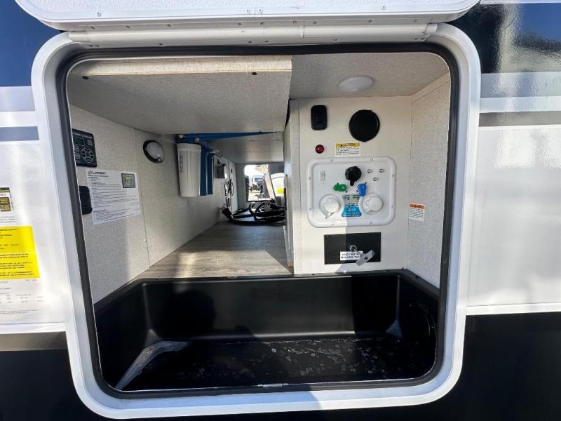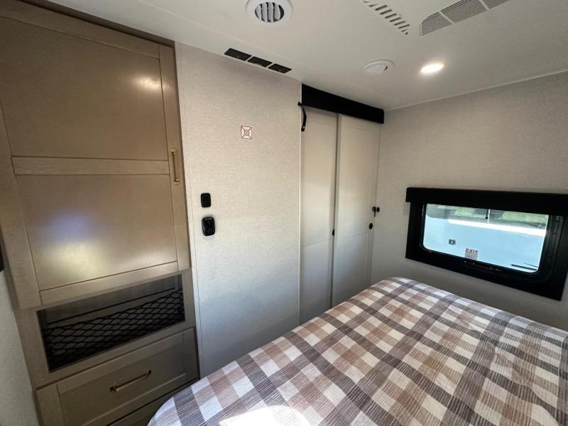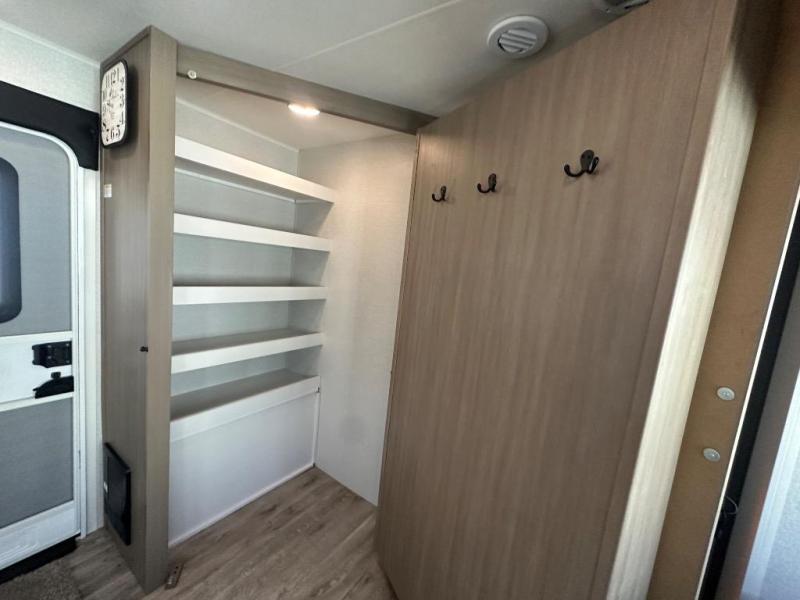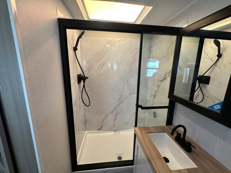 There's a lot to love about this travel trailer, from the full rear bath to the front private bedroom with an Olympic queen-size bed! The tri-fold sofa with cup holders will provide a comfy place to relax, and there is a table with chairs and a bench to dine at, and both of these pieces of furniture are within a large slide out for more floor space. The fully-equipped kitchen comes with a GE microwave and 21 in. range plus a GE 10 cu. ft. 12V refrigerator and walk-in pantry for food storage. And an exterior Jayport with LP Quick Connect and hot/cold water makes it possible to hook up your own grill!