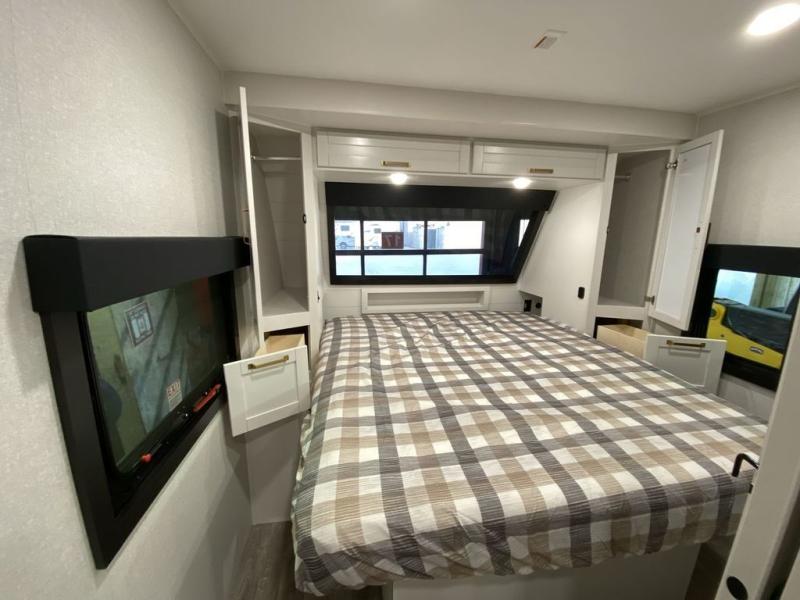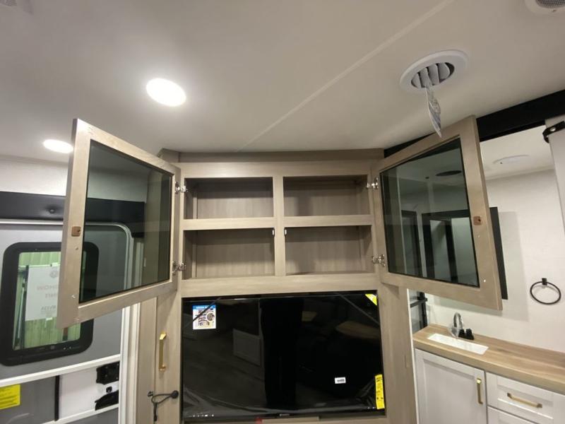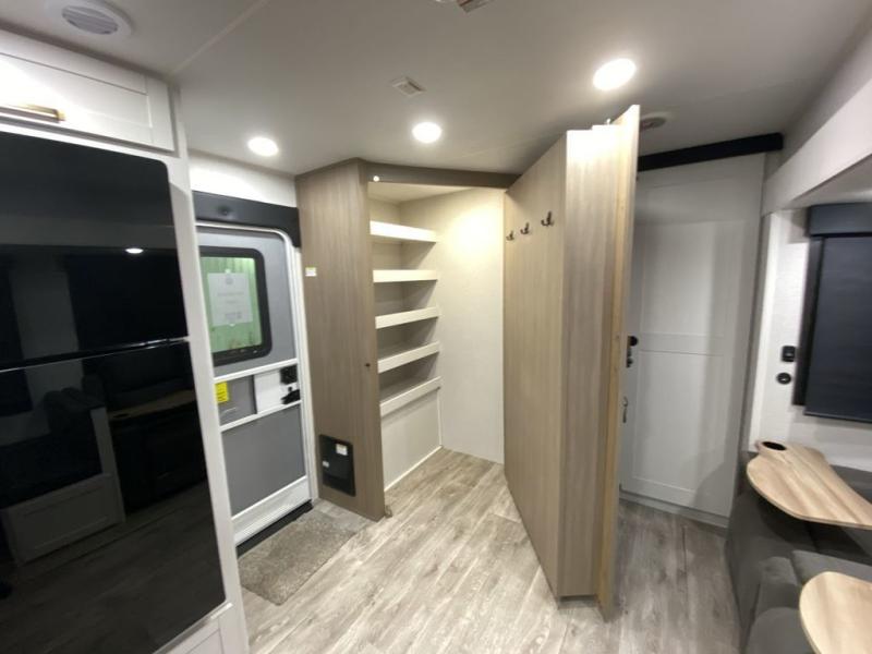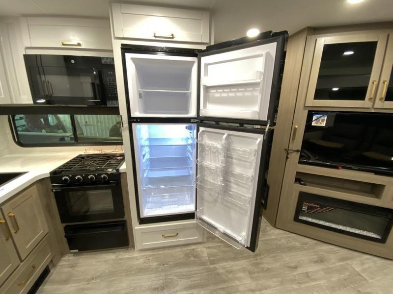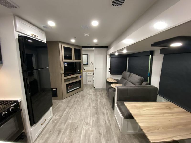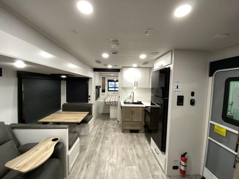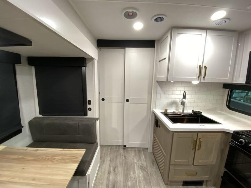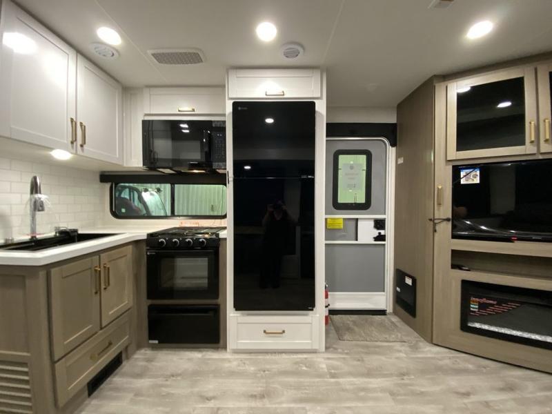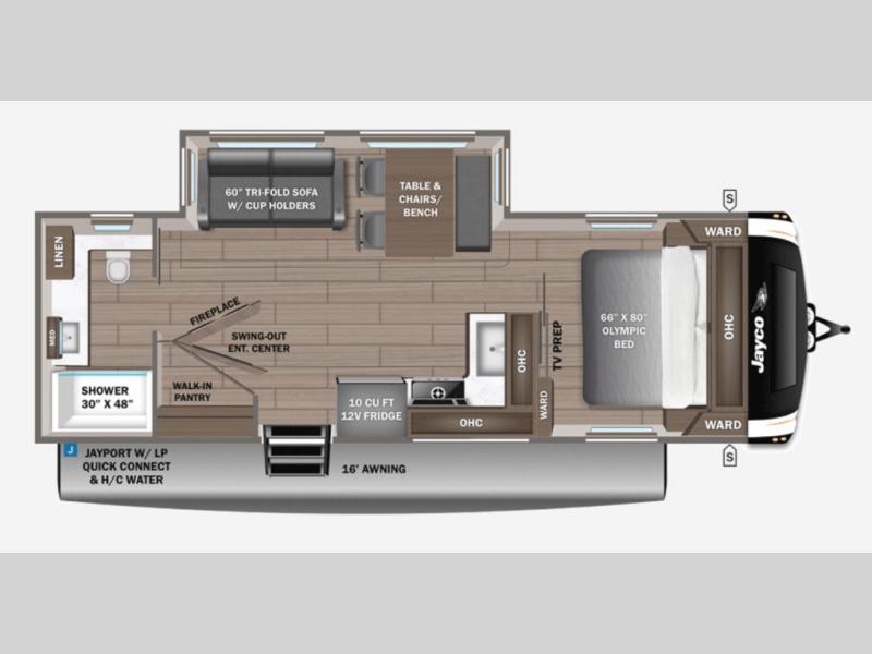 There's a lot to love about this travel trailer, from the full rear bath to the front private bedroom with an Olympic queen-size bed! The tri-fold sofa with cup holders will provide a comfy place to relax, and there is a table with chairs and a bench to dine at, and both of these pieces of furniture are within a large slide out for more floor space. The fully-equipped kitchen comes with a GE microwave and 21 in. range plus a GE 10 cu. ft. 12V refrigerator and walk-in pantry for food storage. And an exterior Jayport with LP Quick Connect and hot/cold water makes it possible to hook up your own grill!