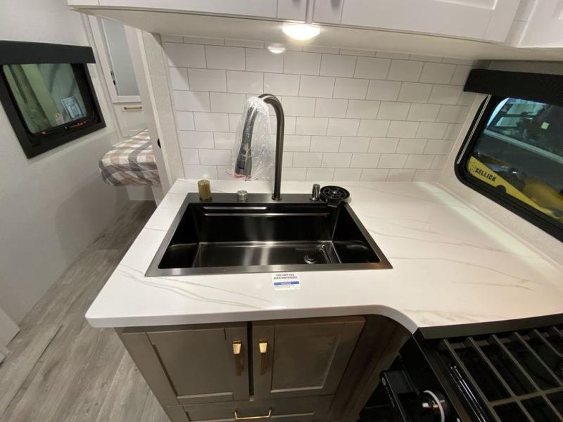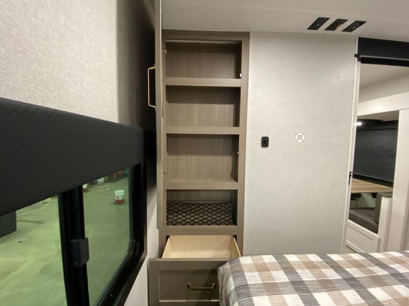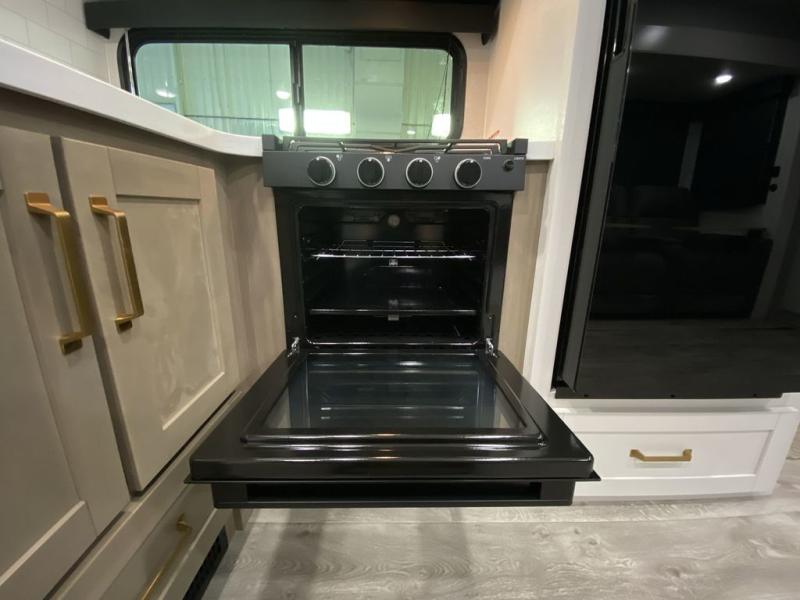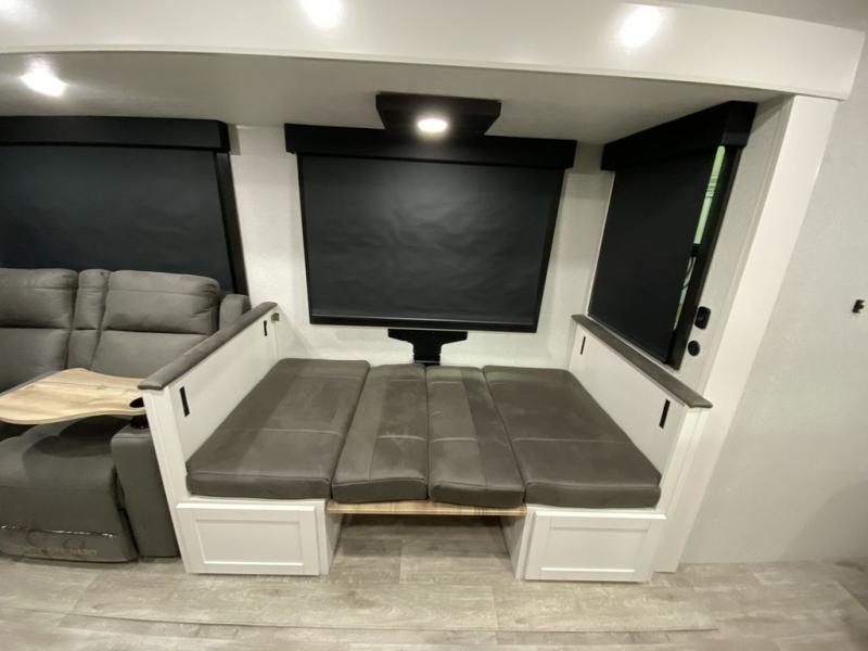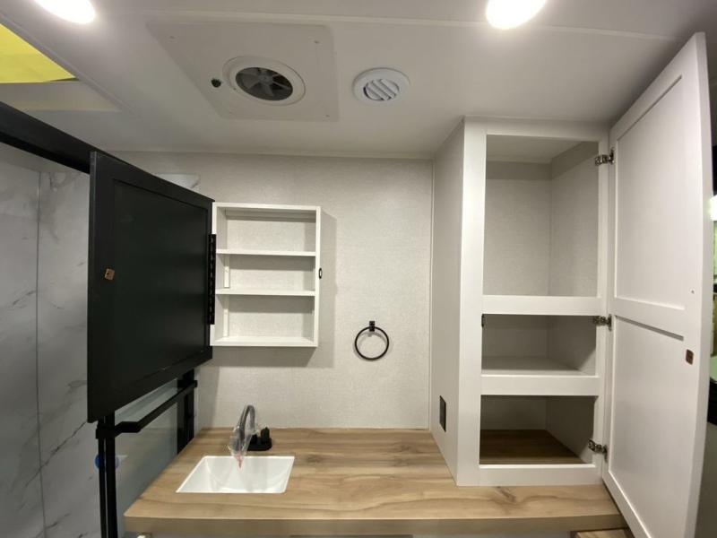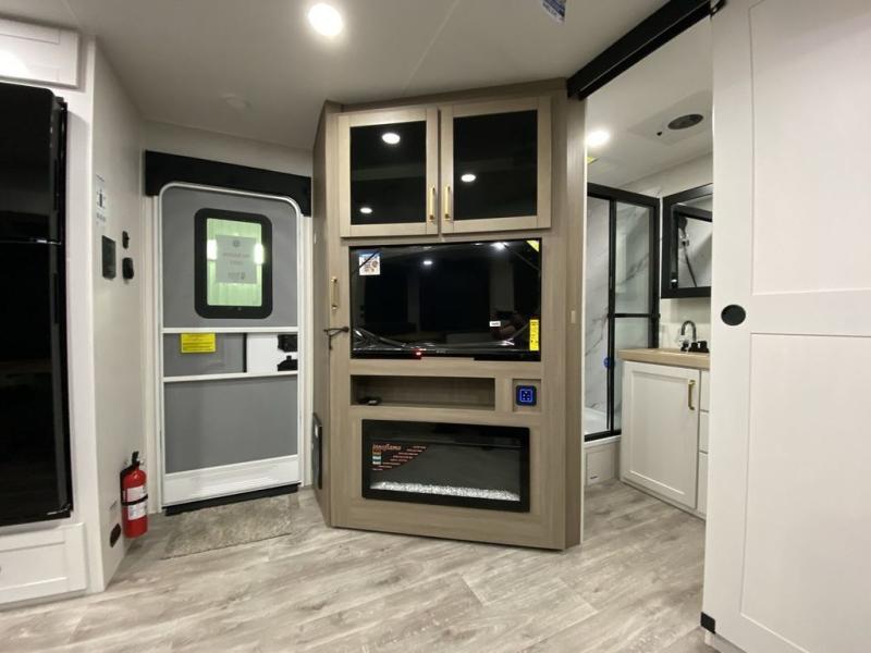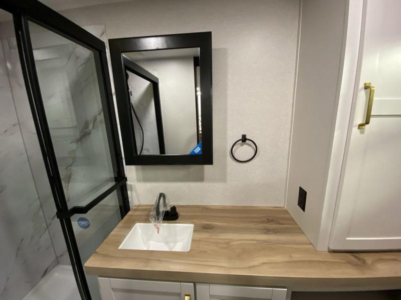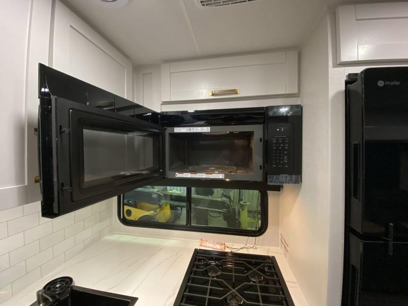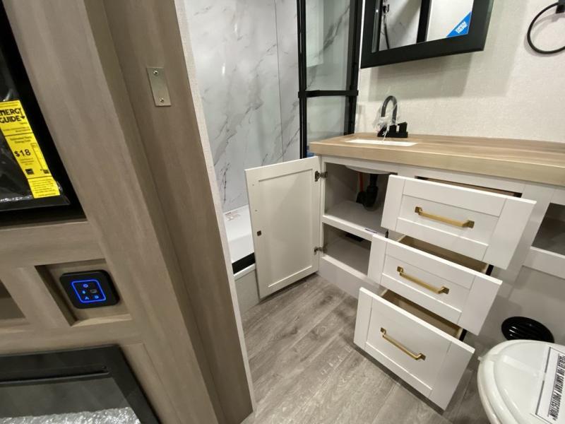 There's a lot to love about this travel trailer, from the full rear bath to the front private bedroom with an Olympic queen-size bed! The tri-fold sofa with cup holders will provide a comfy place to relax, and there is a table with chairs and a bench to dine at, and both of these pieces of furniture are within a large slide out for more floor space. The fully-equipped kitchen comes with a GE microwave and 21 in. range plus a GE 10 cu. ft. 12V refrigerator and walk-in pantry for food storage. And an exterior Jayport with LP Quick Connect and hot/cold water makes it possible to hook up your own grill!