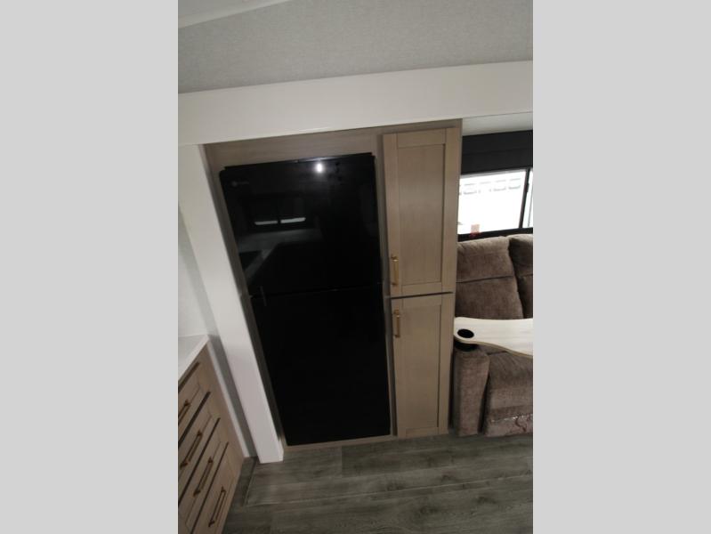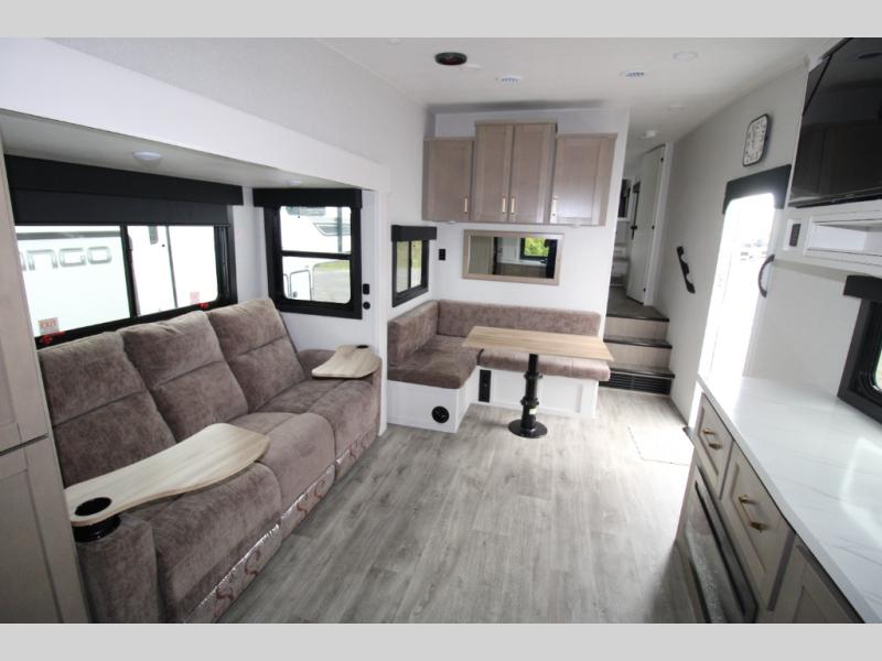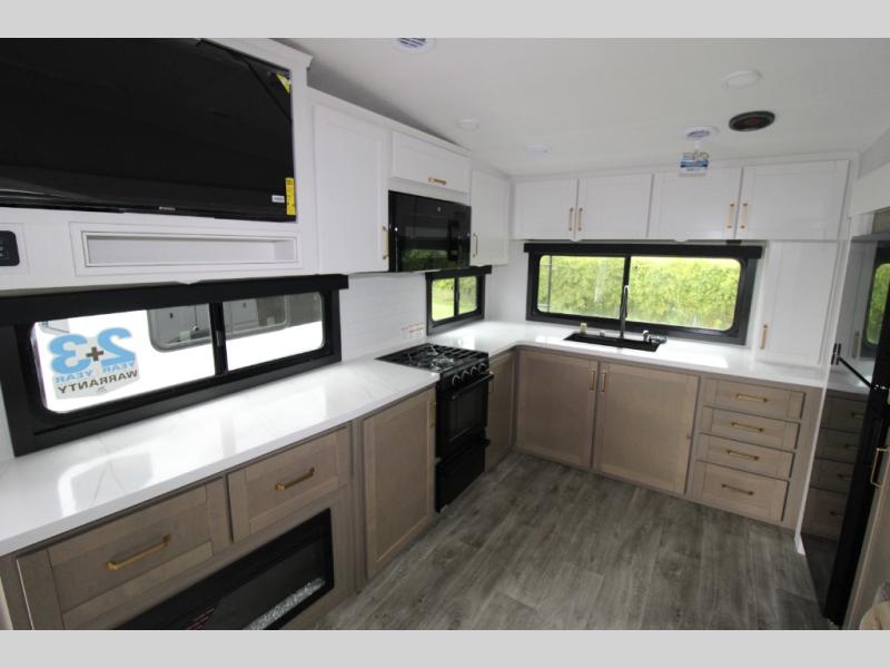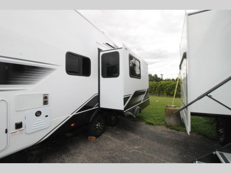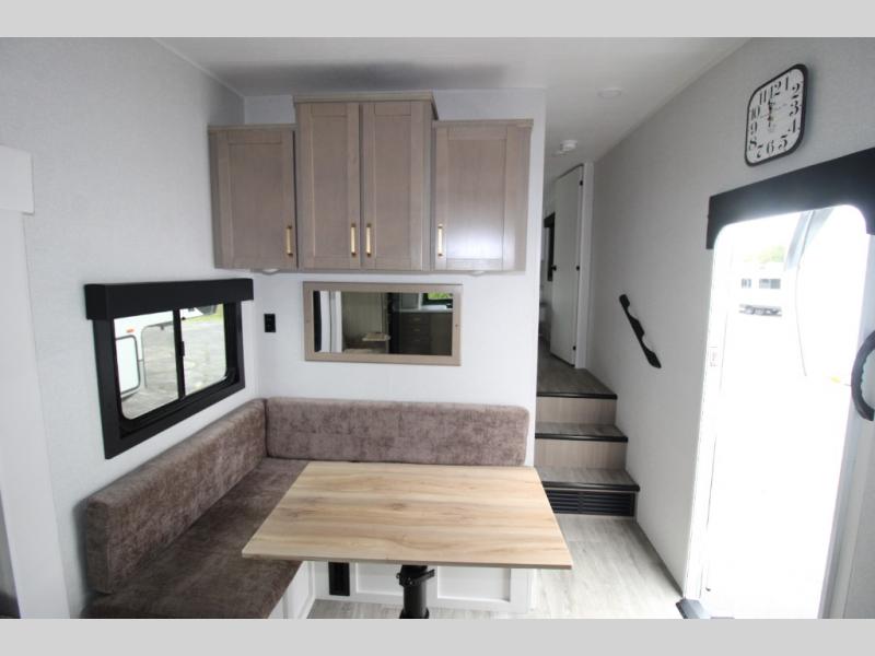 This fifth wheels is perfect for extended stays at the campground or weekend trips to the lake! Once you arrive at your destination, you can set up the 18' electric awning, then make lunch on the outside kitchen. The main living area will be a favorite place to join together since there is a theater seat across from the TV, an L-shaped dinette, and a fireplace to make this space even more cozy. Up front, a private bedroom includes an Olympic queen bed, dual wardrobes, plus washer and dryer prep if choose to add those appliances.