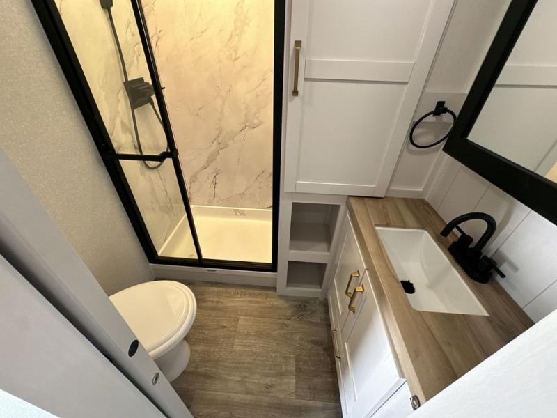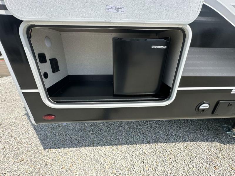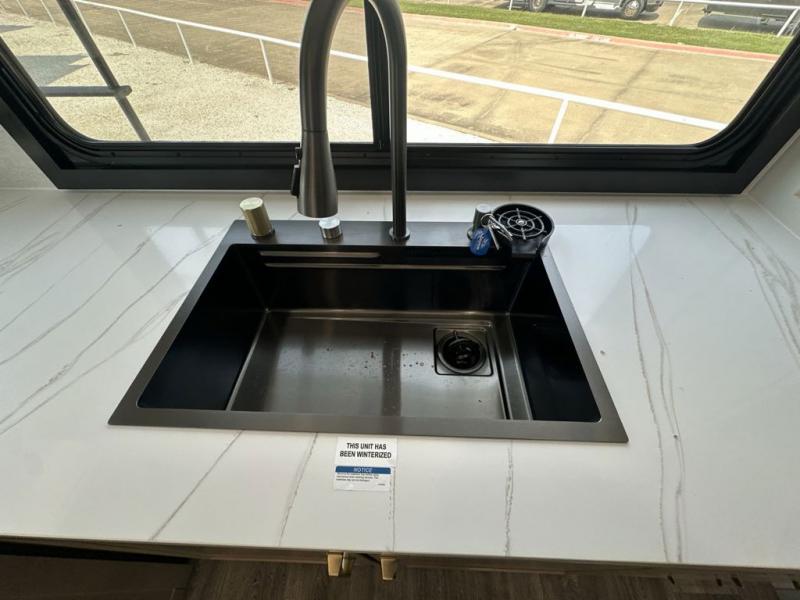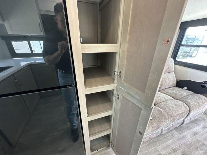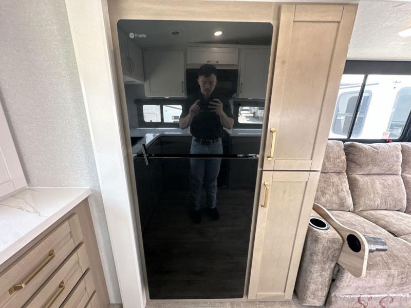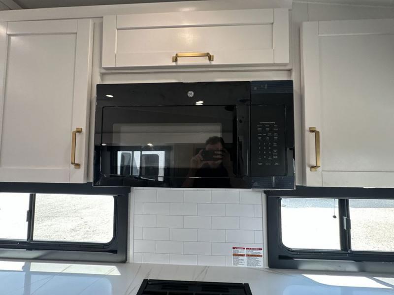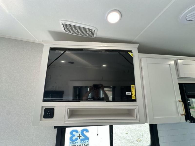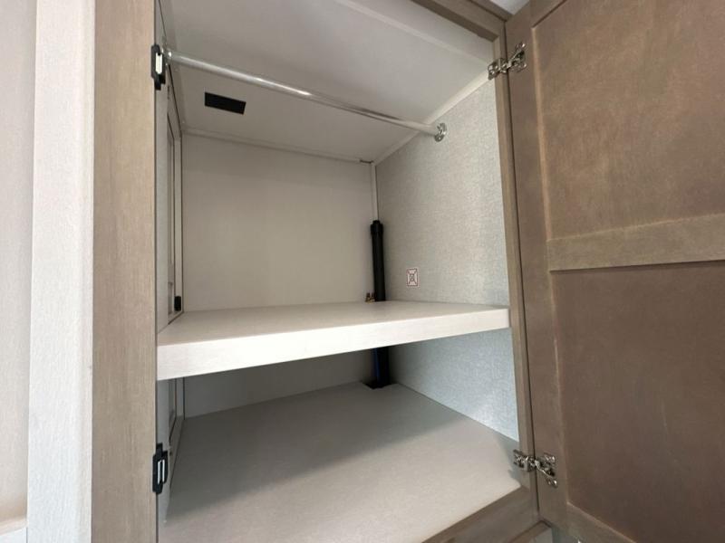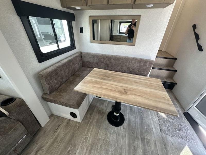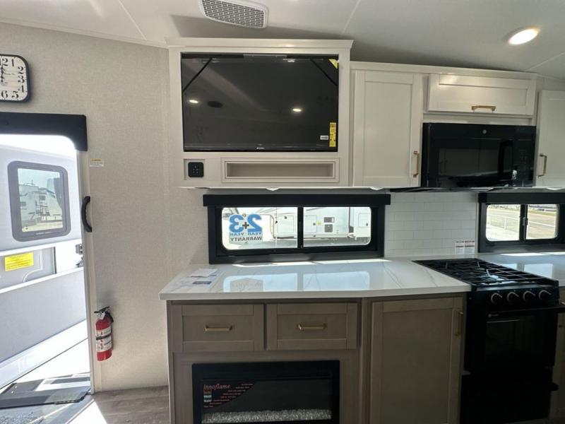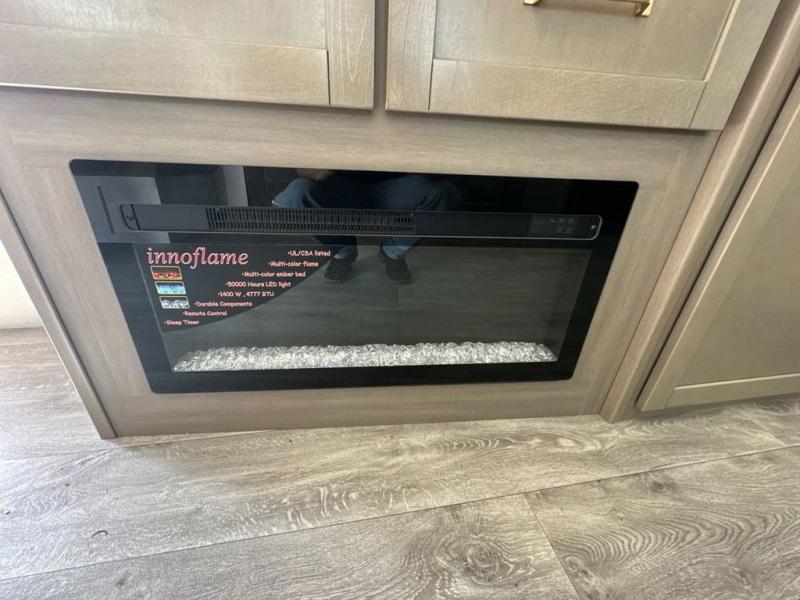 This fifth wheels is perfect for extended stays at the campground or weekend trips to the lake! Once you arrive at your destination, you can set up the 18' electric awning, then make lunch on the outside kitchen. The main living area will be a favorite place to join together since there is a theater seat across from the TV, an L-shaped dinette, and a fireplace to make this space even more cozy. Up front, a private bedroom includes an Olympic queen bed, dual wardrobes, plus washer and dryer prep if choose to add those appliances.