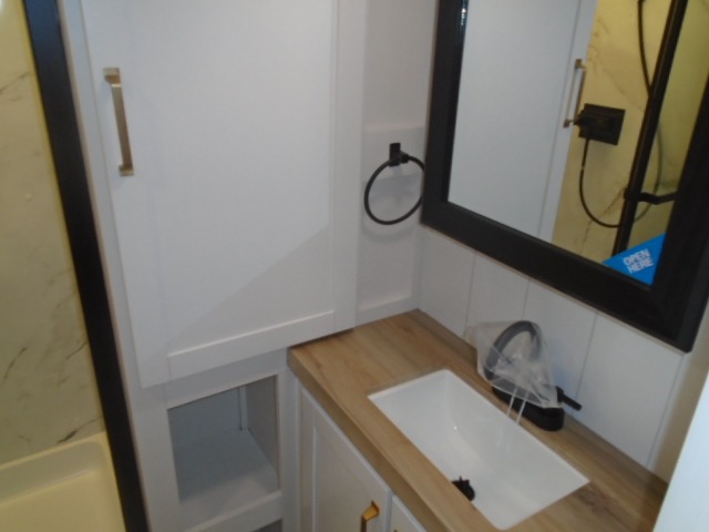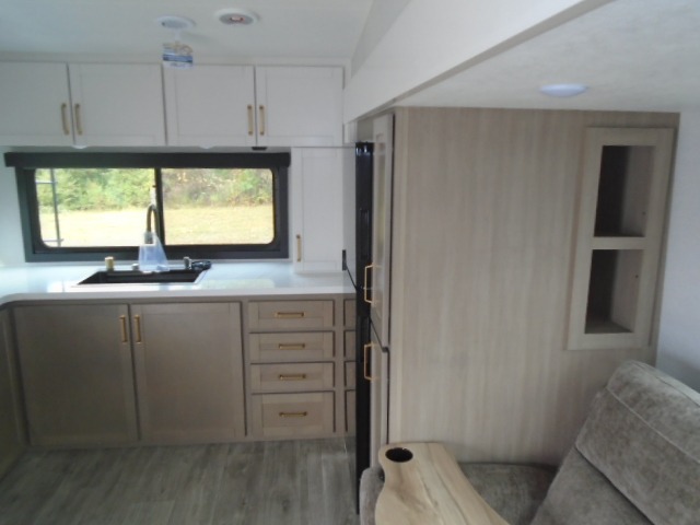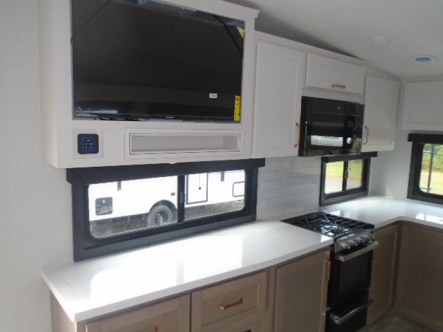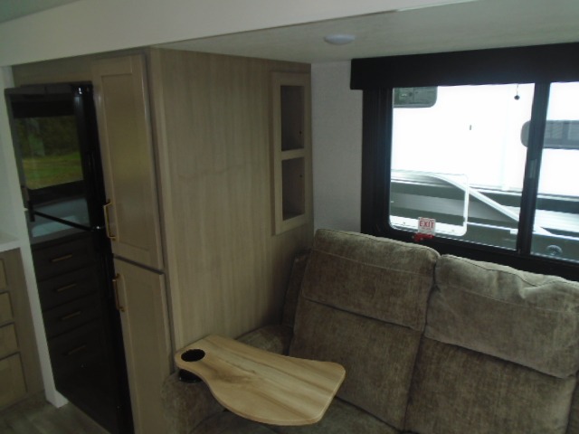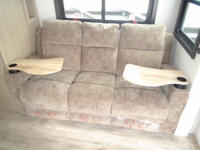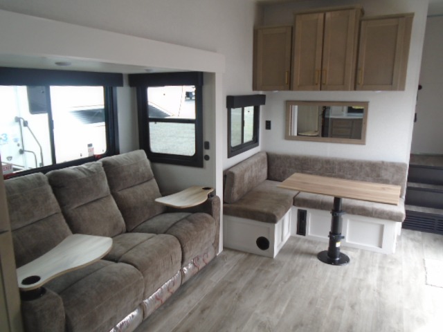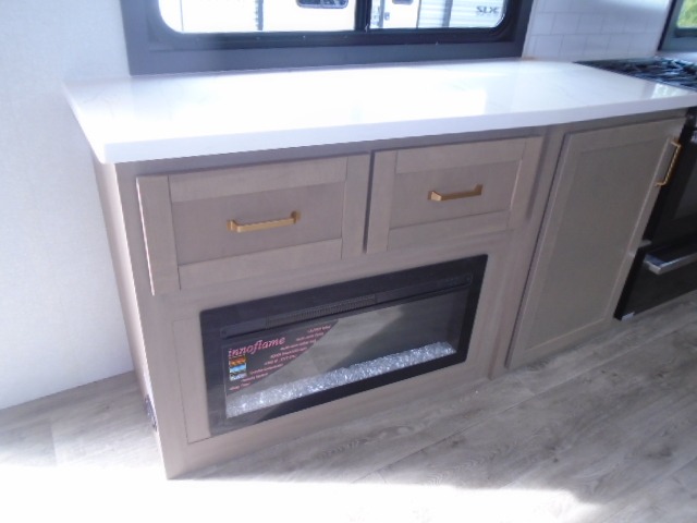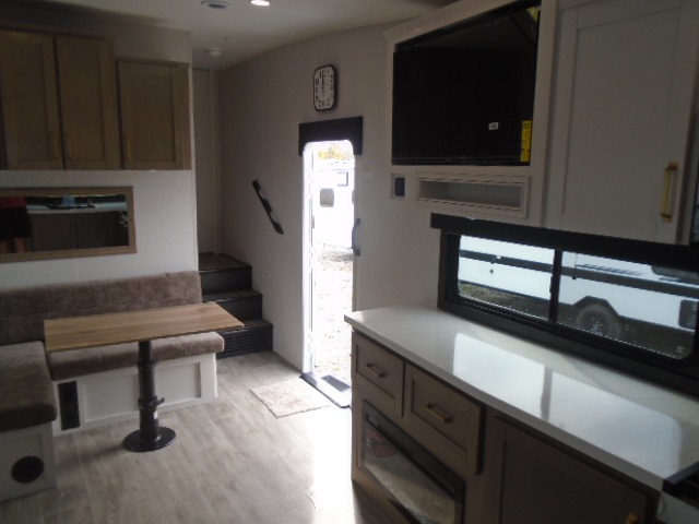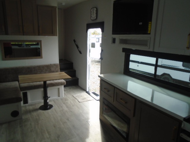 This fifth wheels is perfect for extended stays at the campground or weekend trips to the lake! Once you arrive at your destination, you can set up the 18' electric awning, then make lunch on the outside kitchen. The main living area will be a favorite place to join together since there is a theater seat across from the TV, an L-shaped dinette, and a fireplace to make this space even more cozy. Up front, a private bedroom includes an Olympic queen bed, dual wardrobes, plus washer and dryer prep if choose to add those appliances.