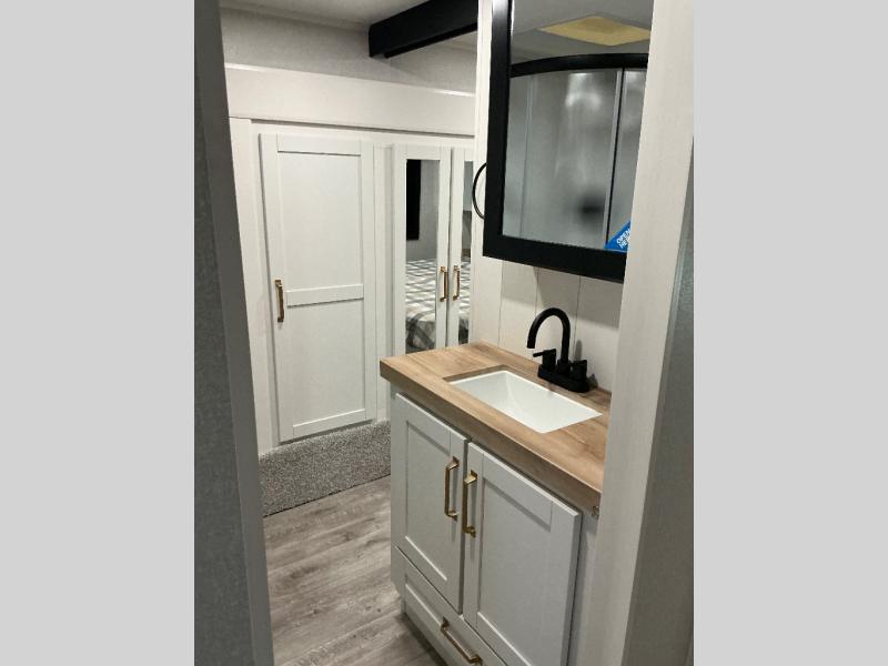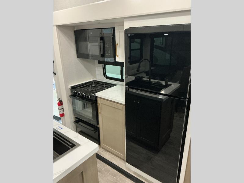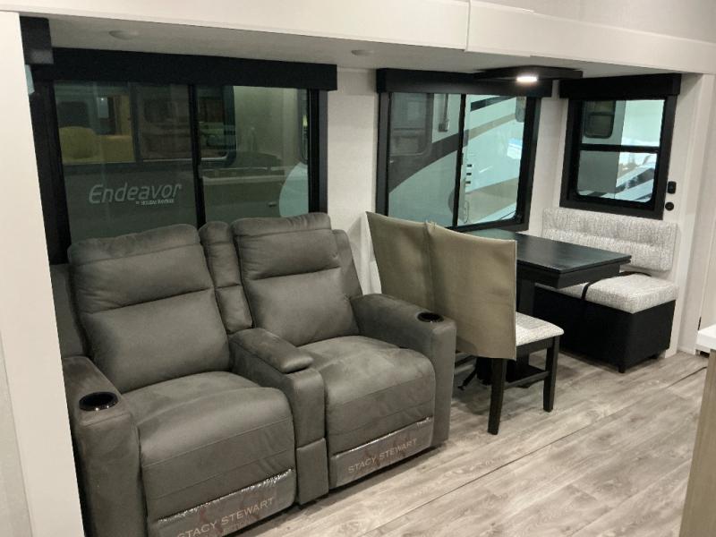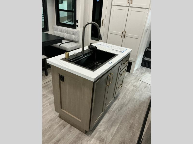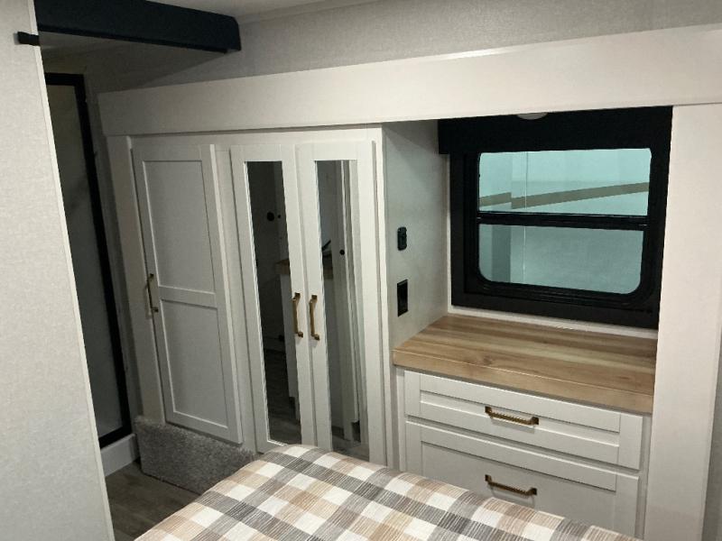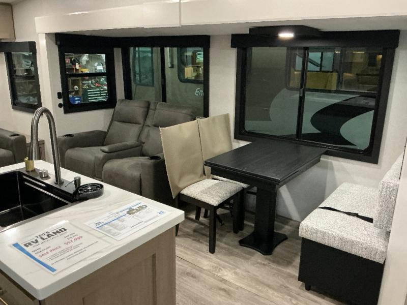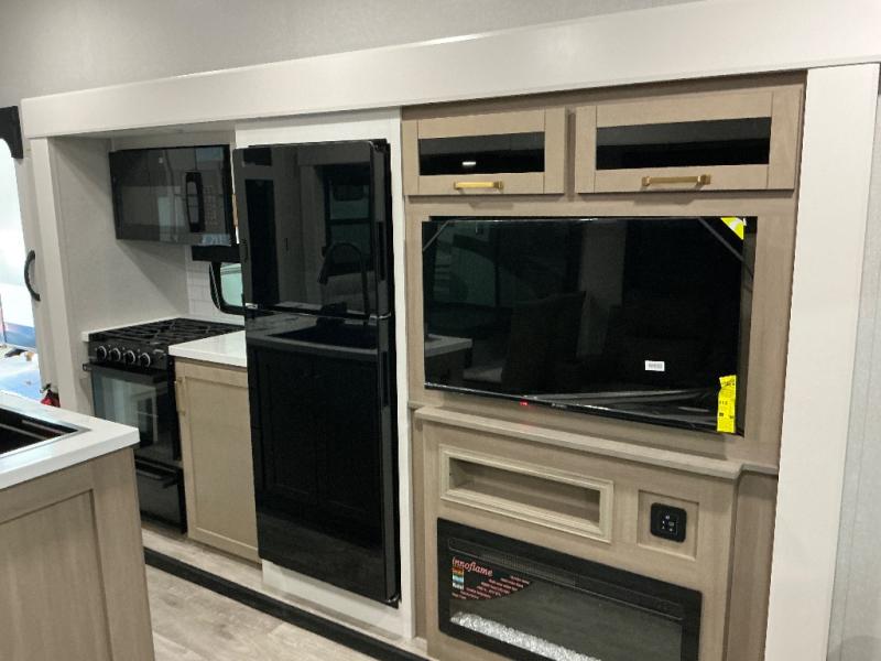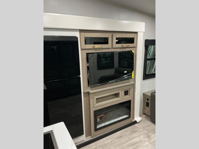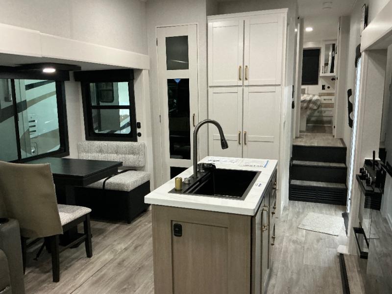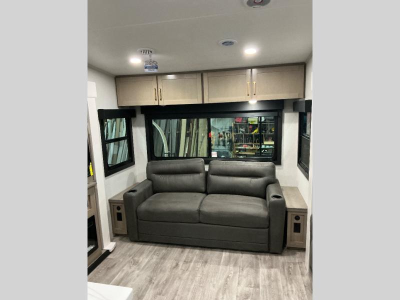 Pack your bags and head off on adventure in this spacious fifth wheel for four! The dual opposing slides in the kitchen and main living area will give your crew more space to relax. Speaking of relaxing, there is a theater seat across from the fireplace and TV plus a tri-fold sofa to make it a movie night. The free-standing table includes two chairs on one side and a bench on the other, and the kitchen island is sure to be appreciated by the chef of your group. There is also a spacious kitchen pantry and an outside kitchen if they'd rather cook outdoors. The front master bedroom includes an Olympic queen bed, dual wardrobes plus a third wardrobe within the bedroom slide out, and TV prep if you want the option to watch a show in bed!