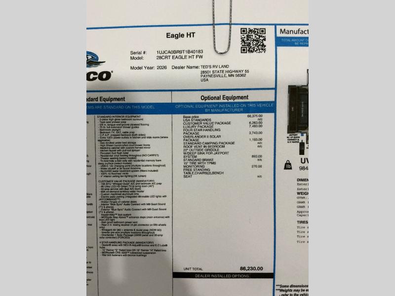 With any Eagle HT fifth wheel or travel trailer by Jayco you will enjoy a smooth drive thanks to the 4 Star Handling Package, Goodyear Endurance tires, and MORryde CRE-3000 rubberized suspension. The Customer Value Package includes amenities that are sure to make camping easier than ever, like the 60K on-demand water heater, Keyed-Alike lock system, 15,000 BTU "Whisper Quiet" A/C, and more. Handcrafted and glazed door/drawer fronts will make your space feel more like home, along with residential vinyl flooring throughout, GE appliances, and blackout roller shades with reflective side throughout to keep the sun out when you want to sleep in. Each model also includes a NuVo H2O water treatment system with filters included, interior and exterior "Blue Sync" audio connect with MB Quart Sound for your TV and phone, and 100% no floor vents for added comfort and convenience!