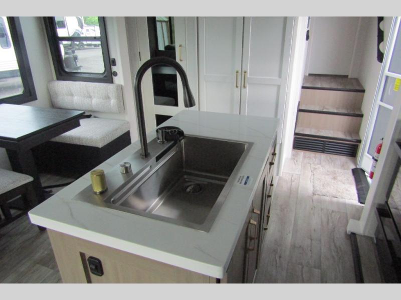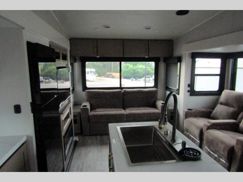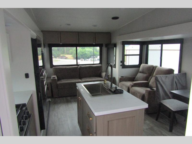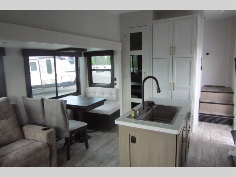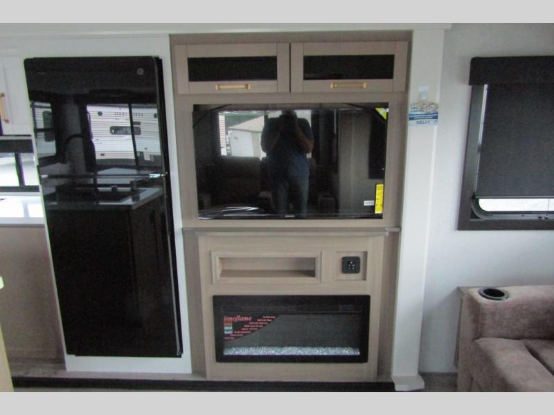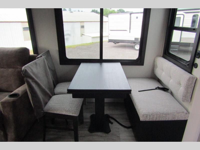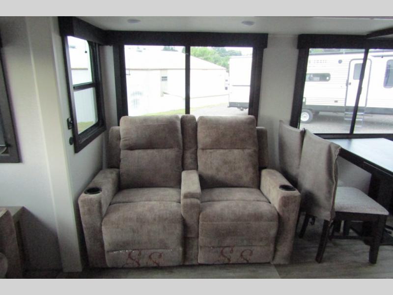 Pack your bags and head off on adventure in this spacious fifth wheel for four! The dual opposing slides in the kitchen and main living area will give your crew more space to relax. Speaking of relaxing, there is a theater seat across from the fireplace and TV plus a tri-fold sofa to make it a movie night. The free-standing table includes two chairs on one side and a bench on the other, and the kitchen island is sure to be appreciated by the chef of your group. There is also a spacious kitchen pantry and an outside kitchen if they'd rather cook outdoors. The front master bedroom includes an Olympic queen bed, dual wardrobes plus a third wardrobe within the bedroom slide out, and TV prep if you want the option to watch a show in bed!
