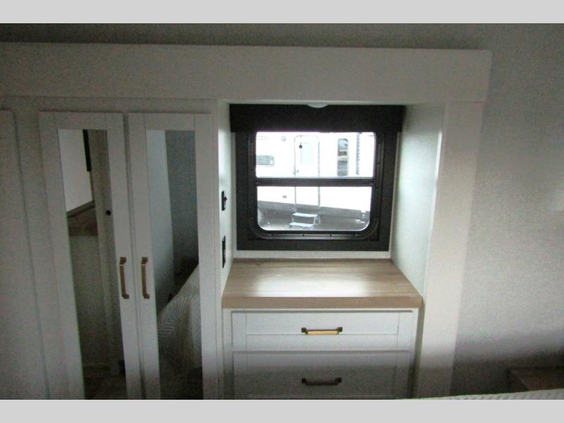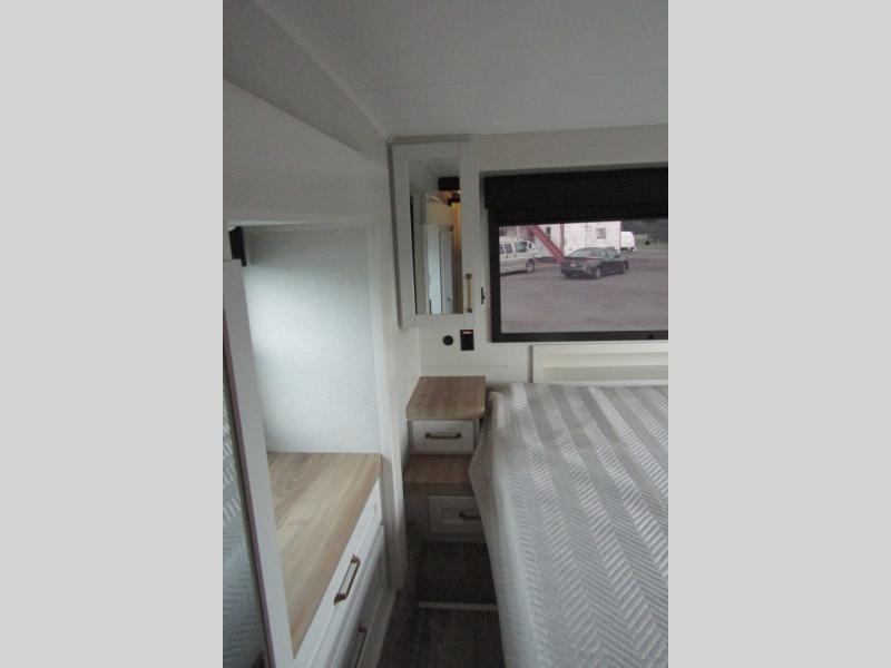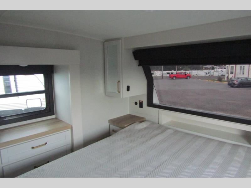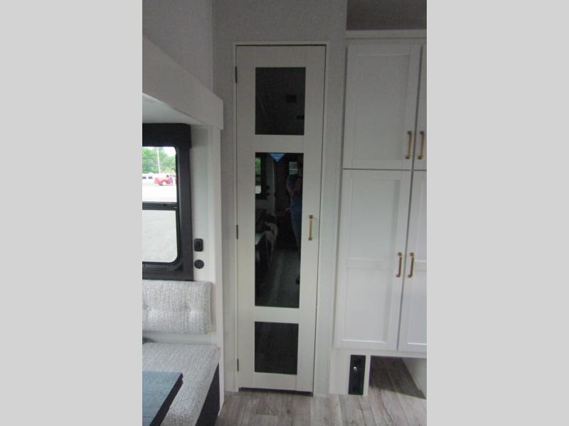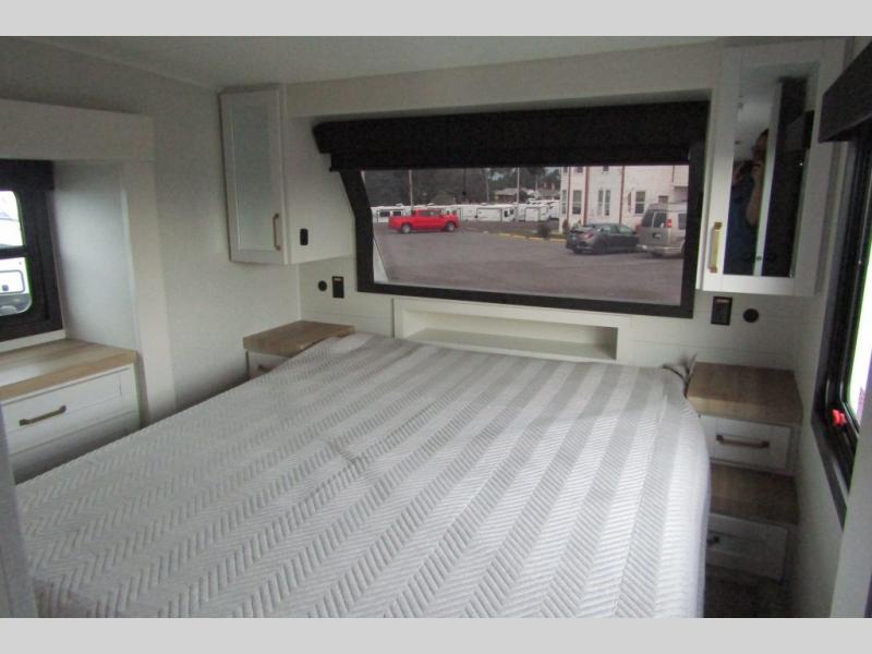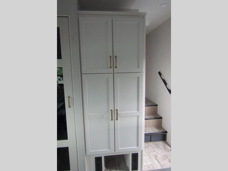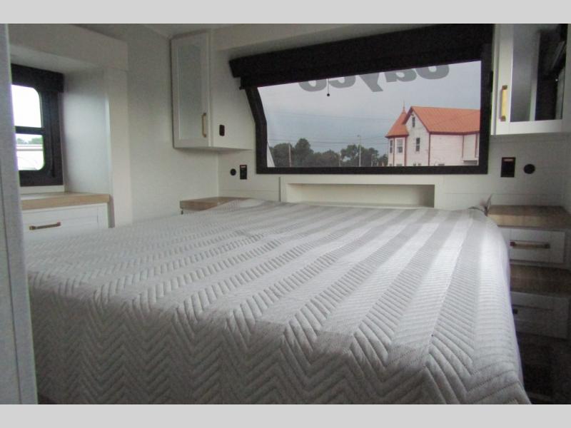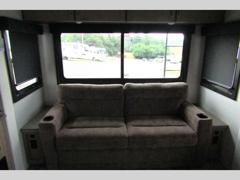 Pack your bags and head off on adventure in this spacious fifth wheel for four! The dual opposing slides in the kitchen and main living area will give your crew more space to relax. Speaking of relaxing, there is a theater seat across from the fireplace and TV plus a tri-fold sofa to make it a movie night. The free-standing table includes two chairs on one side and a bench on the other, and the kitchen island is sure to be appreciated by the chef of your group. There is also a spacious kitchen pantry and an outside kitchen if they'd rather cook outdoors. The front master bedroom includes an Olympic queen bed, dual wardrobes plus a third wardrobe within the bedroom slide out, and TV prep if you want the option to watch a show in bed!