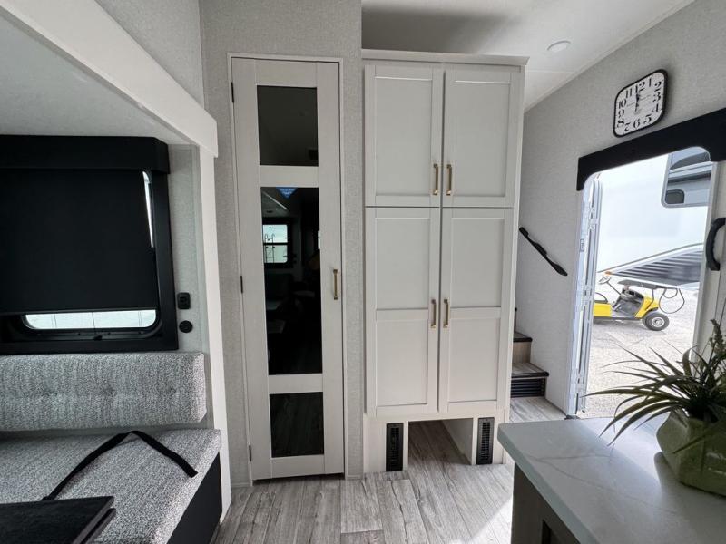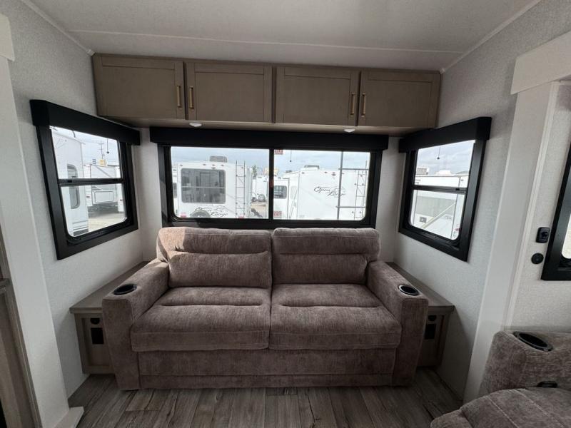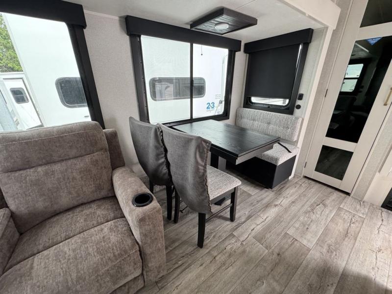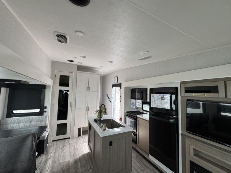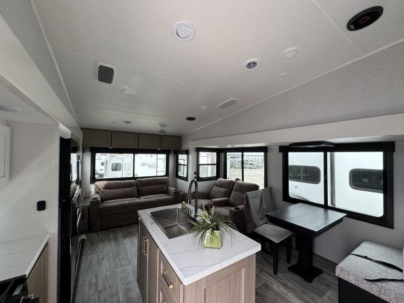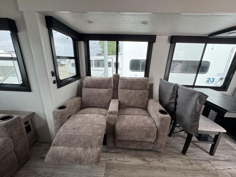 Pack your bags and head off on adventure in this spacious fifth wheel for four! The dual opposing slides in the kitchen and main living area will give your crew more space to relax. Speaking of relaxing, there is a theater seat across from the fireplace and TV plus a tri-fold sofa to make it a movie night. The free-standing table includes two chairs on one side and a bench on the other, and the kitchen island is sure to be appreciated by the chef of your group. There is also a spacious kitchen pantry and an outside kitchen if they'd rather cook outdoors. The front master bedroom includes an Olympic queen bed, dual wardrobes plus a third wardrobe within the bedroom slide out, and TV prep if you want the option to watch a show in bed!
