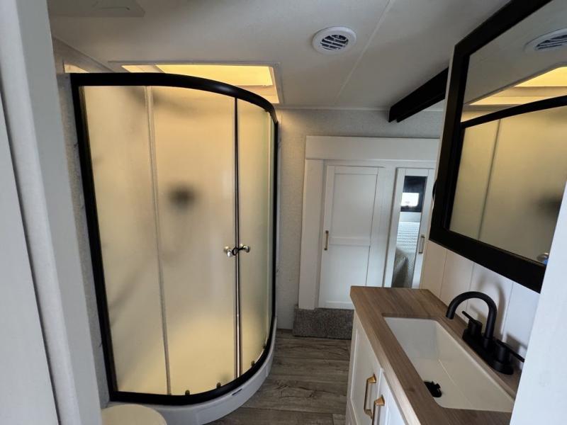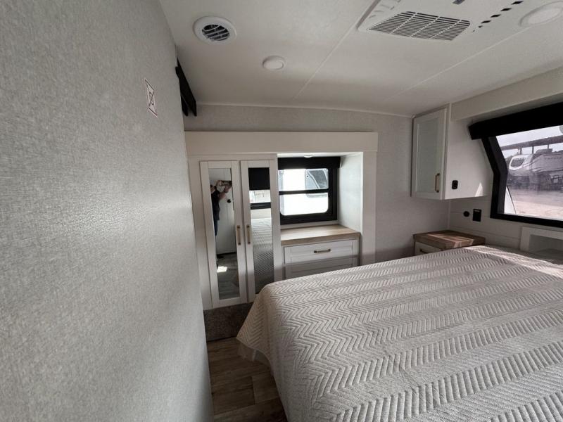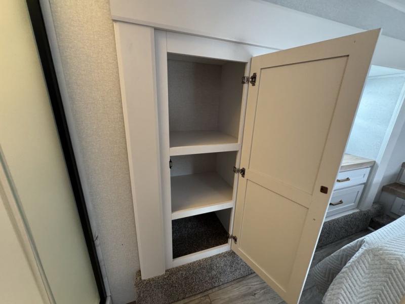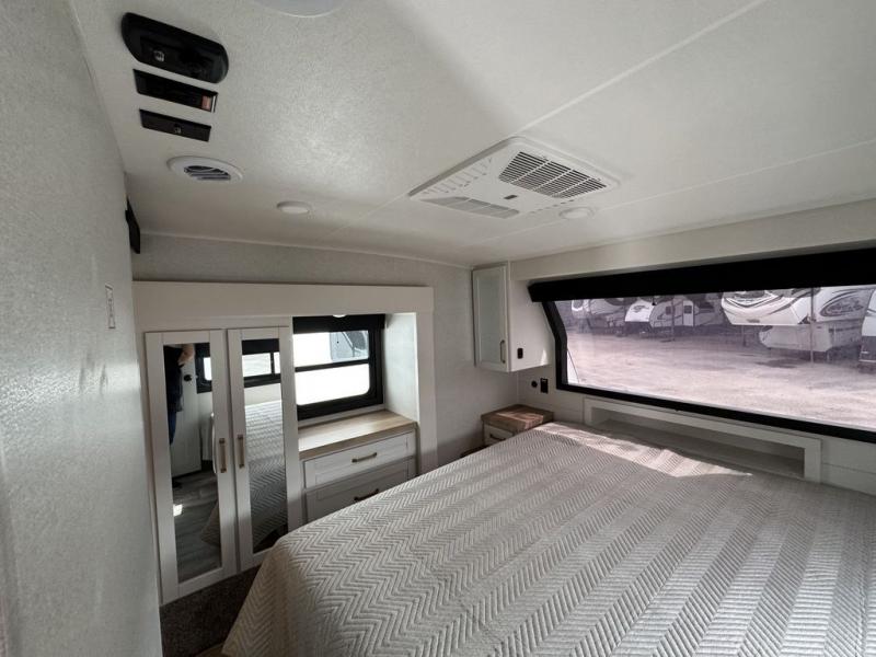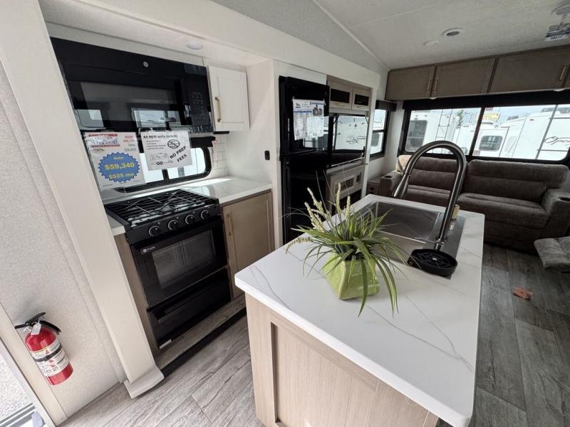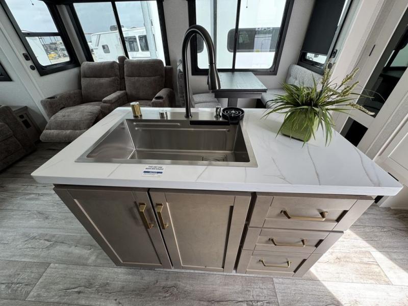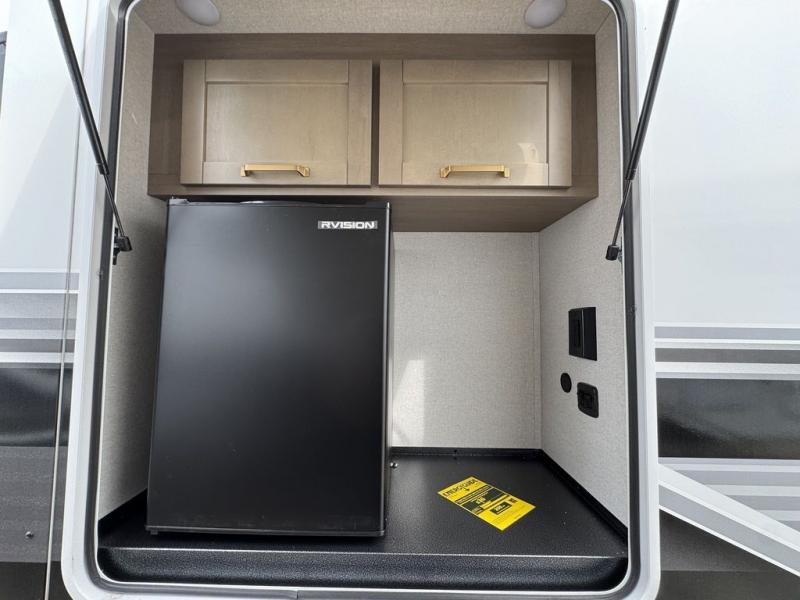 Pack your bags and head off on adventure in this spacious fifth wheel for four! The dual opposing slides in the kitchen and main living area will give your crew more space to relax. Speaking of relaxing, there is a theater seat across from the fireplace and TV plus a tri-fold sofa to make it a movie night. The free-standing table includes two chairs on one side and a bench on the other, and the kitchen island is sure to be appreciated by the chef of your group. There is also a spacious kitchen pantry and an outside kitchen if they'd rather cook outdoors. The front master bedroom includes an Olympic queen bed, dual wardrobes plus a third wardrobe within the bedroom slide out, and TV prep if you want the option to watch a show in bed!