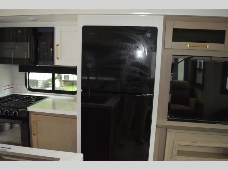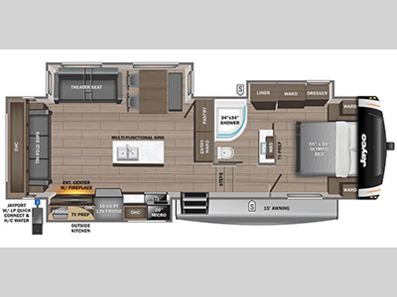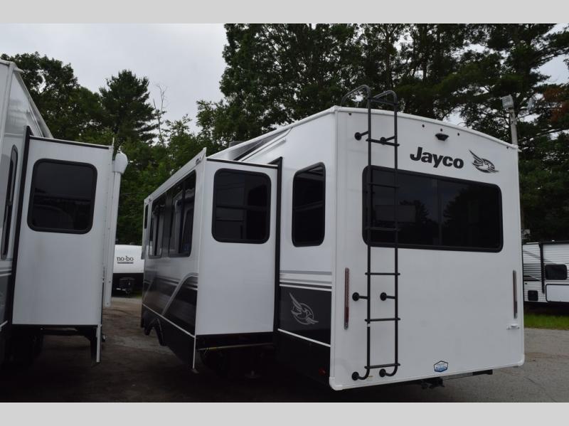 With any Eagle HT fifth wheel or travel trailer by Jayco you will enjoy a smooth drive thanks to the 4 Star Handling Package and MORryde CRE-3000 rubberized suspension. The Customer Value Package includes amenities that are sure to make camping easier than ever, like the 60K on-demand water heater, Keyed-Alike lock system, 15,000 BTU "Whisper Quiet" A/C, and more. Handcrafted door/drawer fronts will make your space feel more like home, along with residential vinyl flooring throughout, GE appliances, and blackout roller shades with reflective side throughout to keep the sun out when you want to sleep in. Each model also includes a NuVo H2O water treatment system with filters included, interior and exterior "Blue Sync" audio connect with MB Quart Sound for your TV and phone, and 100% no floor vents for added comfort and convenience!