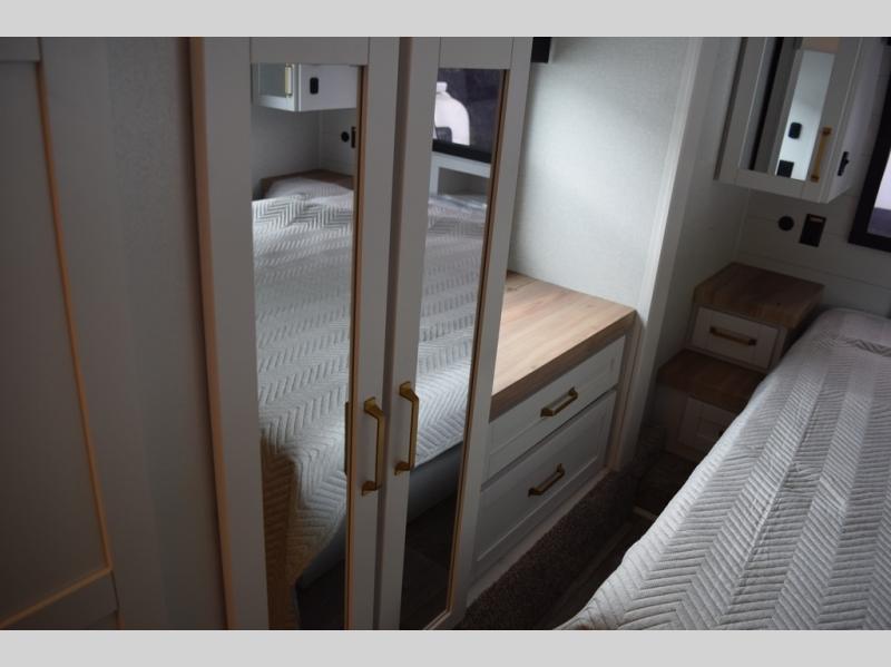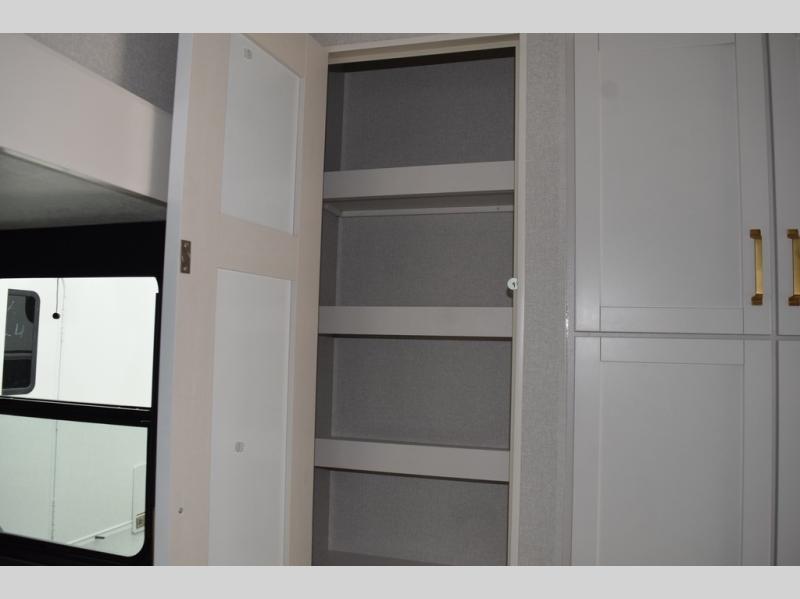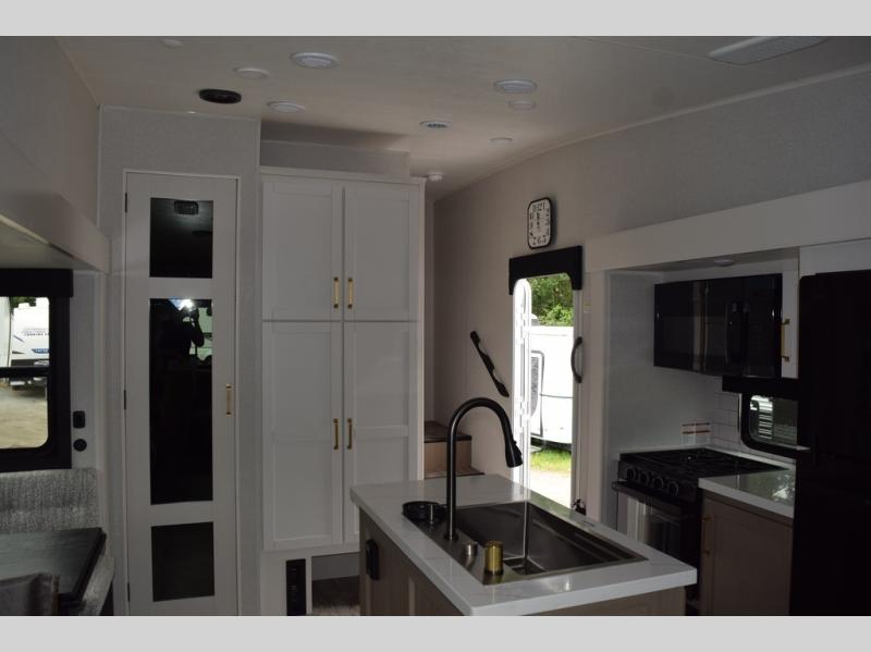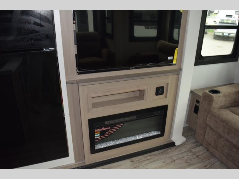 Pack your bags and head off on adventure in this spacious fifth wheel for four! The dual opposing slides in the kitchen and main living area will give your crew more space to relax. Speaking of relaxing, there is a theater seat across from the fireplace and TV plus a tri-fold sofa to make it a movie night. The free-standing table includes two chairs on one side and a bench on the other, and the kitchen island is sure to be appreciated by the chef of your group. There is also a spacious kitchen pantry and an outside kitchen if they'd rather cook outdoors. The front master bedroom includes an Olympic queen bed, dual wardrobes plus a third wardrobe within the bedroom slide out, and TV prep if you want the option to watch a show in bed!