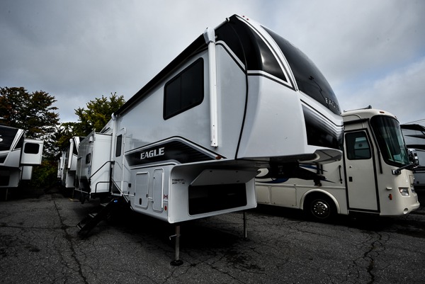 With any Eagle HT fifth wheel or travel trailer by Jayco you will enjoy a smooth drive thanks to the 4 Star Handling Package and MORryde CRE-3000 rubberized suspension. The Customer Value Package includes amenities that are sure to make camping easier than ever, like the 60K on-demand water heater, Keyed-Alike lock system, 15,000 BTU "Whisper Quiet" A/C, and more. Handcrafted door/drawer fronts will make your space feel more like home, along with residential vinyl flooring throughout, GE appliances, and blackout roller shades with reflective side throughout to keep the sun out when you want to sleep in. Each model also includes a NuVo H2O water treatment system with filters included, interior and exterior "Blue Sync" audio connect with MB Quart Sound for your TV and phone, and 100% no floor vents for added comfort and convenience!