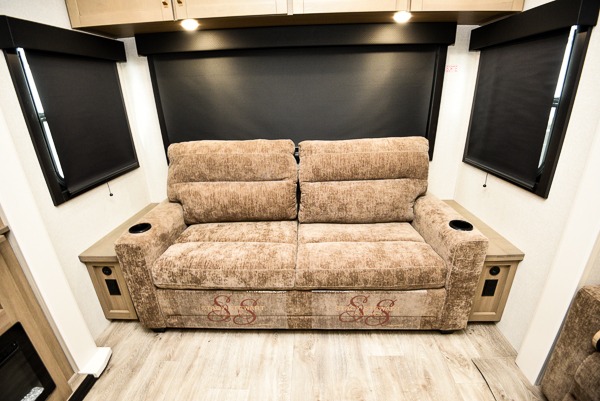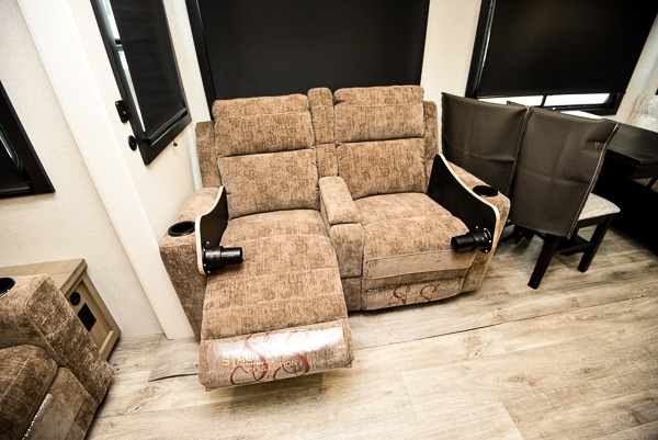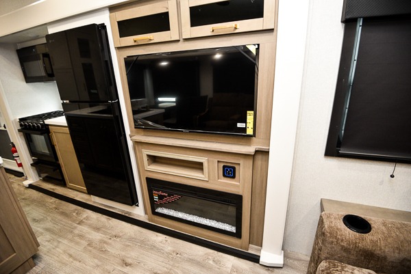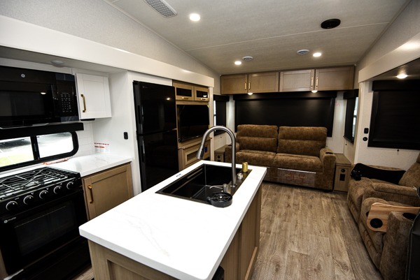 Pack your bags and head off on adventure in this spacious fifth wheel for four! The dual opposing slides in the kitchen and main living area will give your crew more space to relax. Speaking of relaxing, there is a theater seat across from the fireplace and TV plus a tri-fold sofa to make it a movie night. The free-standing table includes two chairs on one side and a bench on the other, and the kitchen island is sure to be appreciated by the chef of your group. There is also a spacious kitchen pantry and an outside kitchen if they'd rather cook outdoors. The front master bedroom includes an Olympic queen bed, dual wardrobes plus a third wardrobe within the bedroom slide out, and TV prep if you want the option to watch a show in bed!