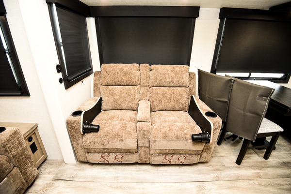 Pack your bags and head off on adventure in this spacious fifth wheel for four! The dual opposing slides in the kitchen and main living area will give your crew more space to relax. Speaking of relaxing, there is a theater seat across from the fireplace and TV plus a tri-fold sofa to make it a movie night. The free-standing table includes two chairs on one side and a bench on the other, and the kitchen island is sure to be appreciated by the chef of your group. There is also a spacious kitchen pantry and an outside kitchen if they'd rather cook outdoors. The front master bedroom includes an Olympic queen bed, dual wardrobes plus a third wardrobe within the bedroom slide out, and TV prep if you want the option to watch a show in bed!