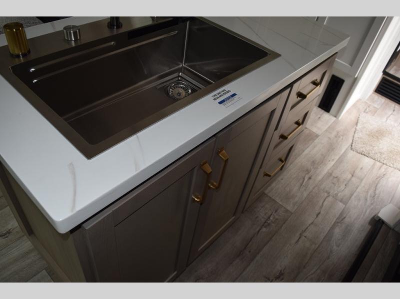 Pack your bags and head off on adventure in this spacious fifth wheel for four! The dual opposing slides in the kitchen and main living area will give your crew more space to relax. Speaking of relaxing, there is a theater seat across from the fireplace and TV plus a tri-fold sofa to make it a movie night. The free-standing table includes two chairs on one side and a bench on the other, and the kitchen island is sure to be appreciated by the chef of your group. There is also a spacious kitchen pantry and an outside kitchen if they'd rather cook outdoors. The front master bedroom includes an Olympic queen bed, dual wardrobes plus a third wardrobe within the bedroom slide out, and TV prep if you want the option to watch a show in bed!