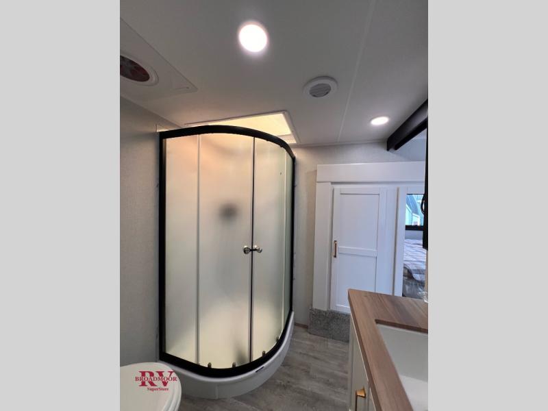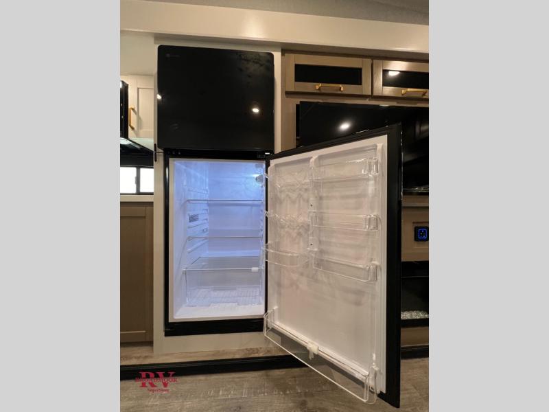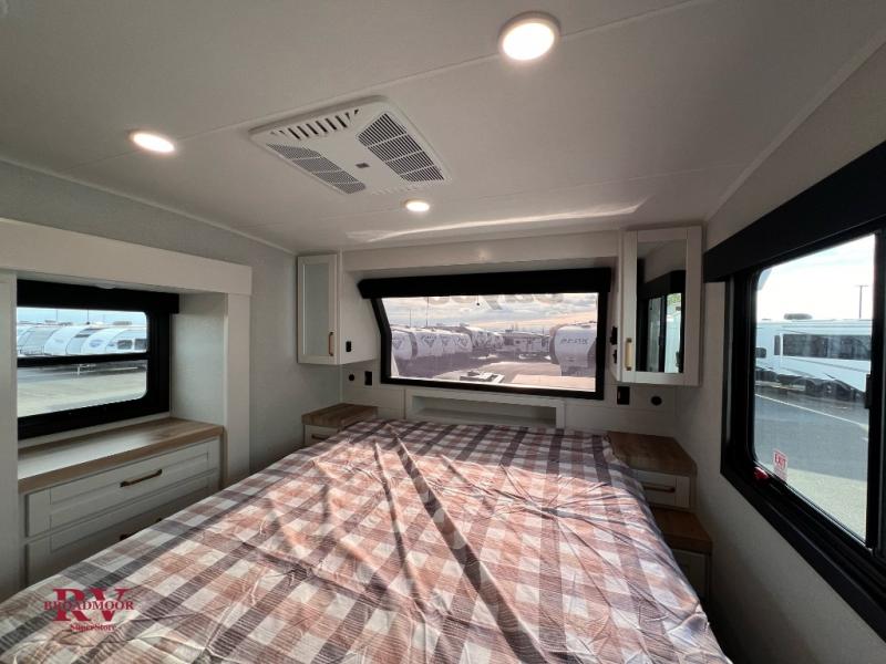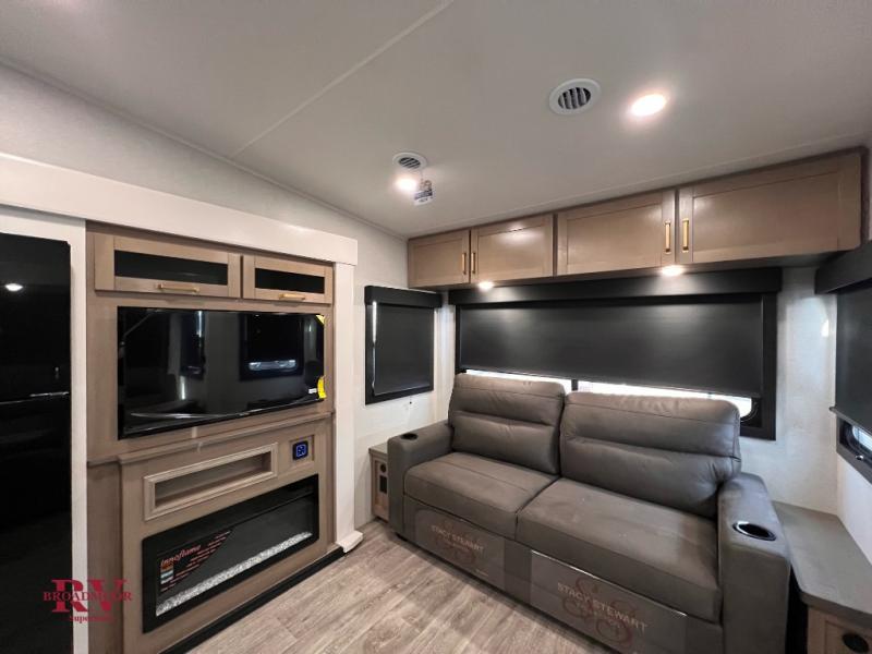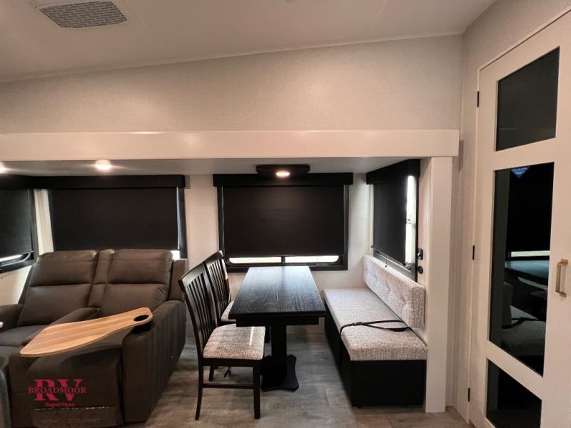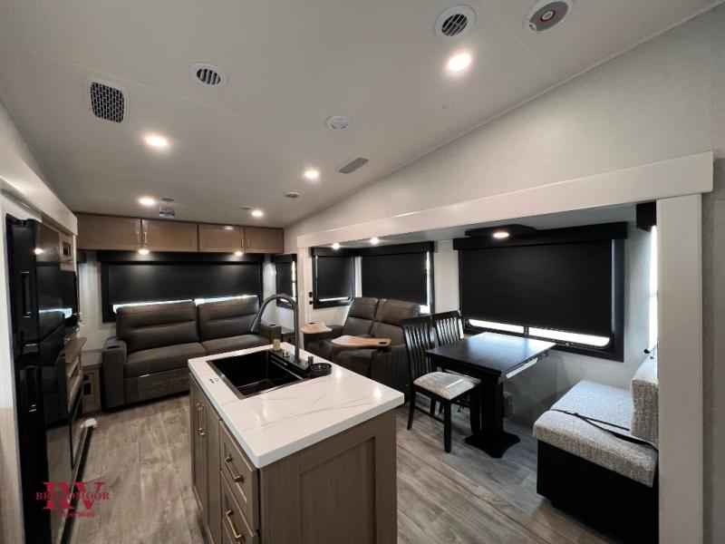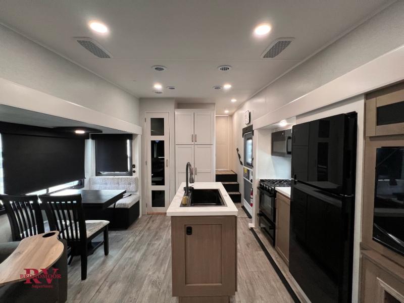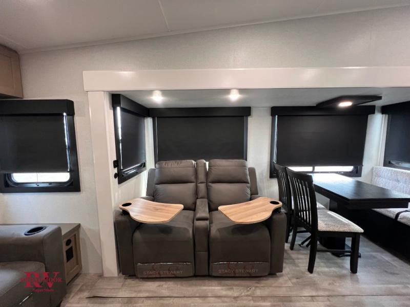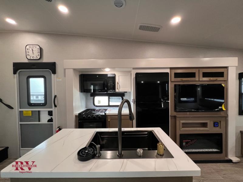 Pack your bags and head off on adventure in this spacious fifth wheel for four! The dual opposing slides in the kitchen and main living area will give your crew more space to relax. Speaking of relaxing, there is a theater seat across from the fireplace and TV plus a tri-fold sofa to make it a movie night. The free-standing table includes two chairs on one side and a bench on the other, and the kitchen island is sure to be appreciated by the chef of your group. There is also a spacious kitchen pantry and an outside kitchen if they'd rather cook outdoors. The front master bedroom includes an Olympic queen bed, dual wardrobes plus a third wardrobe within the bedroom slide out, and TV prep if you want the option to watch a show in bed!