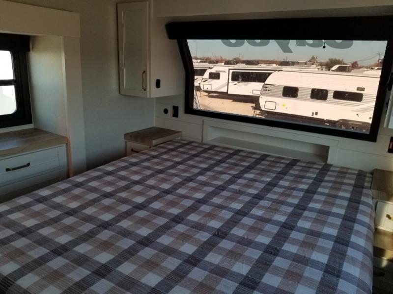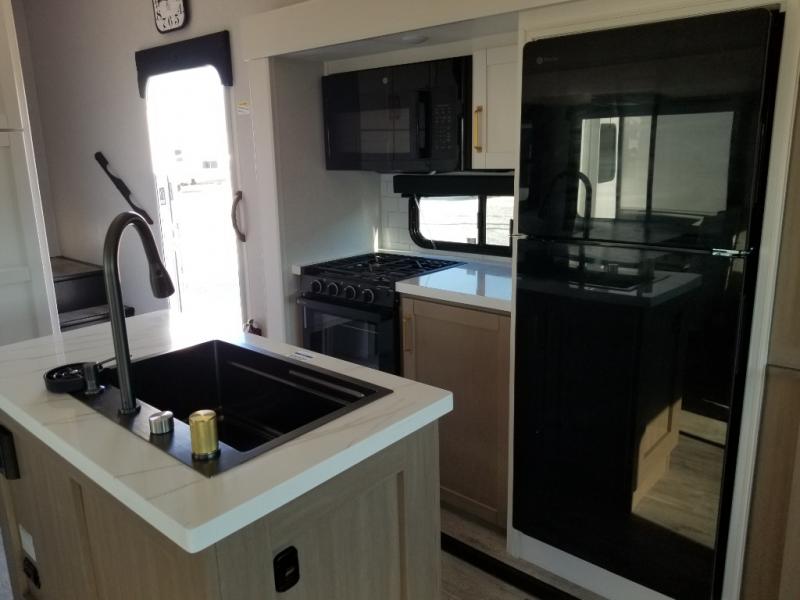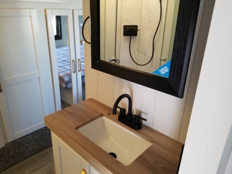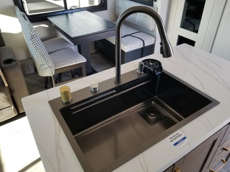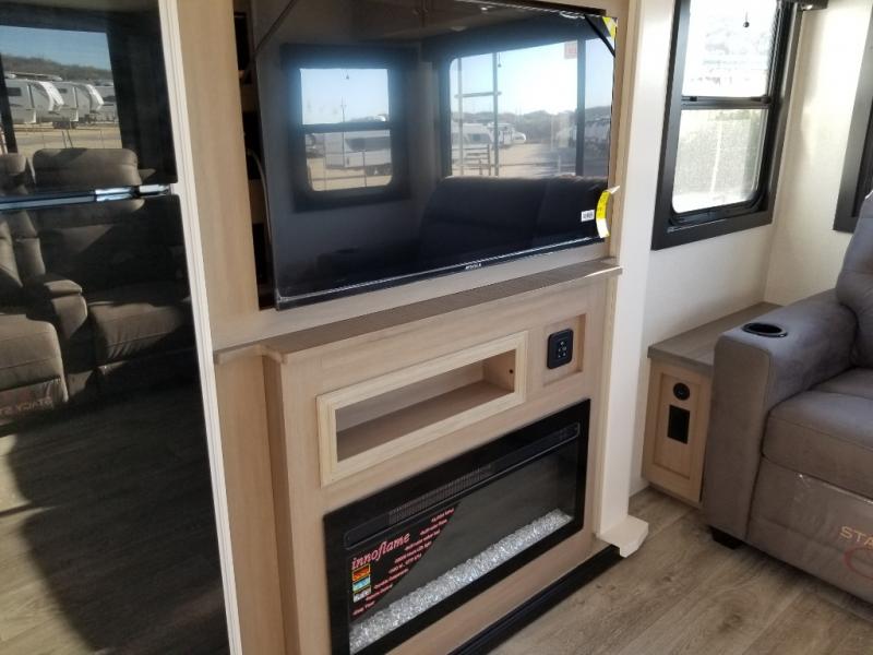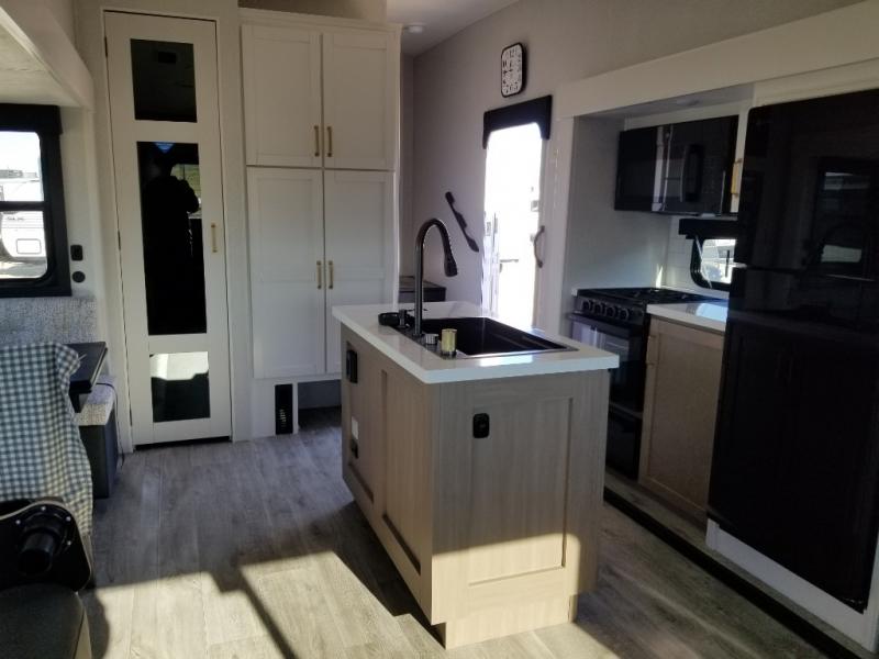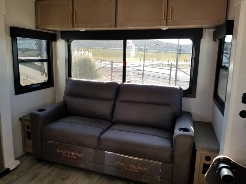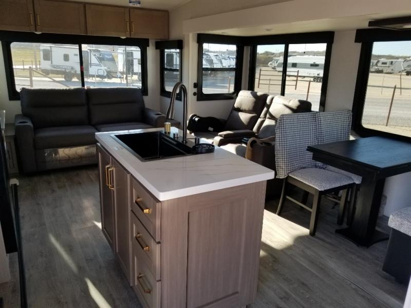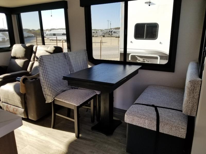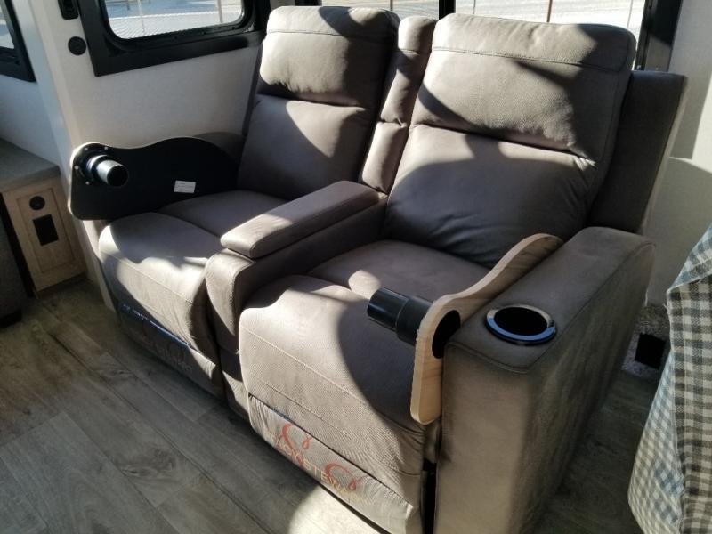 Pack your bags and head off on adventure in this spacious fifth wheel for four! The dual opposing slides in the kitchen and main living area will give your crew more space to relax. Speaking of relaxing, there is a theater seat across from the fireplace and TV plus a tri-fold sofa to make it a movie night. The free-standing table includes two chairs on one side and a bench on the other, and the kitchen island is sure to be appreciated by the chef of your group. There is also a spacious kitchen pantry and an outside kitchen if they'd rather cook outdoors. The front master bedroom includes an Olympic queen bed, dual wardrobes plus a third wardrobe within the bedroom slide out, and TV prep if you want the option to watch a show in bed!