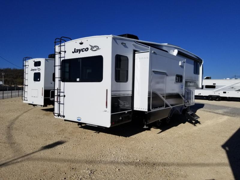 With any Eagle HT fifth wheel or travel trailer by Jayco you will enjoy a smooth drive thanks to the 4 Star Handling Package and MORryde CRE-3000 rubberized suspension. The Customer Value Package includes amenities that are sure to make camping easier than ever, like the 60K on-demand water heater, Keyed-Alike lock system, 15,000 BTU "Whisper Quiet" A/C, and more. Handcrafted door/drawer fronts will make your space feel more like home, along with residential vinyl flooring throughout, GE appliances, and blackout roller shades with reflective side throughout to keep the sun out when you want to sleep in. Each model also includes a NuVo H2O water treatment system with filters included, interior and exterior "Blue Sync" audio connect with MB Quart Sound for your TV and phone, and 100% no floor vents for added comfort and convenience!