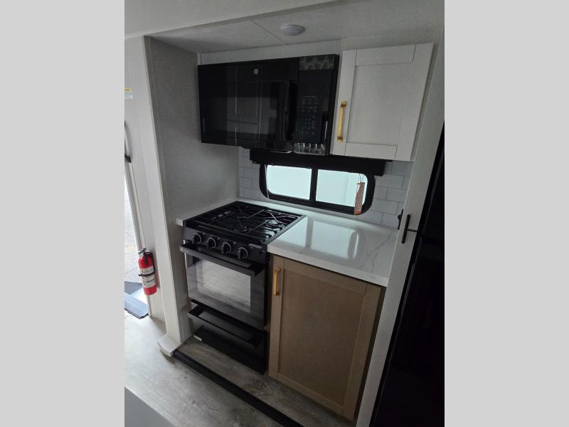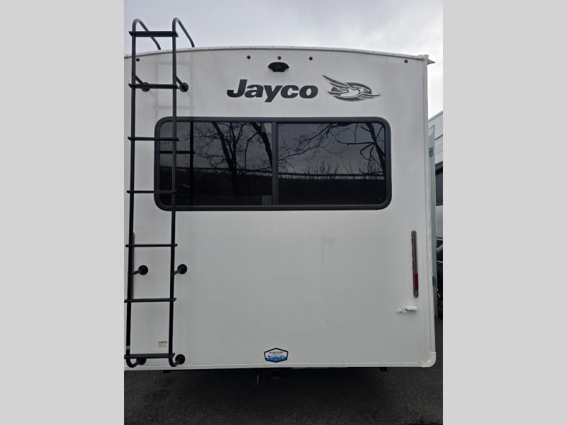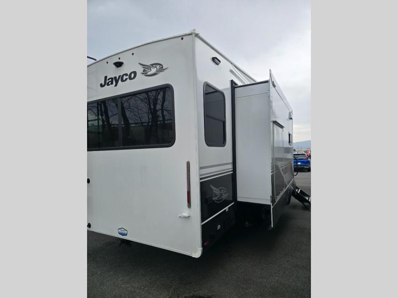 With any Eagle HT fifth wheel or travel trailer by Jayco you will enjoy a smooth drive thanks to the 4 Star Handling Package and MORryde CRE-3000 rubberized suspension. The Customer Value Package includes amenities that are sure to make camping easier than ever, like the 60K on-demand water heater, Keyed-Alike lock system, 15,000 BTU "Whisper Quiet" A/C, and more. Handcrafted door/drawer fronts will make your space feel more like home, along with residential vinyl flooring throughout, GE appliances, and blackout roller shades with reflective side throughout to keep the sun out when you want to sleep in. Each model also includes a NuVo H2O water treatment system with filters included, interior and exterior "Blue Sync" audio connect with MB Quart Sound for your TV and phone, and 100% no floor vents for added comfort and convenience!