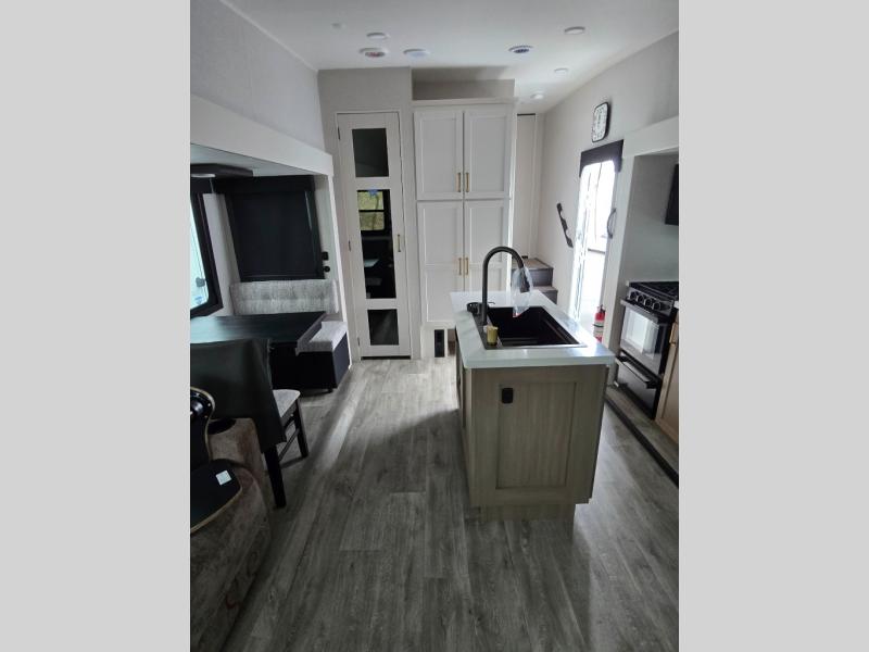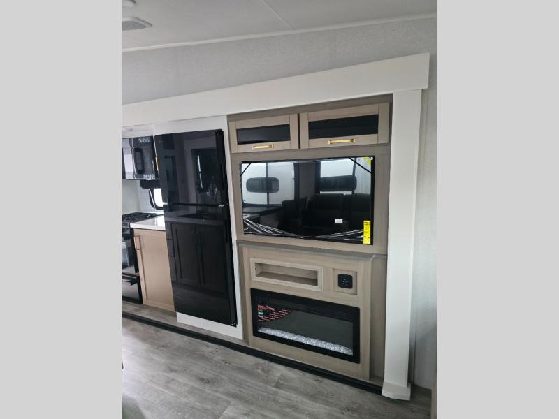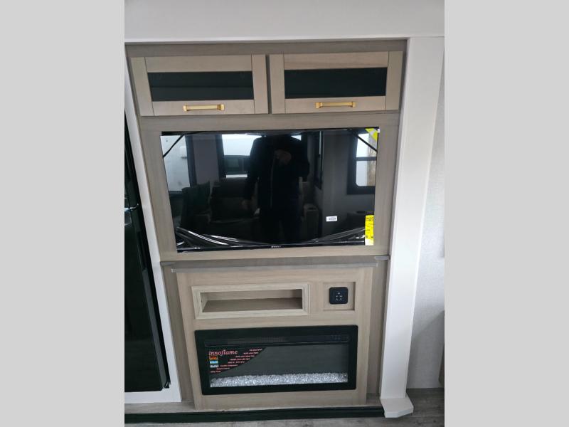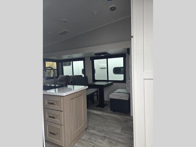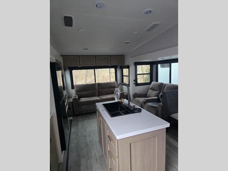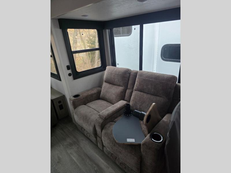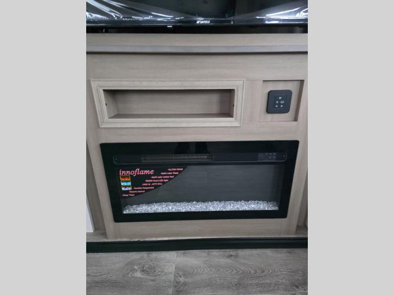 Pack your bags and head off on adventure in this spacious fifth wheel for four! The dual opposing slides in the kitchen and main living area will give your crew more space to relax. Speaking of relaxing, there is a theater seat across from the fireplace and TV plus a tri-fold sofa to make it a movie night. The free-standing table includes two chairs on one side and a bench on the other, and the kitchen island is sure to be appreciated by the chef of your group. There is also a spacious kitchen pantry and an outside kitchen if they'd rather cook outdoors. The front master bedroom includes an Olympic queen bed, dual wardrobes plus a third wardrobe within the bedroom slide out, and TV prep if you want the option to watch a show in bed!