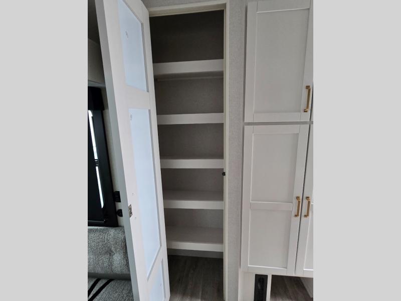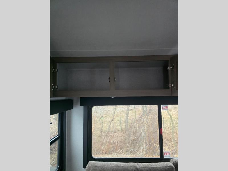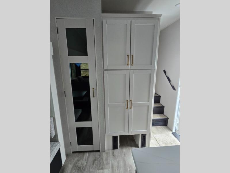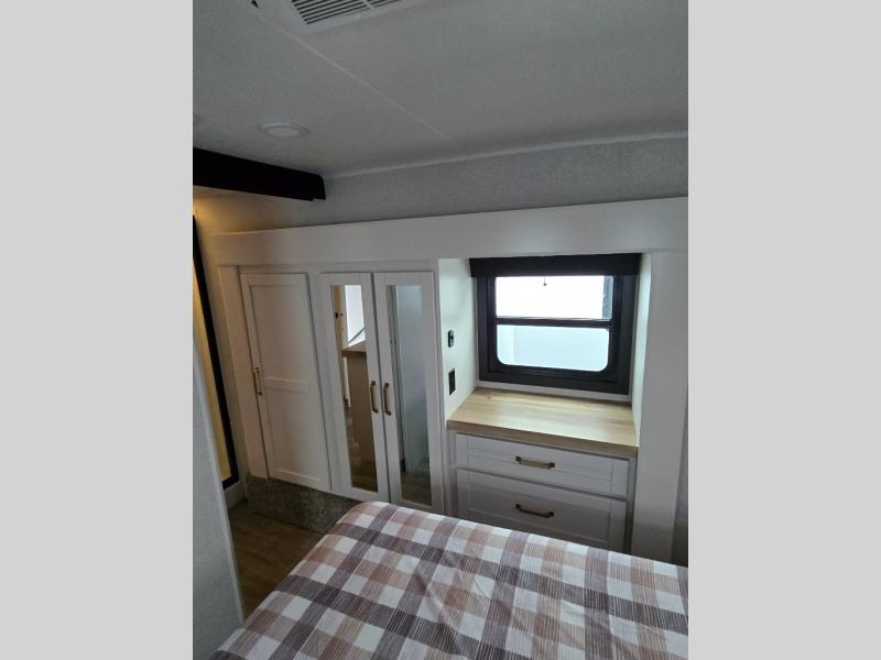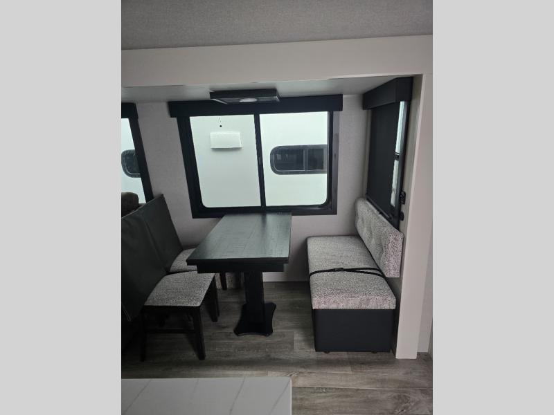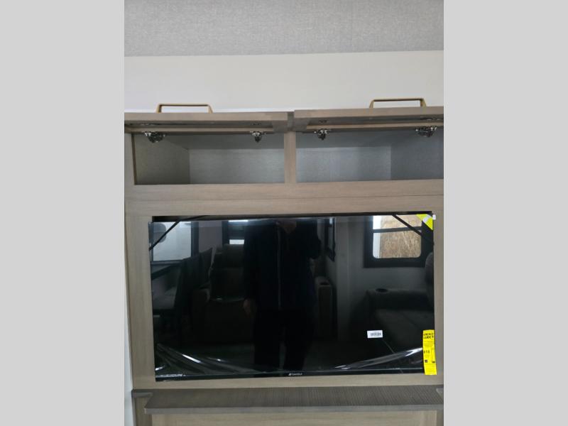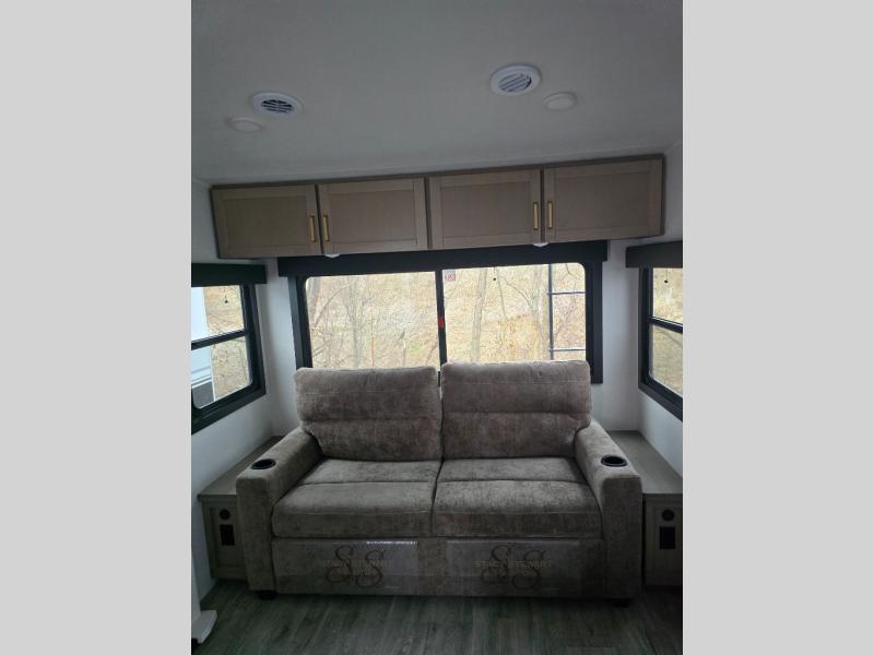Pack your bags and head off on adventure in this spacious fifth wheel for four! The dual opposing slides in the kitchen and main living area will give your crew more space to relax. Speaking of relaxing, there is a theater seat across from the fireplace and TV plus a tri-fold sofa to make it a movie night. The free-standing table includes two chairs on one side and a bench on the other, and the kitchen island is sure to be appreciated by the chef of your group. There is also a spacious kitchen pantry and an outside kitchen if they'd rather cook outdoors. The front master bedroom includes an Olympic queen bed, dual wardrobes plus a third wardrobe within the bedroom slide out, and TV prep if you want the option to watch a show in bed!