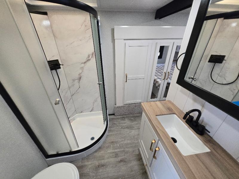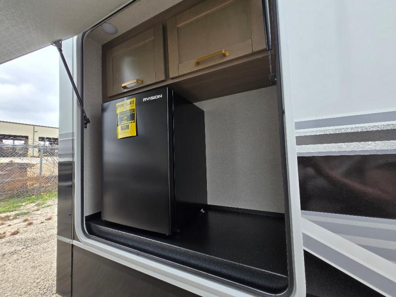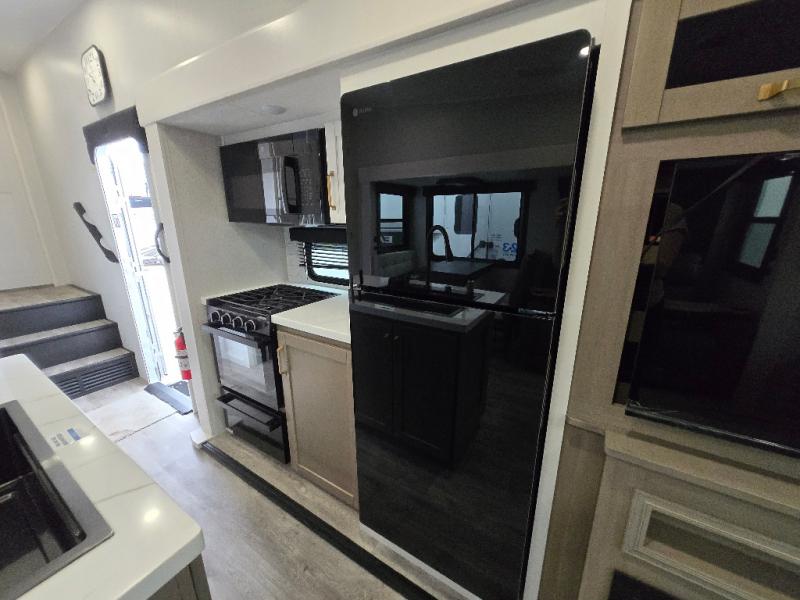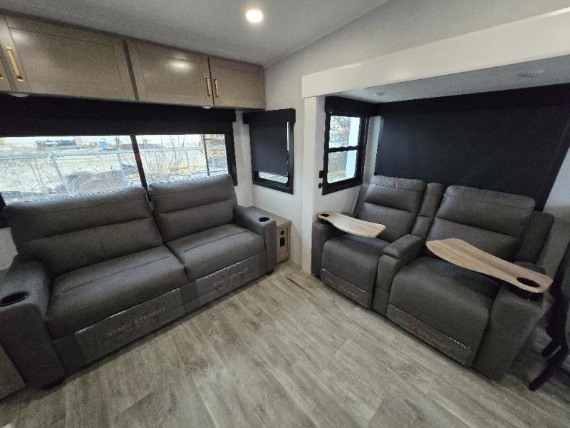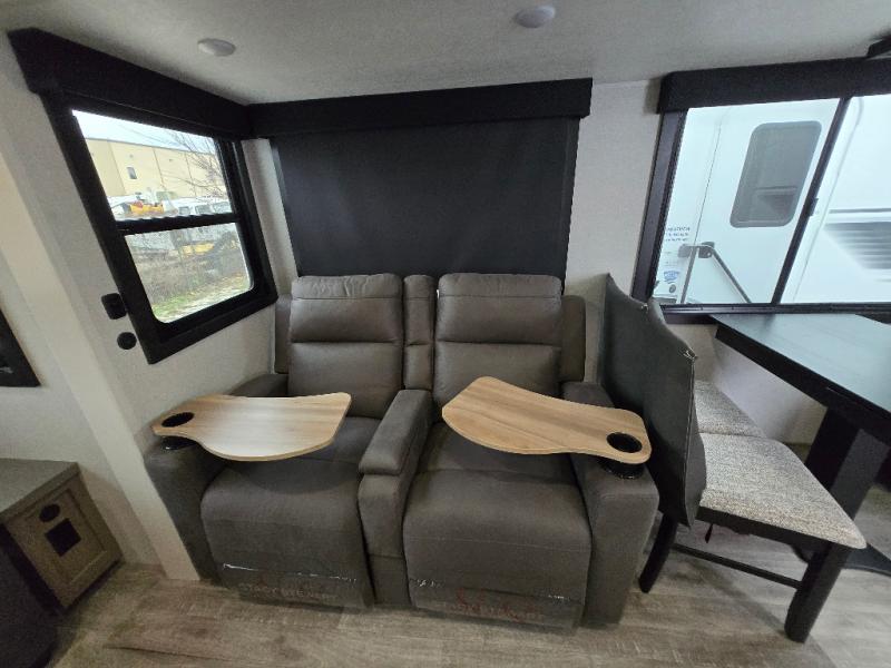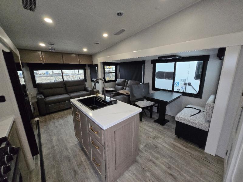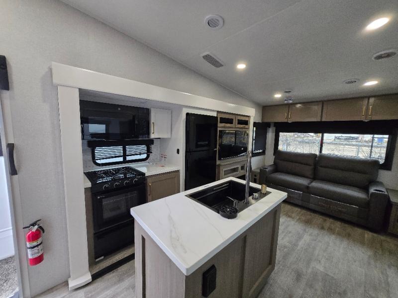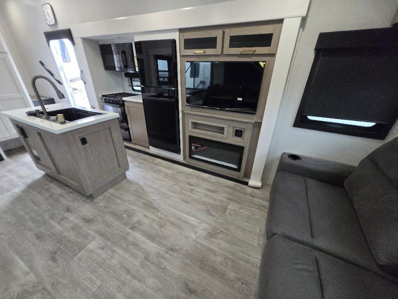 Pack your bags and head off on adventure in this spacious fifth wheel for four! The dual opposing slides in the kitchen and main living area will give your crew more space to relax. Speaking of relaxing, there is a theater seat across from the fireplace and TV plus a tri-fold sofa to make it a movie night. The free-standing table includes two chairs on one side and a bench on the other, and the kitchen island is sure to be appreciated by the chef of your group. There is also a spacious kitchen pantry and an outside kitchen if they'd rather cook outdoors. The front master bedroom includes an Olympic queen bed, dual wardrobes plus a third wardrobe within the bedroom slide out, and TV prep if you want the option to watch a show in bed!