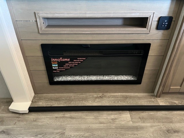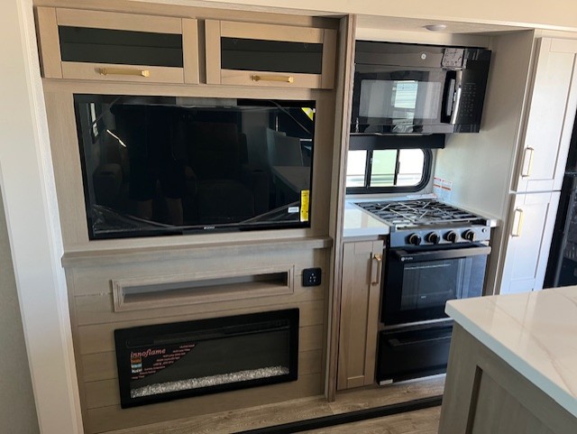 You will feel right at home camping in this travel trailer! It features a front private bedroom with an Olympic queen bed slide for more interior space, a dresser, a front wardrobe to hang your clothes, and a wardrobe that is prepped to add an optional washer and dryer. Start each morning getting squeaky clean in the full bathroom with the shower and then head to the kitchen to fry up some eggs on the stainless steel range. The kitchen island with a multi-functional sink will help make meal prepping easier too, plus there is a hutch to store your dishes. Enjoy a relaxing evening by the fireplace and watch your favorite movie with the entertainment center while sitting on either the rear tri-fold sofa or the theater seating!