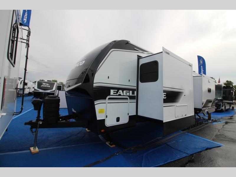 With any Eagle HT fifth wheel or travel trailer by Jayco you will enjoy a smooth drive thanks to the 4 Star Handling Package, Goodyear Endurance tires, and MORryde CRE-3000 rubberized suspension. The Customer Value Package includes amenities that are sure to make camping easier than ever, like the 60K on-demand water heater, Keyed-Alike lock system, 15,000 BTU "Whisper Quiet" A/C, and more. Handcrafted and glazed door/drawer fronts will make your space feel more like home, along with residential vinyl flooring throughout, GE appliances, and blackout roller shades with reflective side throughout to keep the sun out when you want to sleep in. Each model also includes a NuVo H2O water treatment system with filters included, interior and exterior "Blue Sync" audio connect with MB Quart Sound for your TV and phone, and 100% no floor vents for added comfort and convenience!