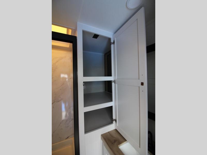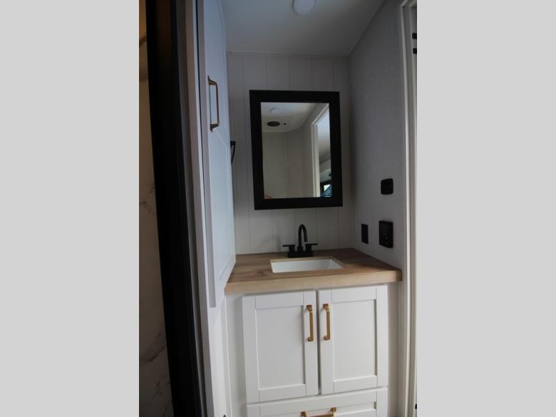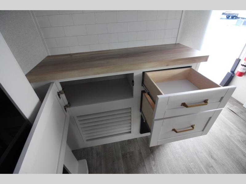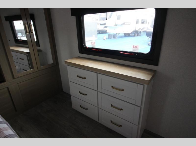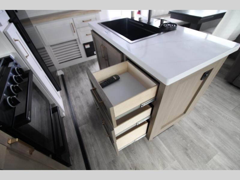 You will feel right at home camping in this travel trailer! It features a front private bedroom with an Olympic queen bed slide for more interior space, a dresser, a front wardrobe to hang your clothes, and a wardrobe that is prepped to add an optional washer and dryer. Start each morning getting squeaky clean in the full bathroom with the shower and then head to the kitchen to fry up some eggs on the stainless steel range. The kitchen island with a multi-functional sink will help make meal prepping easier too, plus there is a hutch to store your dishes. Enjoy a relaxing evening by the fireplace and watch your favorite movie with the entertainment center while sitting on either the rear tri-fold sofa or the theater seating!