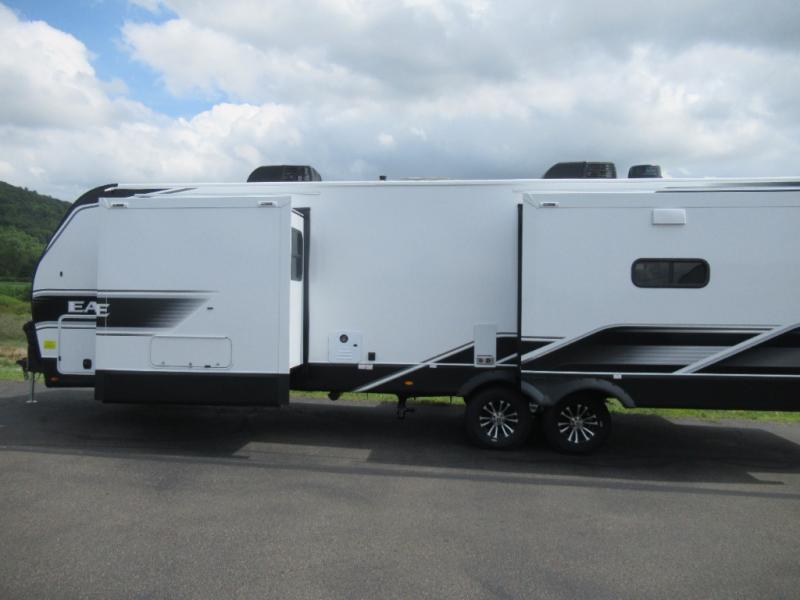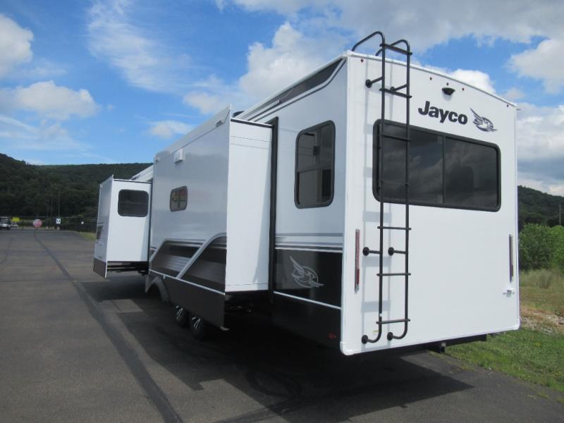 With any Eagle HT fifth wheel or travel trailer by Jayco you will enjoy a smooth drive thanks to the 4 Star Handling Package and MORryde CRE-3000 rubberized suspension. The Customer Value Package includes amenities that are sure to make camping easier than ever, like the 60K on-demand water heater, Keyed-Alike lock system, 15,000 BTU "Whisper Quiet" A/C, and more. Handcrafted door/drawer fronts will make your space feel more like home, along with residential vinyl flooring throughout, GE appliances, and blackout roller shades with reflective side throughout to keep the sun out when you want to sleep in. Each model also includes a NuVo H2O water treatment system with filters included, interior and exterior "Blue Sync" audio connect with MB Quart Sound for your TV and phone, and 100% no floor vents for added comfort and convenience!