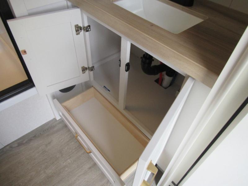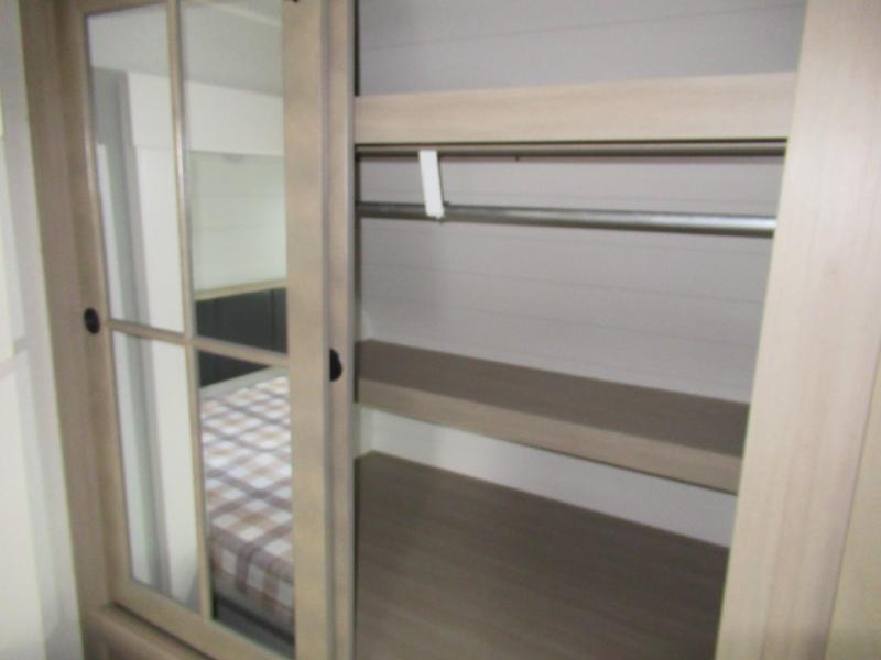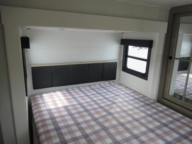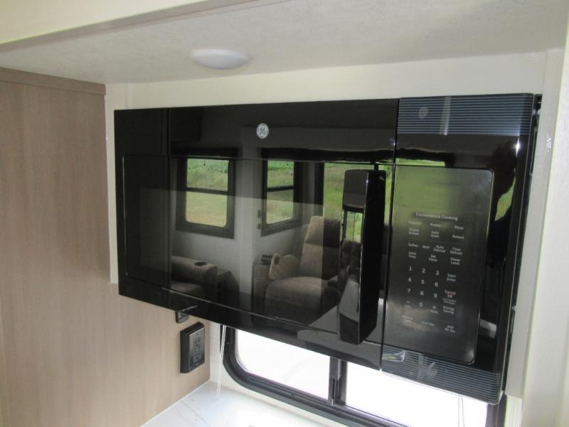 You will feel right at home camping in this travel trailer! It features a front private bedroom with an Olympic queen bed slide for more interior space, a dresser, a front wardrobe to hang your clothes, and a wardrobe that is prepped to add an optional washer and dryer. Start each morning getting squeaky clean in the full bathroom with the shower and then head to the kitchen to fry up some eggs on the stainless steel range. The kitchen island with a multi-functional sink will help make meal prepping easier too, plus there is a hutch to store your dishes. Enjoy a relaxing evening by the fireplace and watch your favorite movie with the entertainment center while sitting on either the rear tri-fold sofa or the theater seating!