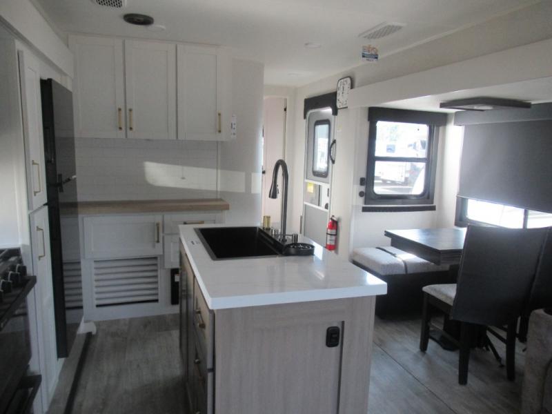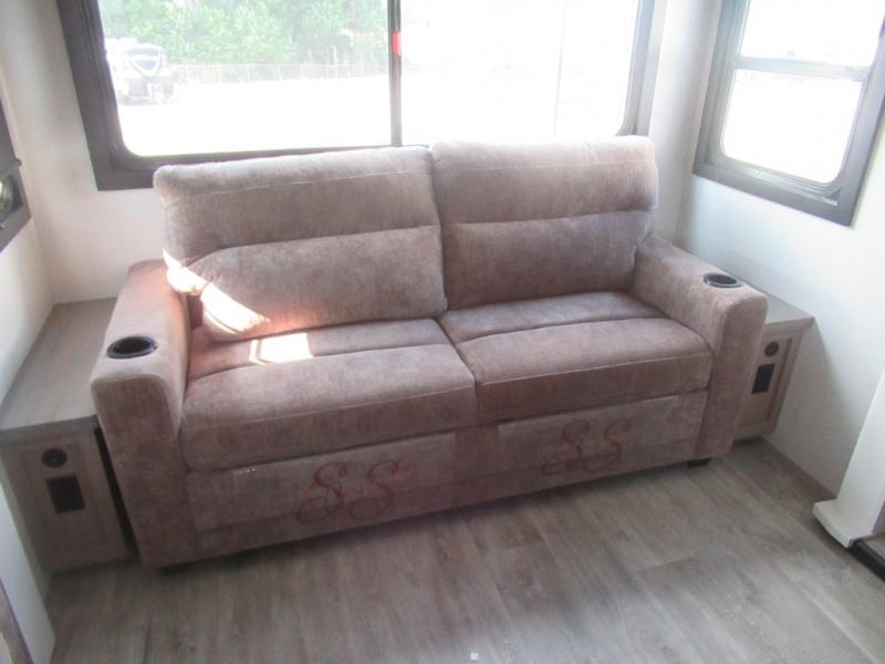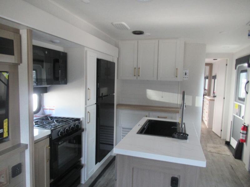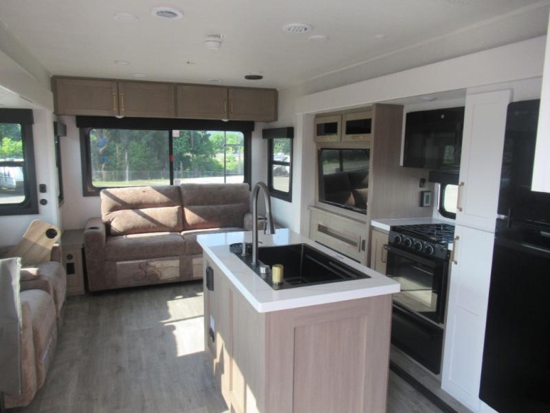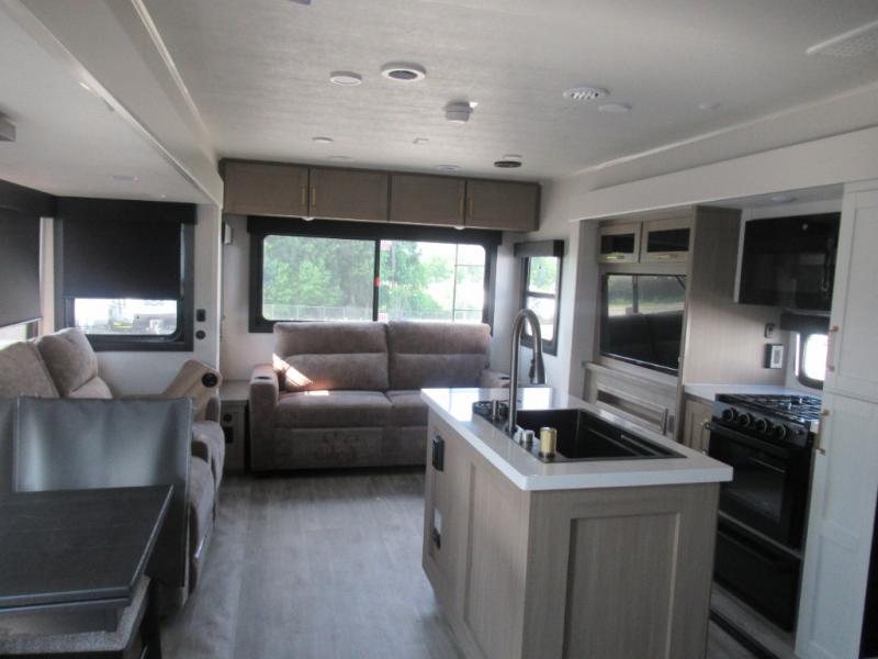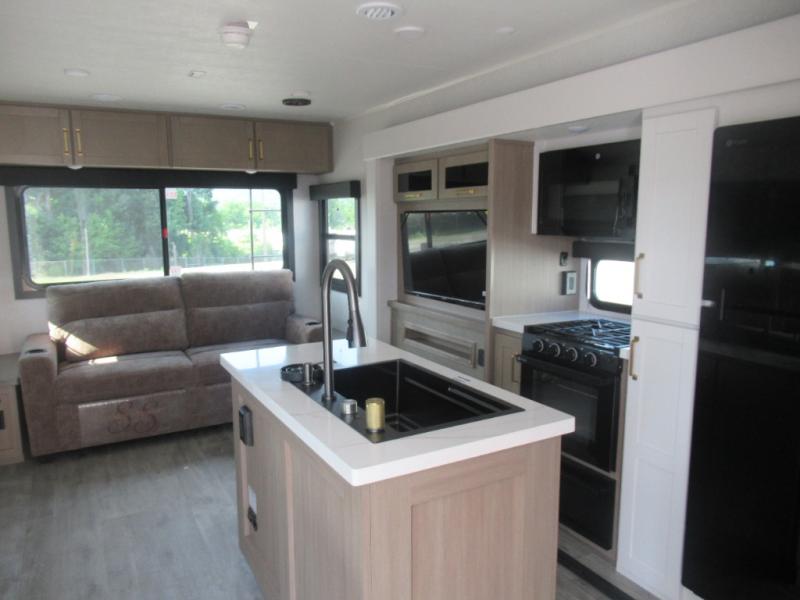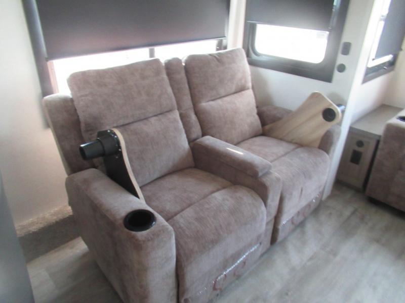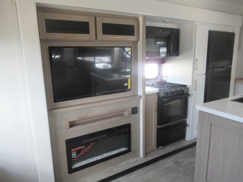 You will feel right at home camping in this travel trailer! It features a front private bedroom with an Olympic queen bed slide for more interior space, a dresser, a front wardrobe to hang your clothes, and a wardrobe that is prepped to add an optional washer and dryer. Start each morning getting squeaky clean in the full bathroom with the shower and then head to the kitchen to fry up some eggs on the stainless steel range. The kitchen island with a multi-functional sink will help make meal prepping easier too, plus there is a hutch to store your dishes. Enjoy a relaxing evening by the fireplace and watch your favorite movie with the entertainment center while sitting on either the rear tri-fold sofa or the theater seating!