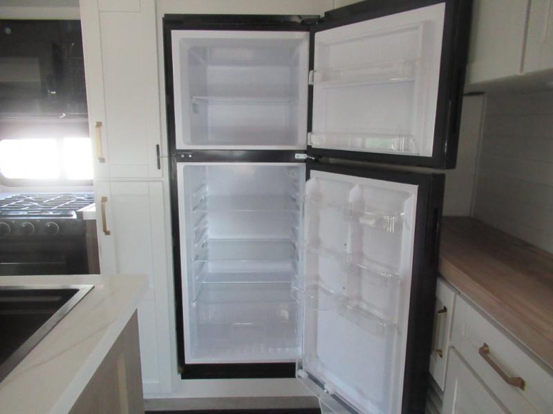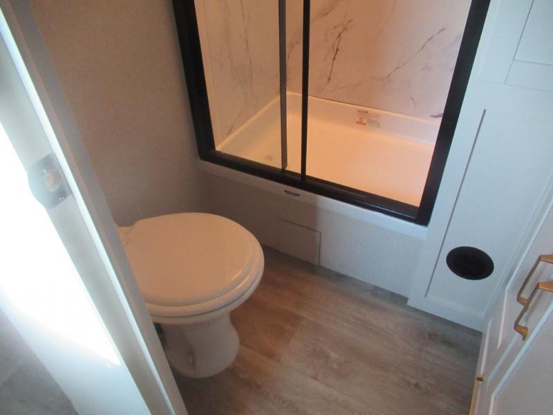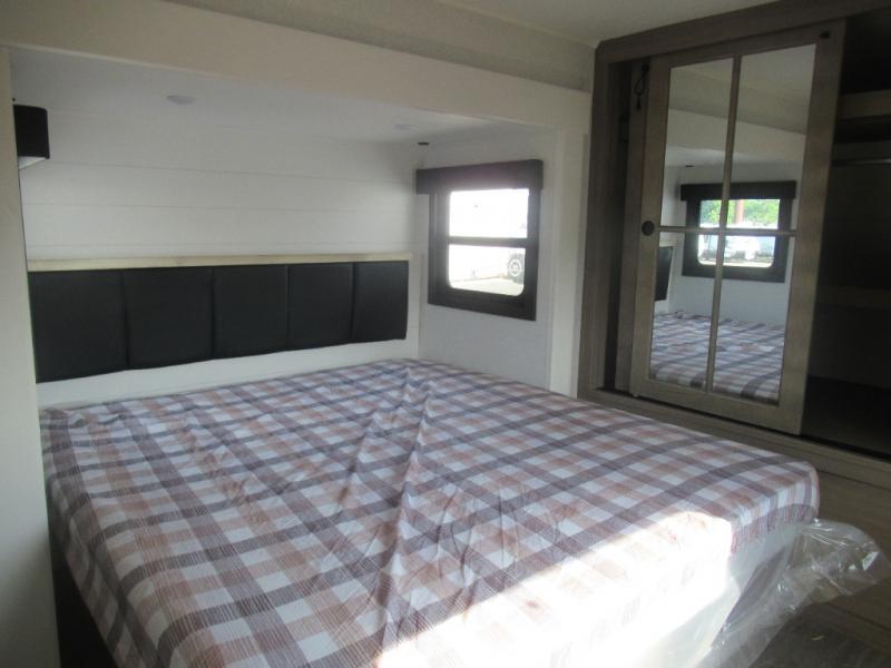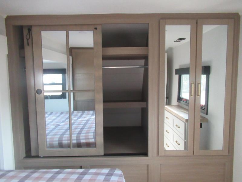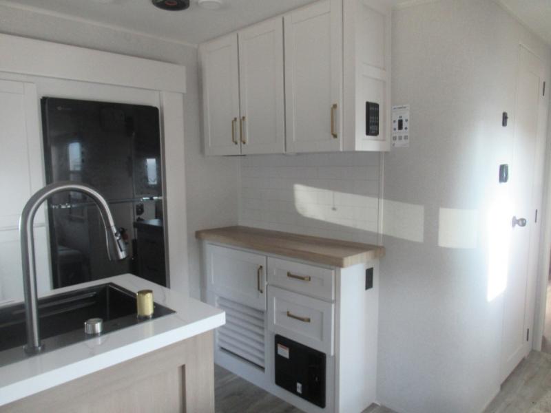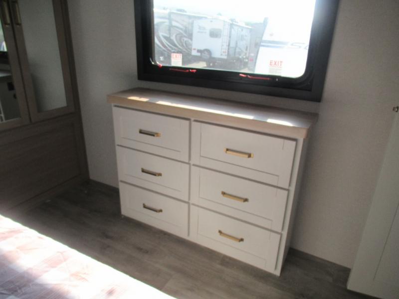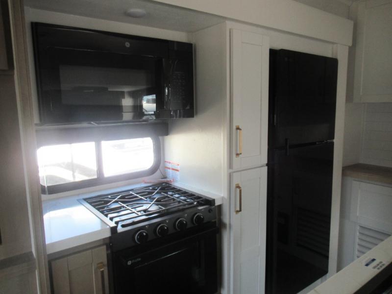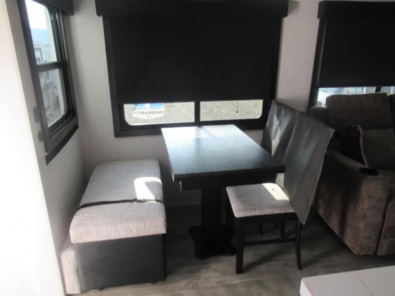 You will feel right at home camping in this travel trailer! It features a front private bedroom with an Olympic queen bed slide for more interior space, a dresser, a front wardrobe to hang your clothes, and a wardrobe that is prepped to add an optional washer and dryer. Start each morning getting squeaky clean in the full bathroom with the shower and then head to the kitchen to fry up some eggs on the stainless steel range. The kitchen island with a multi-functional sink will help make meal prepping easier too, plus there is a hutch to store your dishes. Enjoy a relaxing evening by the fireplace and watch your favorite movie with the entertainment center while sitting on either the rear tri-fold sofa or the theater seating!