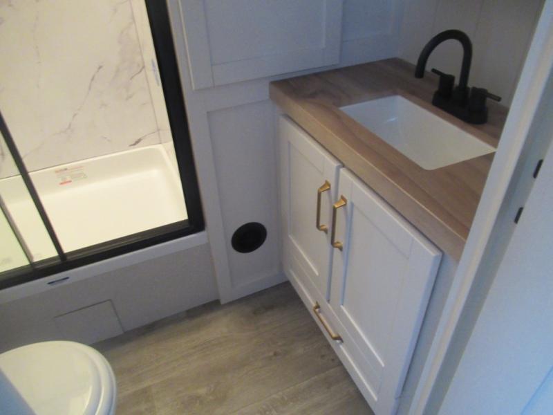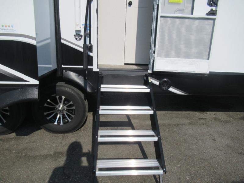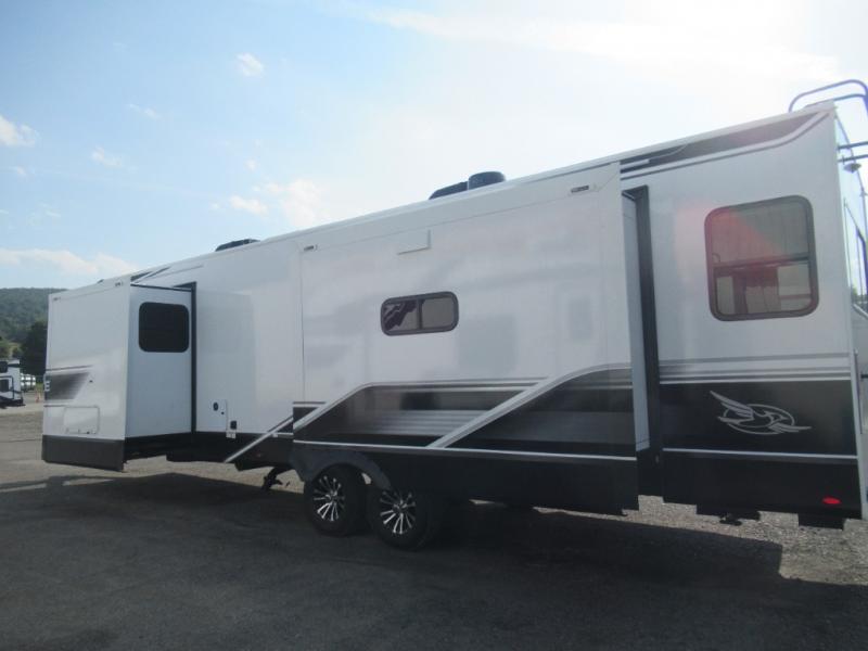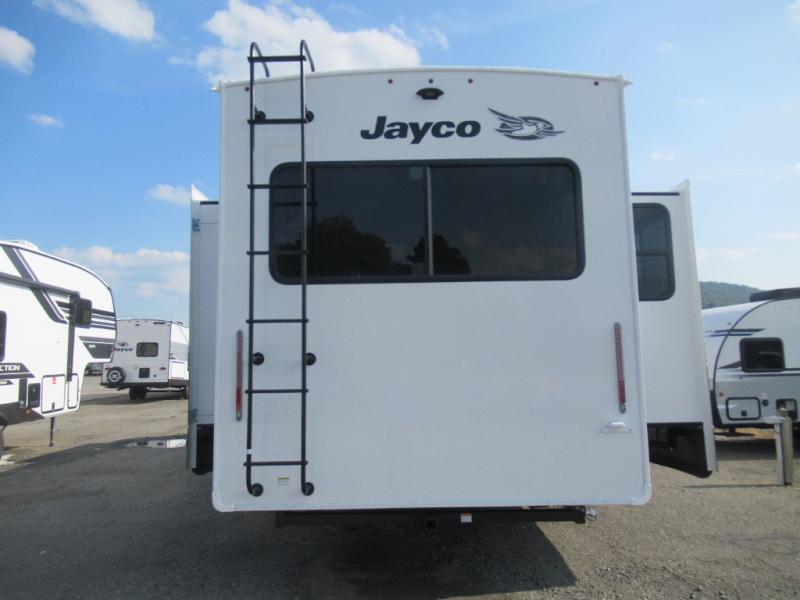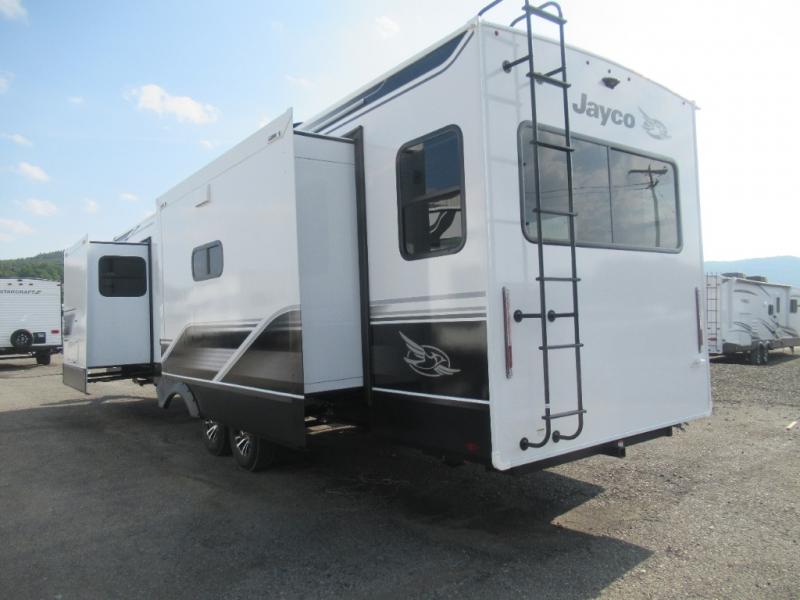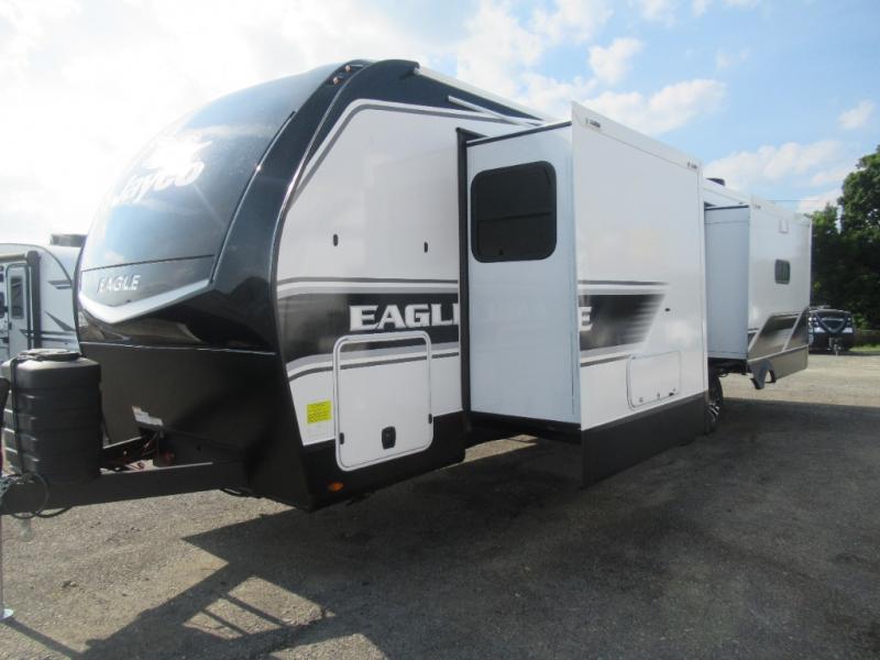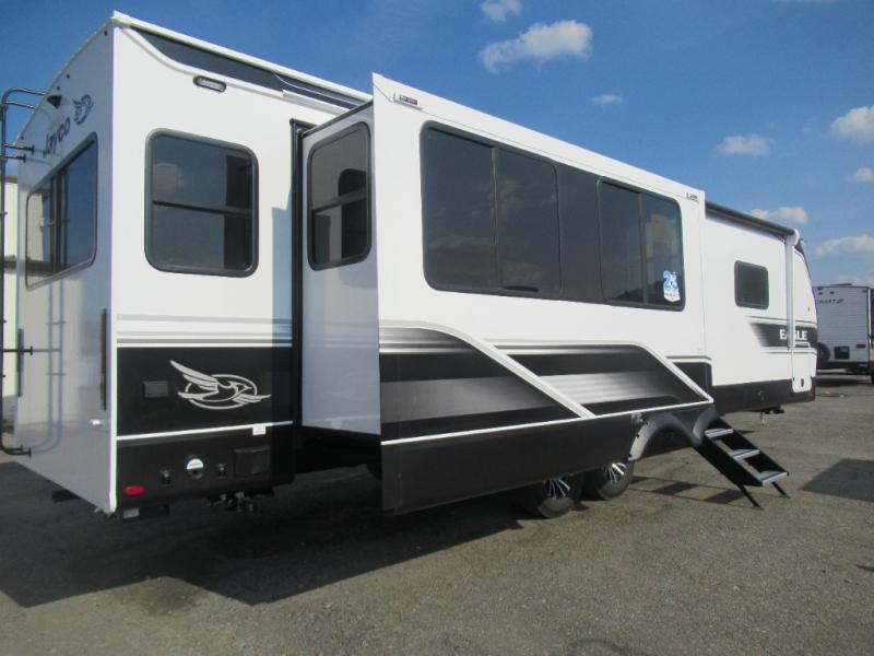 With any Eagle HT fifth wheel or travel trailer by Jayco you will enjoy a smooth drive thanks to the 4 Star Handling Package and MORryde CRE-3000 rubberized suspension. The Customer Value Package includes amenities that are sure to make camping easier than ever, like the 60K on-demand water heater, Keyed-Alike lock system, 15,000 BTU "Whisper Quiet" A/C, and more. Handcrafted door/drawer fronts will make your space feel more like home, along with residential vinyl flooring throughout, GE appliances, and blackout roller shades with reflective side throughout to keep the sun out when you want to sleep in. Each model also includes a NuVo H2O water treatment system with filters included, interior and exterior "Blue Sync" audio connect with MB Quart Sound for your TV and phone, and 100% no floor vents for added comfort and convenience!