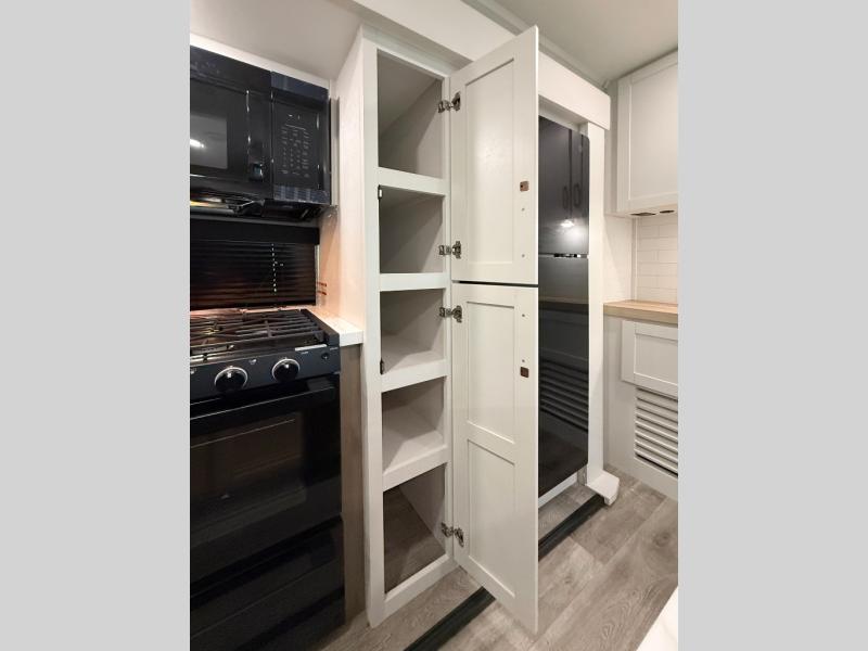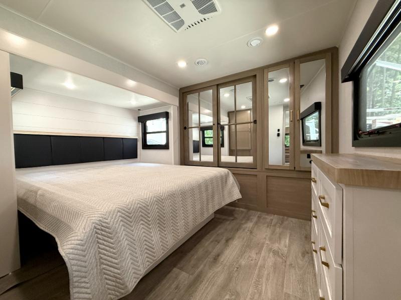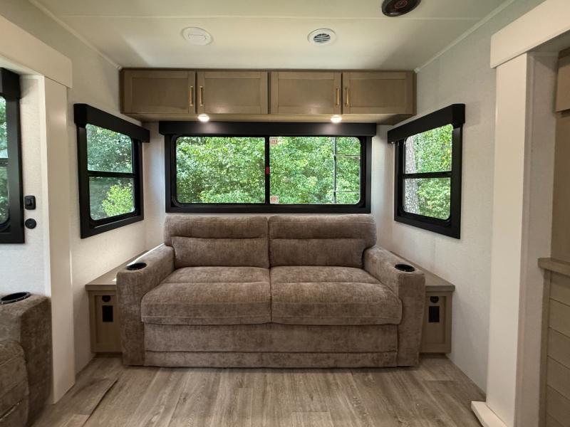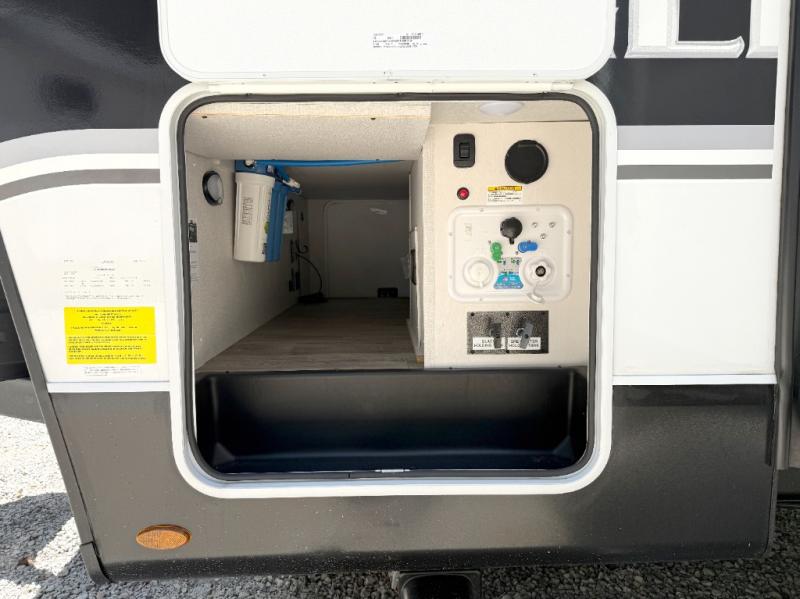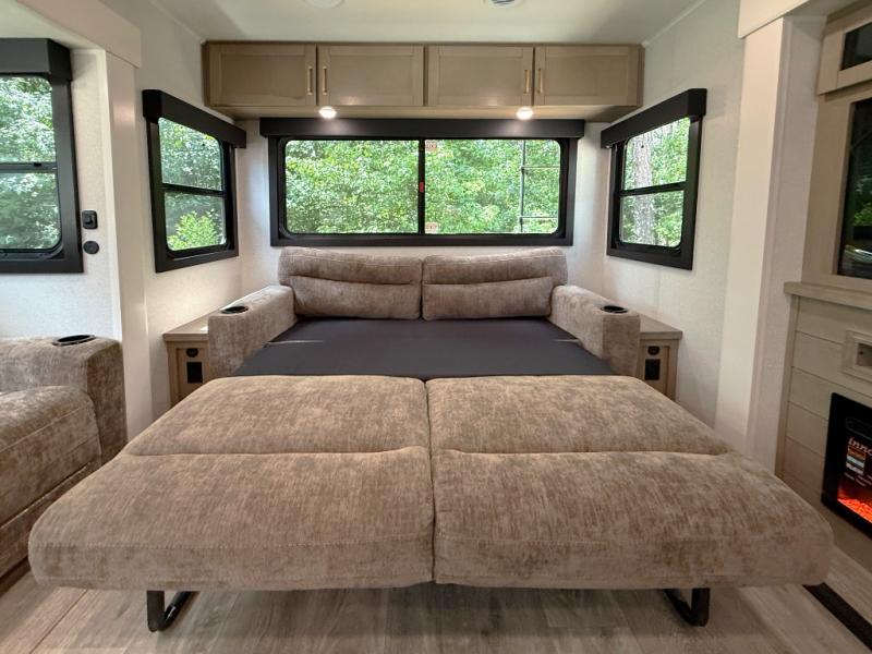 You will feel right at home camping in this travel trailer! It features a front private bedroom with an Olympic queen bed slide for more interior space, a dresser, a front wardrobe to hang your clothes, and a wardrobe that is prepped to add an optional washer and dryer. Start each morning getting squeaky clean in the full bathroom with the shower and then head to the kitchen to fry up some eggs on the stainless steel range. The kitchen island with a multi-functional sink will help make meal prepping easier too, plus there is a hutch to store your dishes. Enjoy a relaxing evening by the fireplace and watch your favorite movie with the entertainment center while sitting on either the rear tri-fold sofa or the theater seating!