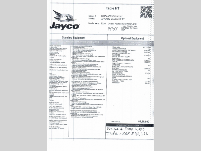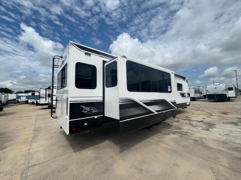 With any Eagle HT fifth wheel or travel trailer by Jayco you will enjoy a smooth drive thanks to the 4 Star Handling Package and MORryde CRE-3000 rubberized suspension. The Customer Value Package includes amenities that are sure to make camping easier than ever, like the 60K on-demand water heater, Keyed-Alike lock system, 15,000 BTU "Whisper Quiet" A/C, and more. Handcrafted door/drawer fronts will make your space feel more like home, along with residential vinyl flooring throughout, GE appliances, and blackout roller shades with reflective side throughout to keep the sun out when you want to sleep in. Each model also includes a NuVo H2O water treatment system with filters included, interior and exterior "Blue Sync" audio connect with MB Quart Sound for your TV and phone, and 100% no floor vents for added comfort and convenience!