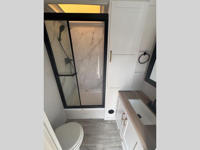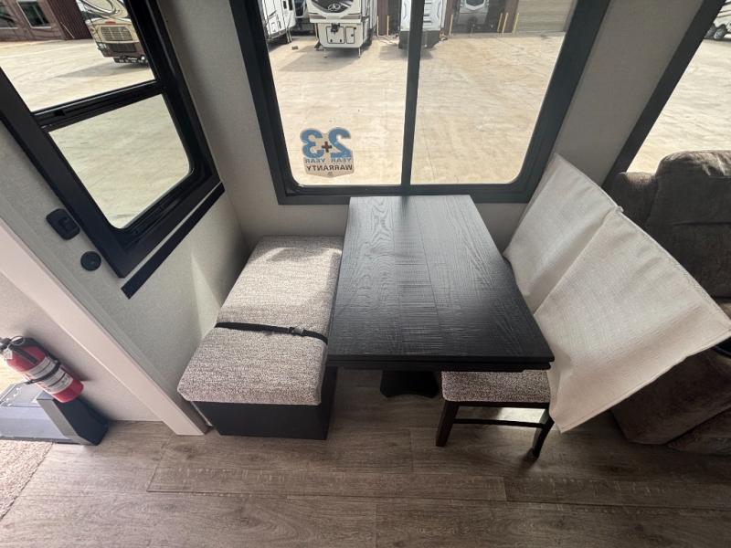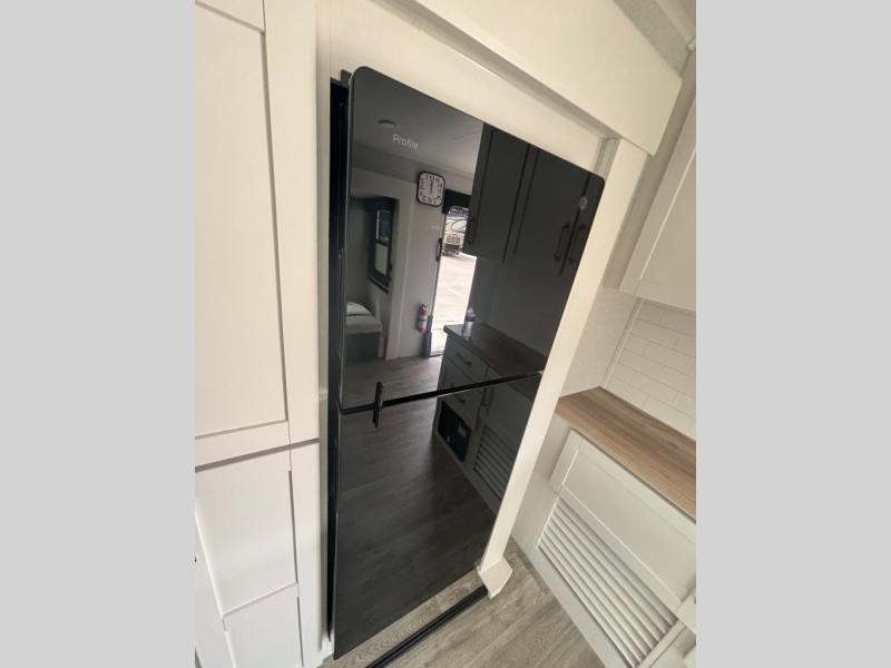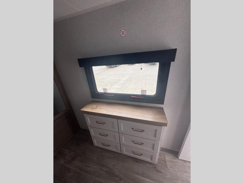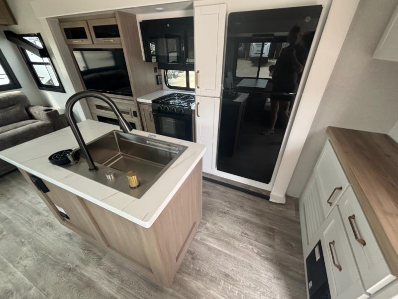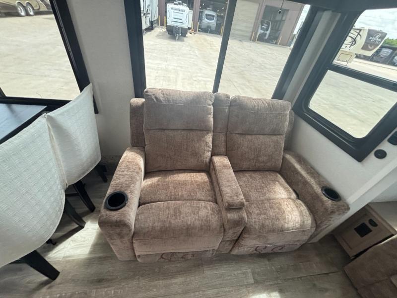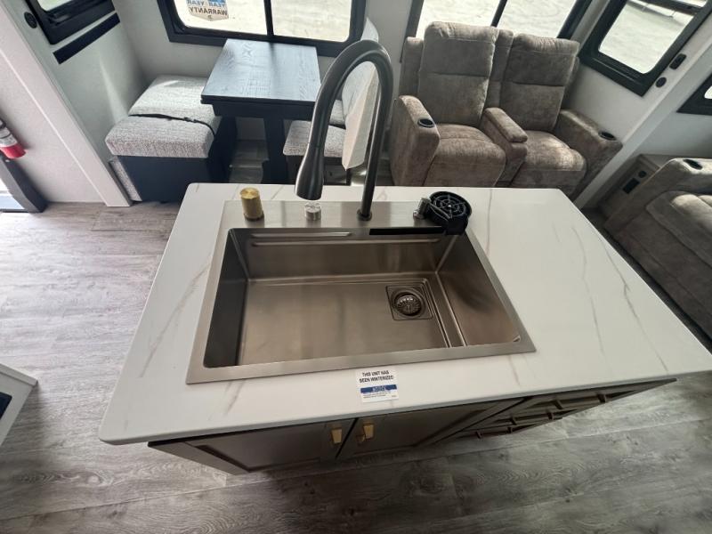 You will feel right at home camping in this travel trailer! It features a front private bedroom with an Olympic queen bed slide for more interior space, a dresser, a front wardrobe to hang your clothes, and a wardrobe that is prepped to add an optional washer and dryer. Start each morning getting squeaky clean in the full bathroom with the shower and then head to the kitchen to fry up some eggs on the stainless steel range. The kitchen island with a multi-functional sink will help make meal prepping easier too, plus there is a hutch to store your dishes. Enjoy a relaxing evening by the fireplace and watch your favorite movie with the entertainment center while sitting on either the rear tri-fold sofa or the theater seating!
