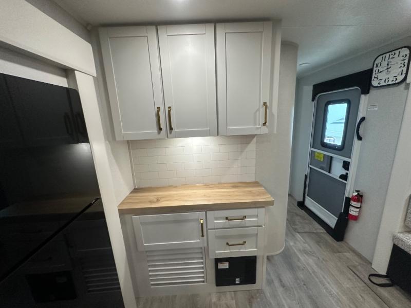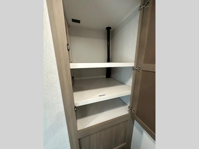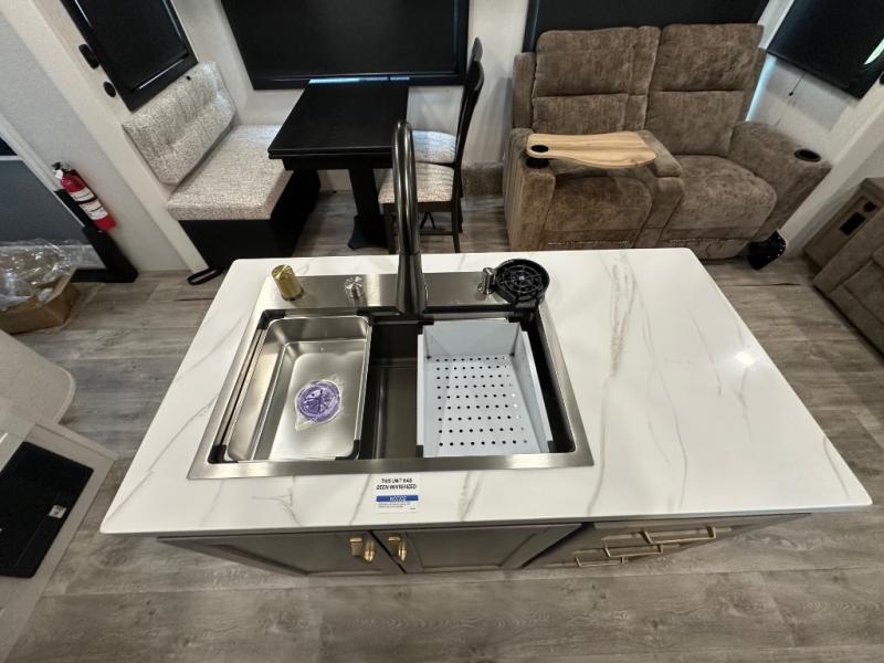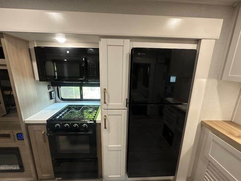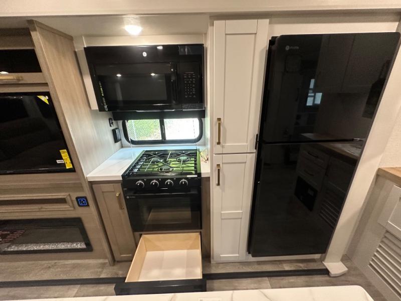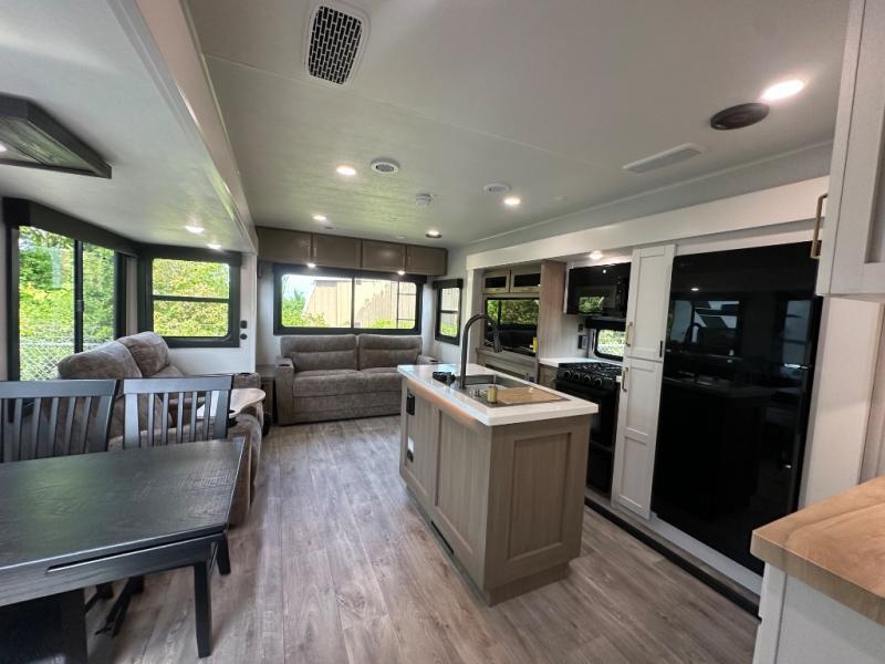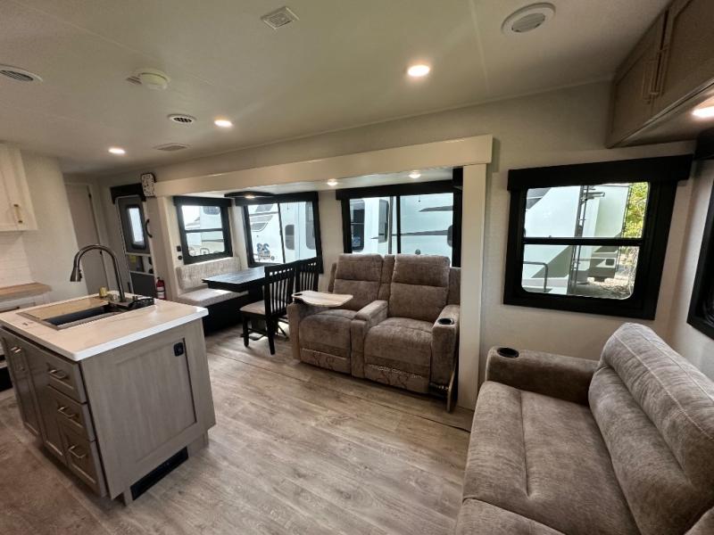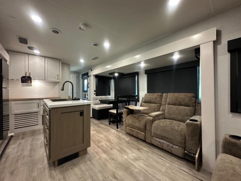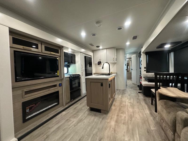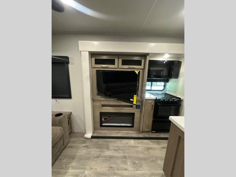 You will feel right at home camping in this travel trailer! It features a front private bedroom with an Olympic queen bed slide for more interior space, a dresser, a front wardrobe to hang your clothes, and a wardrobe that is prepped to add an optional washer and dryer. Start each morning getting squeaky clean in the full bathroom with the shower and then head to the kitchen to fry up some eggs on the stainless steel range. The kitchen island with a multi-functional sink will help make meal prepping easier too, plus there is a hutch to store your dishes. Enjoy a relaxing evening by the fireplace and watch your favorite movie with the entertainment center while sitting on either the rear tri-fold sofa or the theater seating!