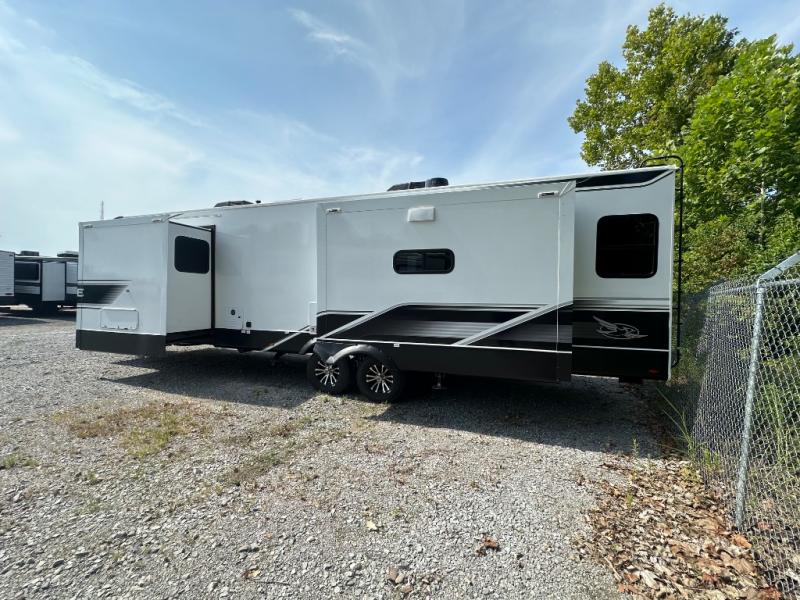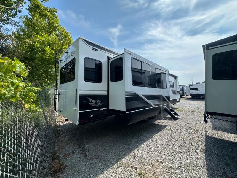 With any Eagle HT fifth wheel or travel trailer by Jayco you will enjoy a smooth drive thanks to the 4 Star Handling Package and MORryde CRE-3000 rubberized suspension. The Customer Value Package includes amenities that are sure to make camping easier than ever, like the 60K on-demand water heater, Keyed-Alike lock system, 15,000 BTU "Whisper Quiet" A/C, and more. Handcrafted door/drawer fronts will make your space feel more like home, along with residential vinyl flooring throughout, GE appliances, and blackout roller shades with reflective side throughout to keep the sun out when you want to sleep in. Each model also includes a NuVo H2O water treatment system with filters included, interior and exterior "Blue Sync" audio connect with MB Quart Sound for your TV and phone, and 100% no floor vents for added comfort and convenience!