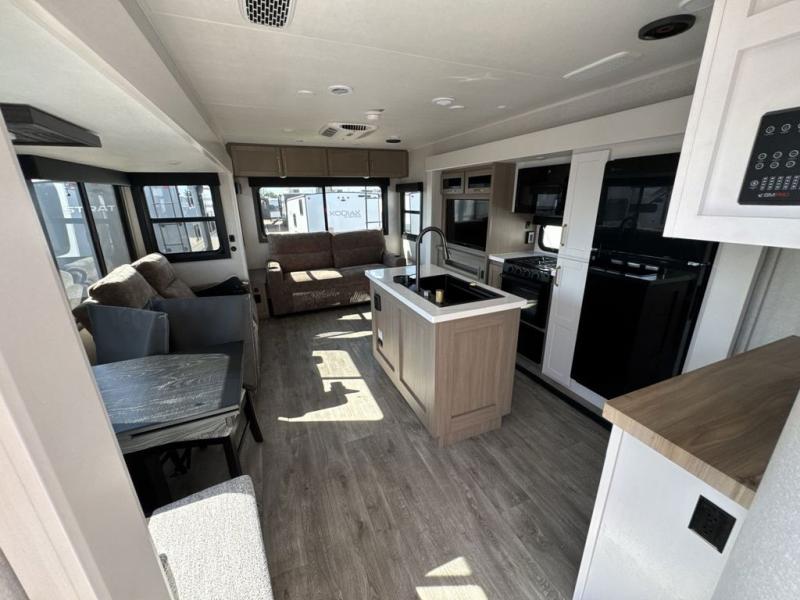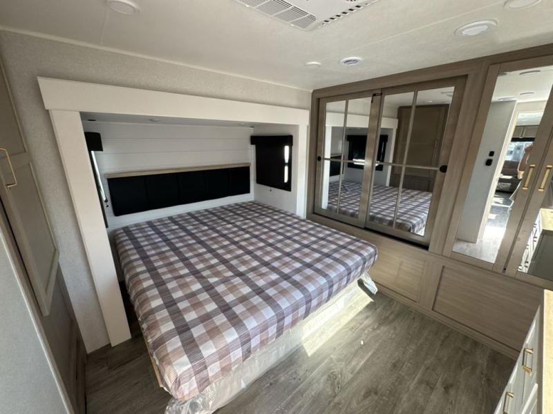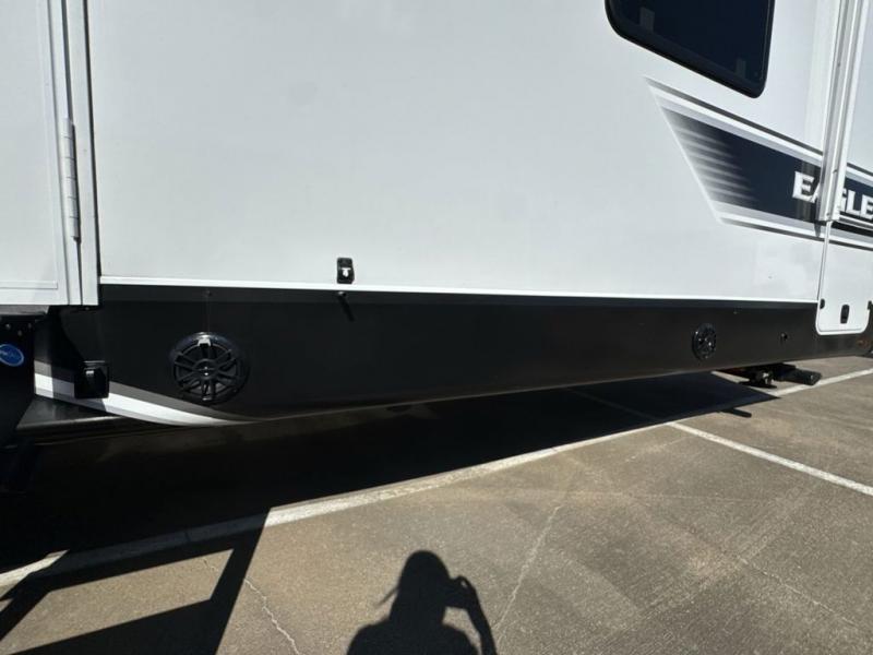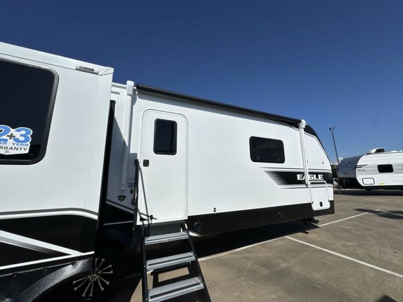 With any Eagle HT fifth wheel or travel trailer by Jayco you will enjoy a smooth drive thanks to the 4 Star Handling Package and MORryde CRE-3000 rubberized suspension. The Customer Value Package includes amenities that are sure to make camping easier than ever, like the 60K on-demand water heater, Keyed-Alike lock system, 15,000 BTU "Whisper Quiet" A/C, and more. Handcrafted door/drawer fronts will make your space feel more like home, along with residential vinyl flooring throughout, GE appliances, and blackout roller shades with reflective side throughout to keep the sun out when you want to sleep in. Each model also includes a NuVo H2O water treatment system with filters included, interior and exterior "Blue Sync" audio connect with MB Quart Sound for your TV and phone, and 100% no floor vents for added comfort and convenience!