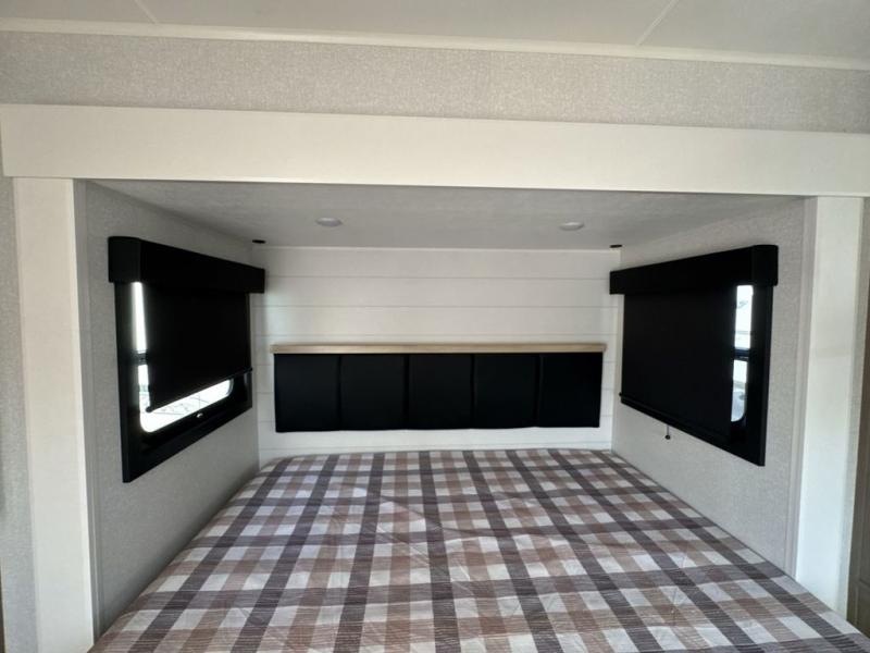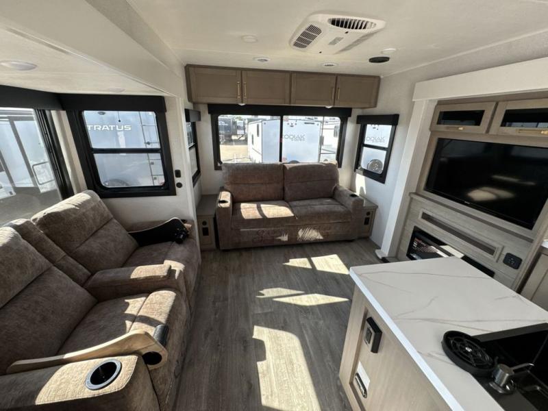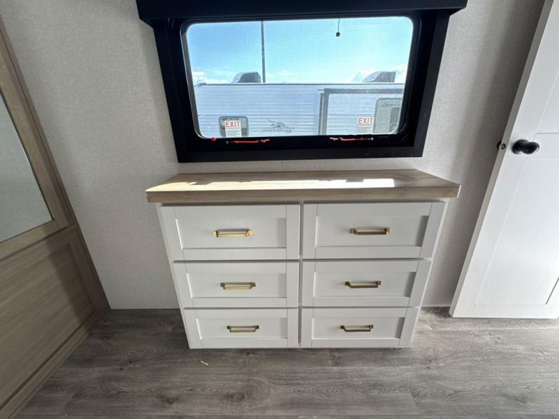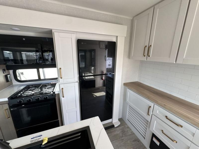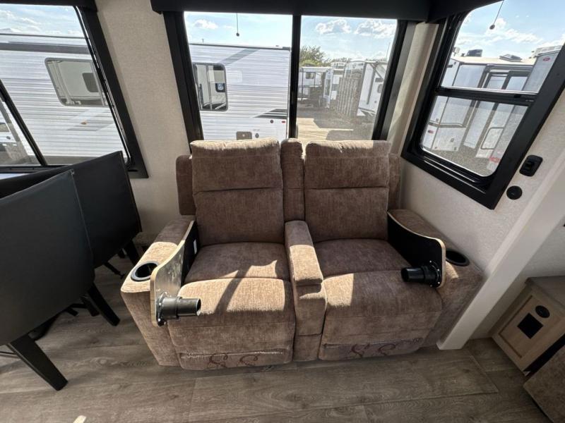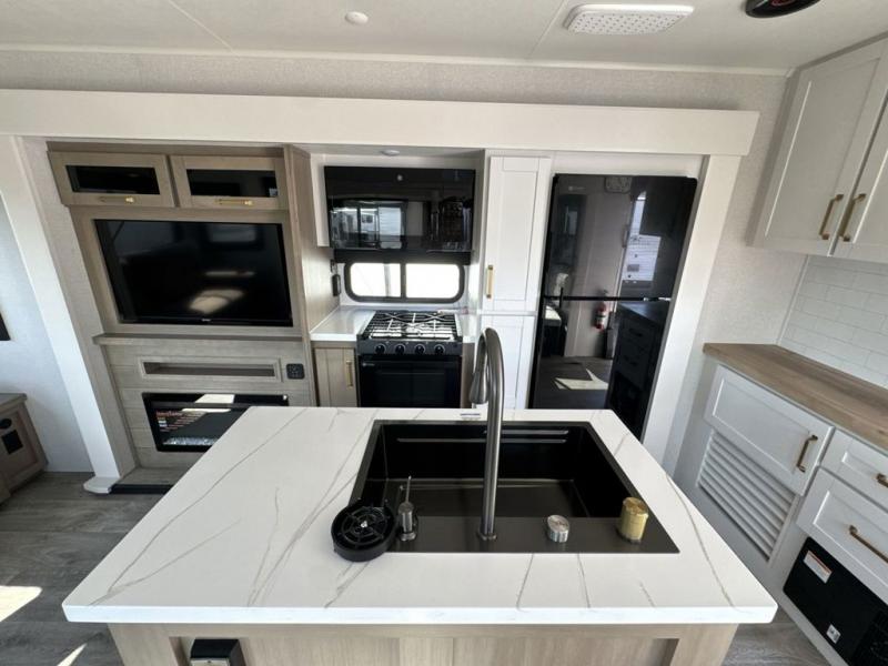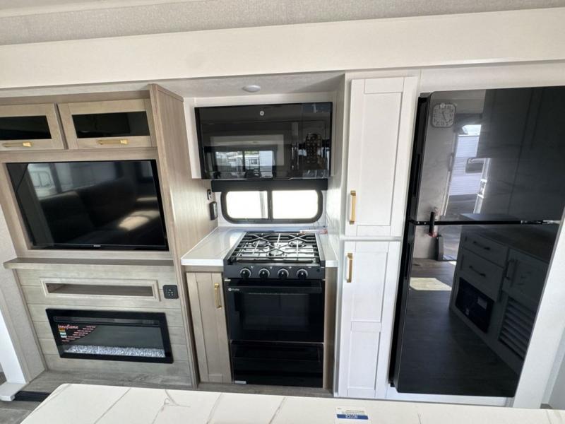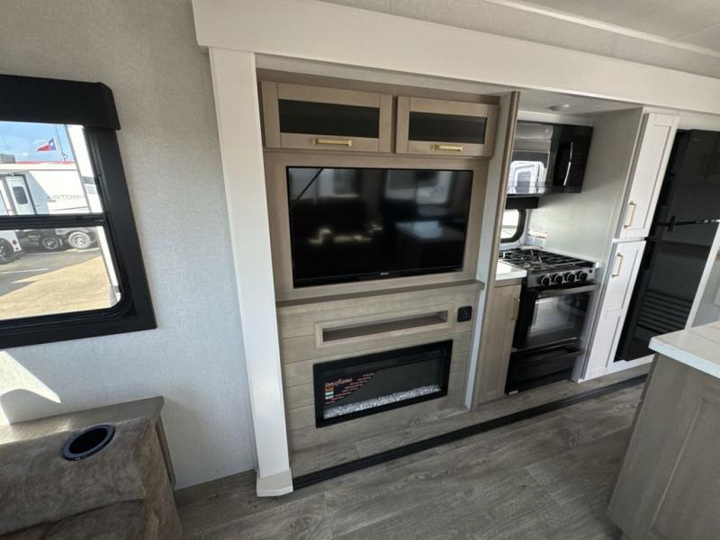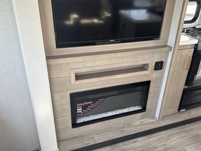 You will feel right at home camping in this travel trailer! It features a front private bedroom with an Olympic queen bed slide for more interior space, a dresser, a front wardrobe to hang your clothes, and a wardrobe that is prepped to add an optional washer and dryer. Start each morning getting squeaky clean in the full bathroom with the shower and then head to the kitchen to fry up some eggs on the stainless steel range. The kitchen island with a multi-functional sink will help make meal prepping easier too, plus there is a hutch to store your dishes. Enjoy a relaxing evening by the fireplace and watch your favorite movie with the entertainment center while sitting on either the rear tri-fold sofa or the theater seating!