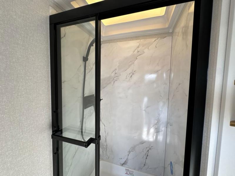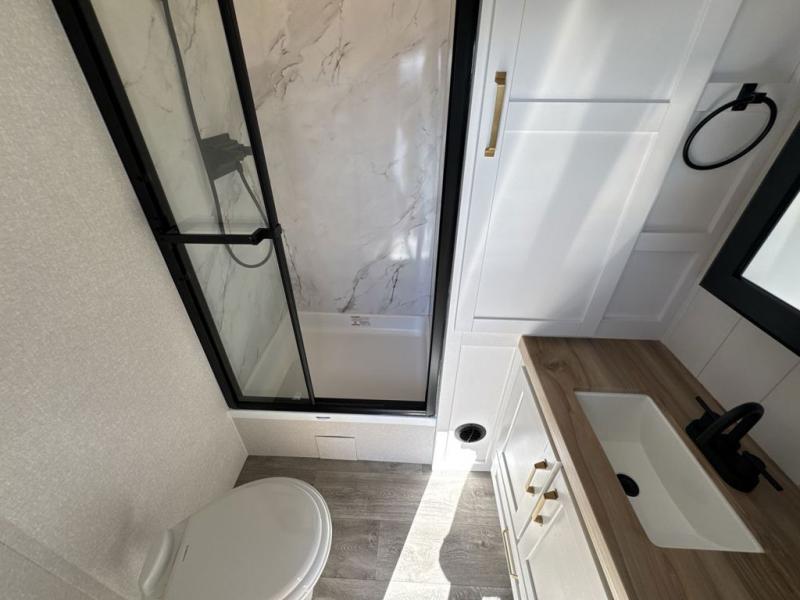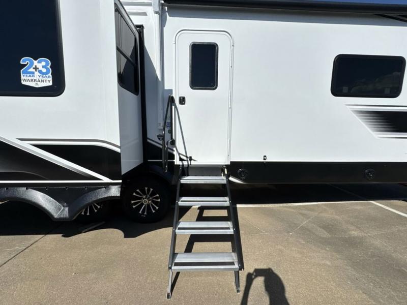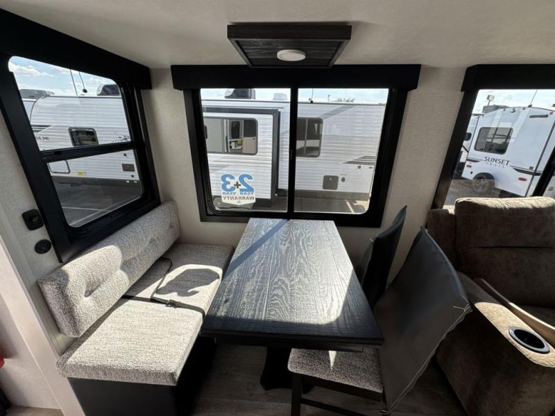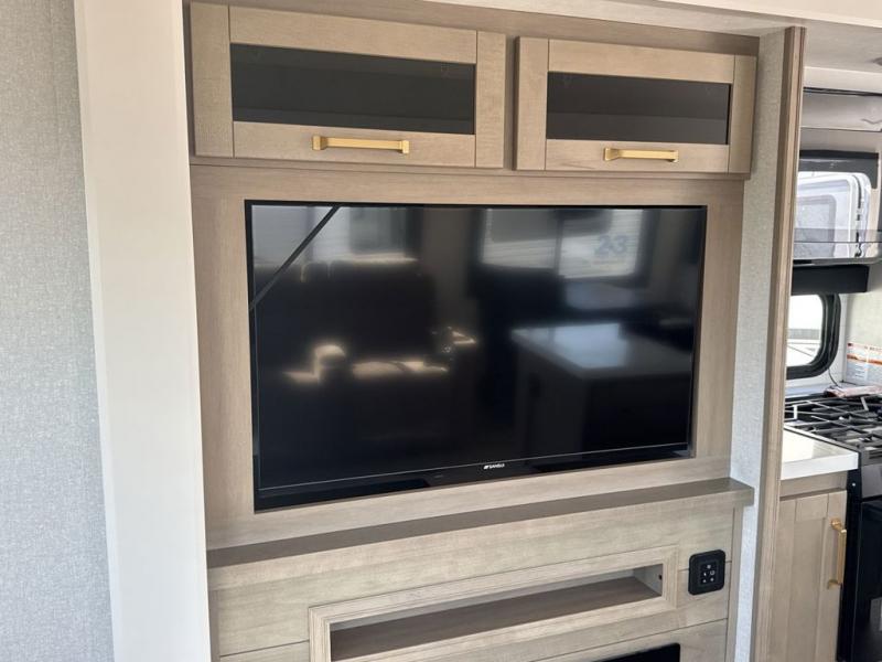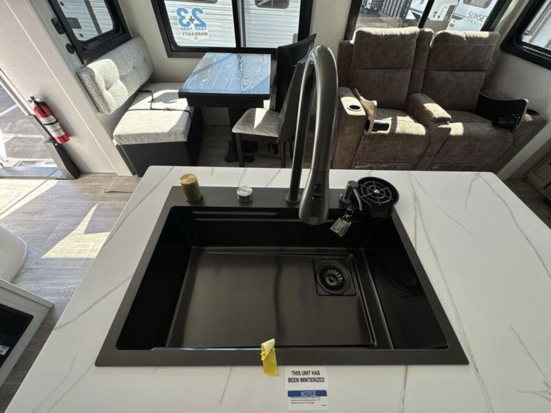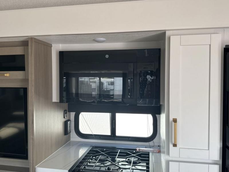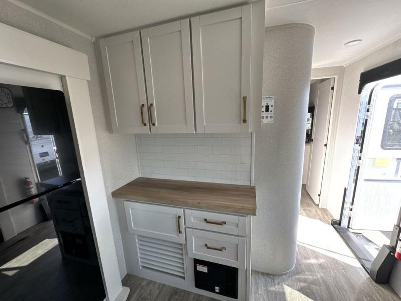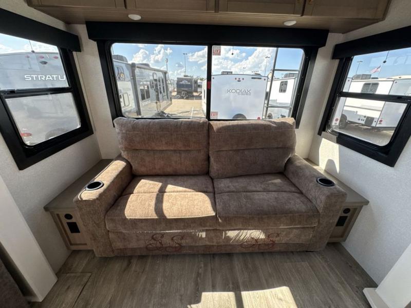 You will feel right at home camping in this travel trailer! It features a front private bedroom with an Olympic queen bed slide for more interior space, a dresser, a front wardrobe to hang your clothes, and a wardrobe that is prepped to add an optional washer and dryer. Start each morning getting squeaky clean in the full bathroom with the shower and then head to the kitchen to fry up some eggs on the stainless steel range. The kitchen island with a multi-functional sink will help make meal prepping easier too, plus there is a hutch to store your dishes. Enjoy a relaxing evening by the fireplace and watch your favorite movie with the entertainment center while sitting on either the rear tri-fold sofa or the theater seating!