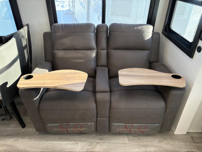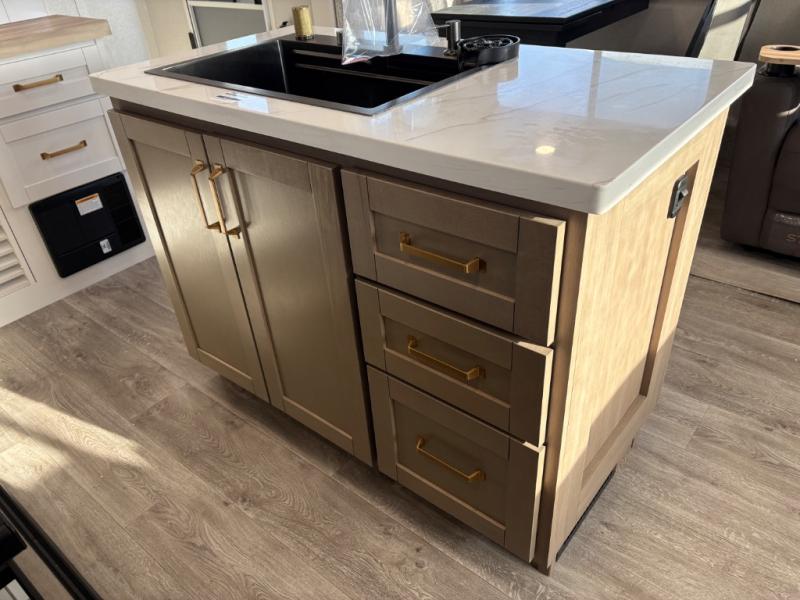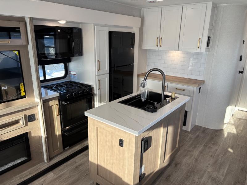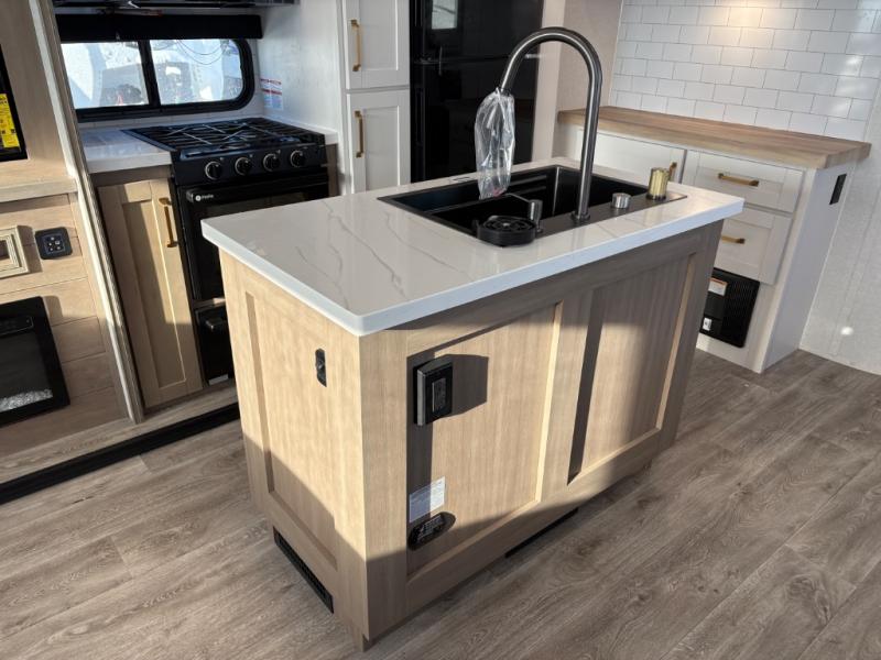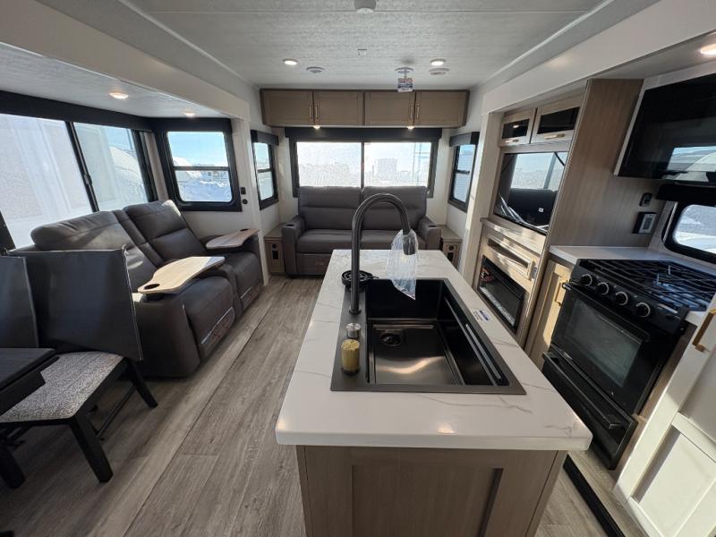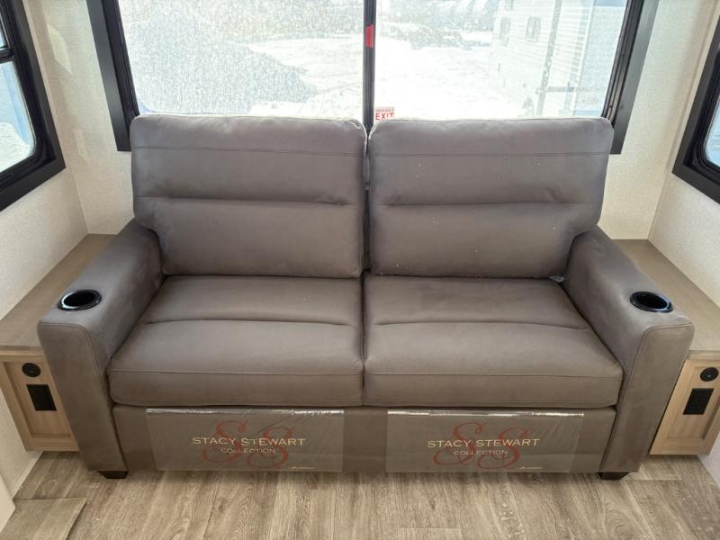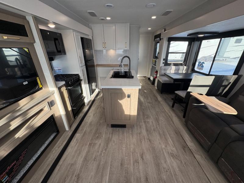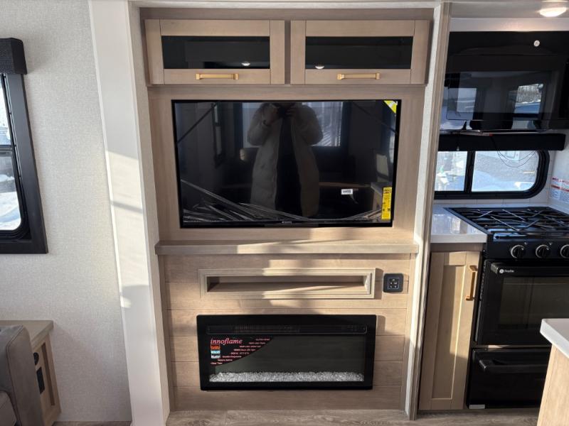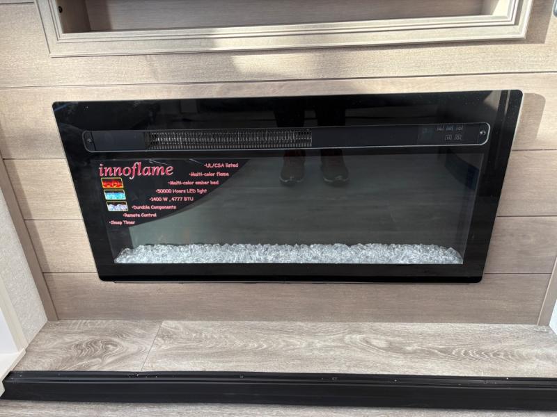 You will feel right at home camping in this travel trailer! It features a front private bedroom with an Olympic queen bed slide for more interior space, a dresser, a front wardrobe to hang your clothes, and a wardrobe that is prepped to add an optional washer and dryer. Start each morning getting squeaky clean in the full bathroom with the shower and then head to the kitchen to fry up some eggs on the stainless steel range. The kitchen island with a multi-functional sink will help make meal prepping easier too, plus there is a hutch to store your dishes. Enjoy a relaxing evening by the fireplace and watch your favorite movie with the entertainment center while sitting on either the rear tri-fold sofa or the theater seating!