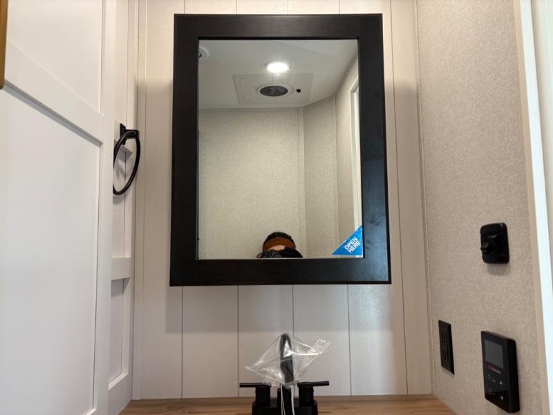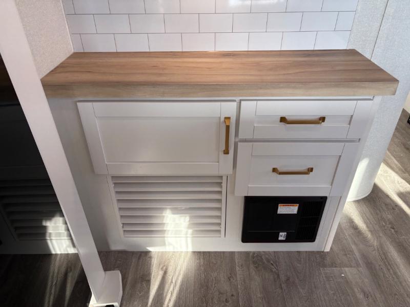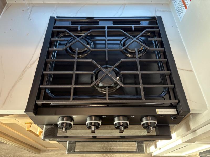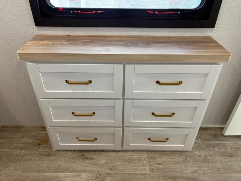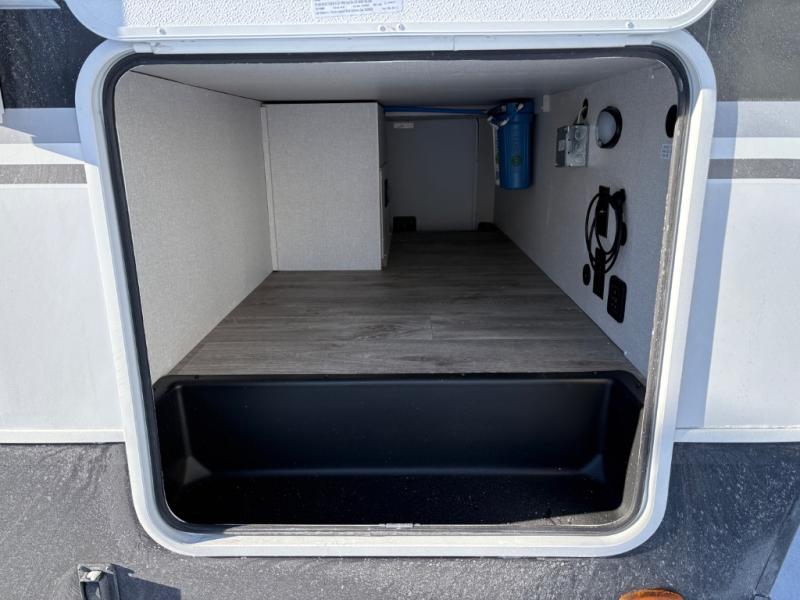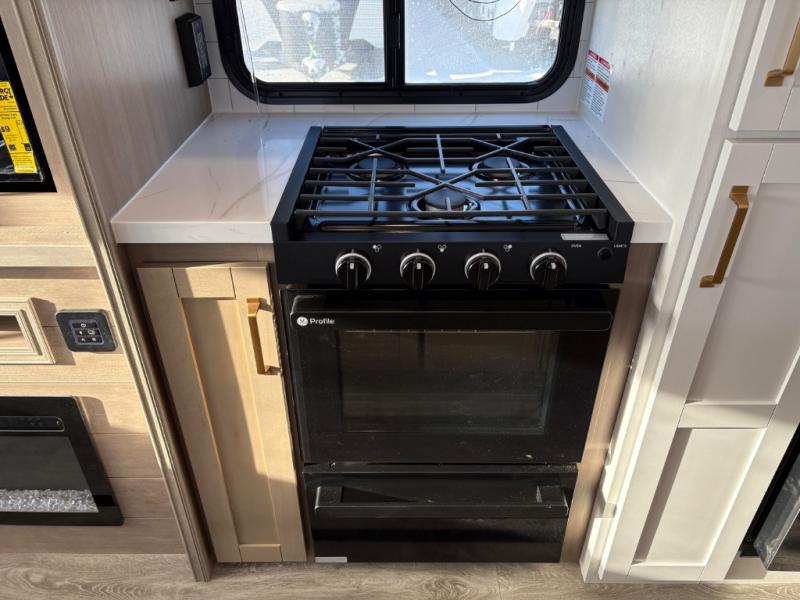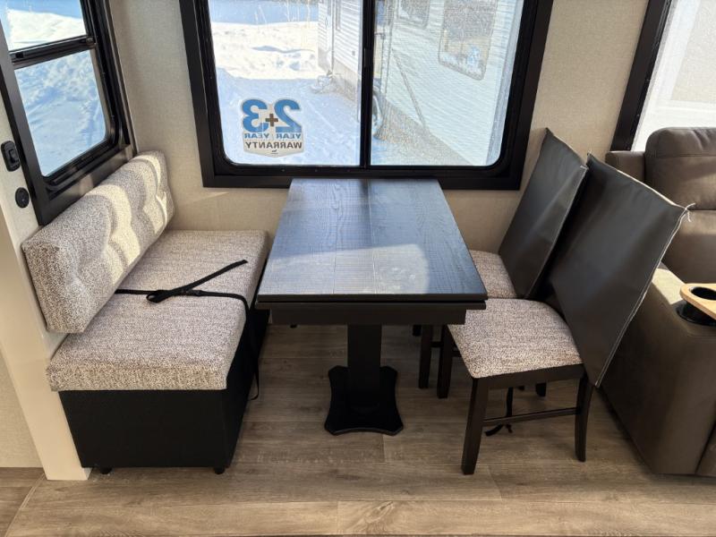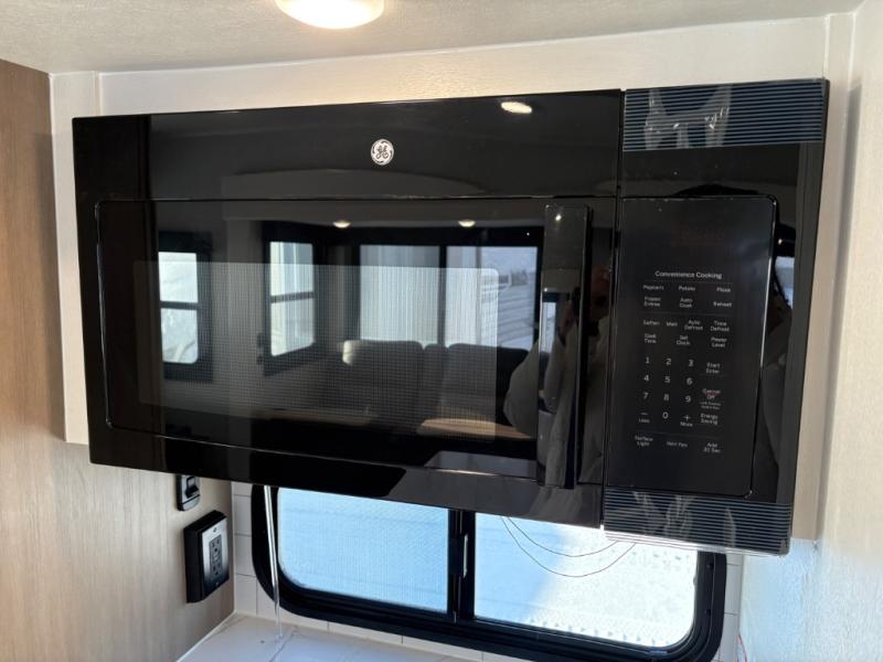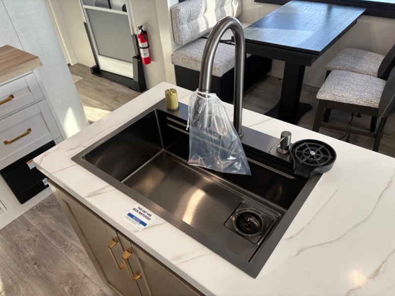 You will feel right at home camping in this travel trailer! It features a front private bedroom with an Olympic queen bed slide for more interior space, a dresser, a front wardrobe to hang your clothes, and a wardrobe that is prepped to add an optional washer and dryer. Start each morning getting squeaky clean in the full bathroom with the shower and then head to the kitchen to fry up some eggs on the stainless steel range. The kitchen island with a multi-functional sink will help make meal prepping easier too, plus there is a hutch to store your dishes. Enjoy a relaxing evening by the fireplace and watch your favorite movie with the entertainment center while sitting on either the rear tri-fold sofa or the theater seating!