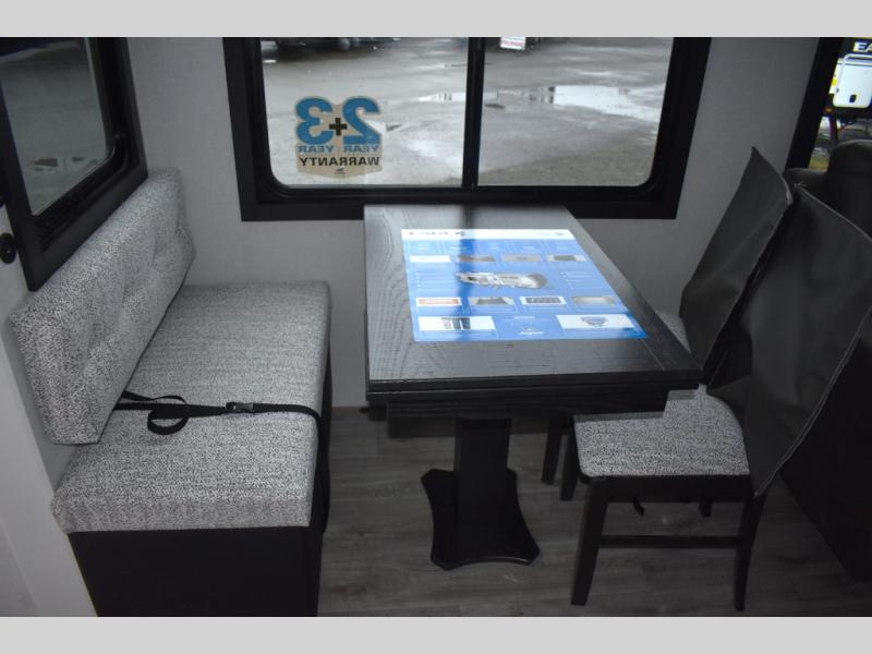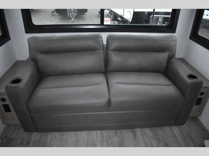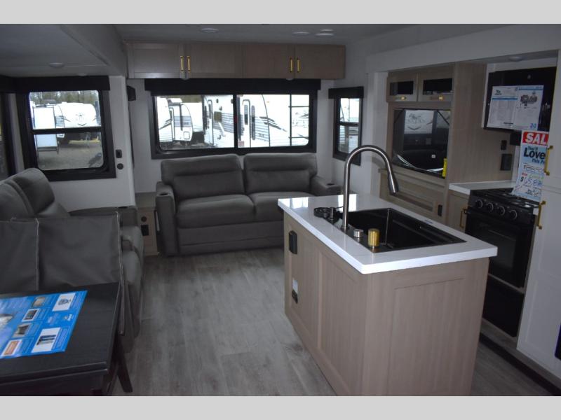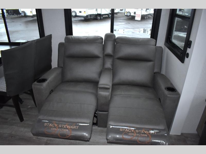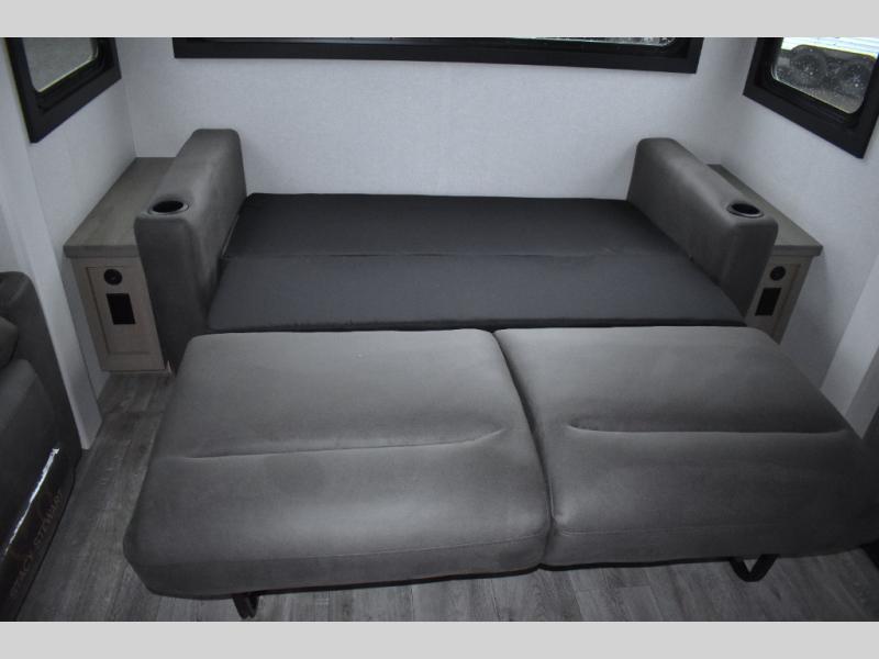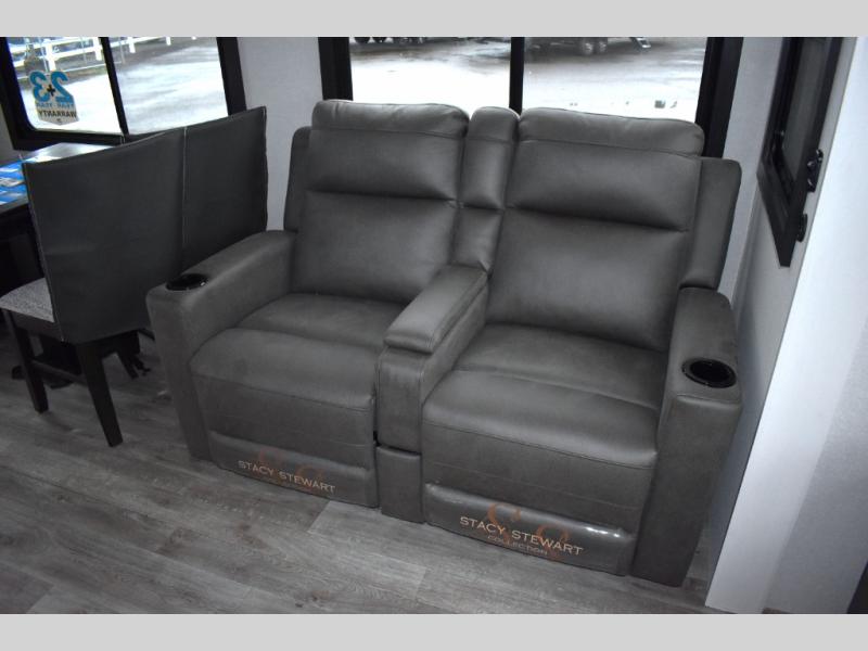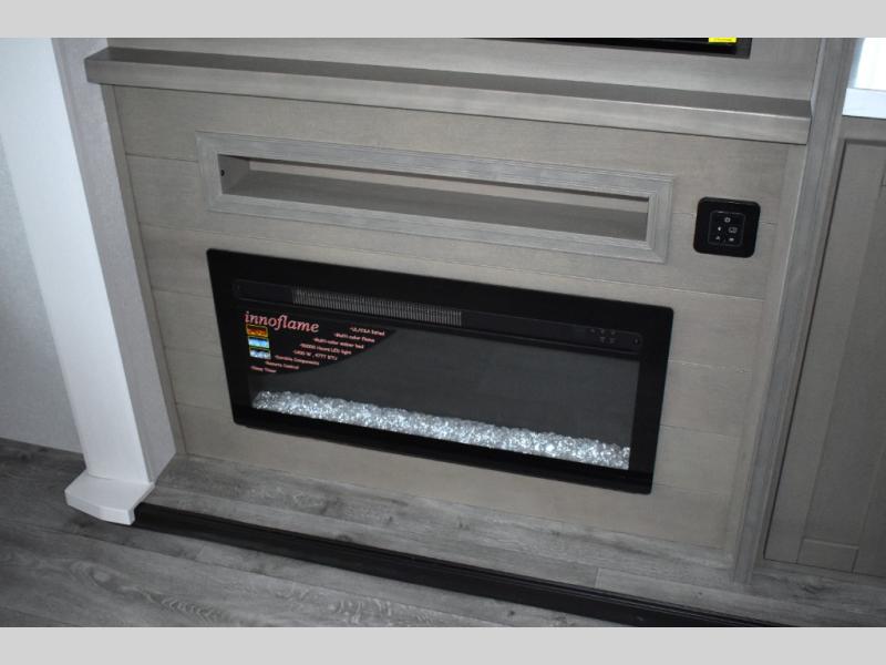You will feel right at home camping in this travel trailer! It features a front private bedroom with an Olympic queen bed slide for more interior space, a dresser, a front wardrobe to hang your clothes, and a wardrobe that is prepped to add an optional washer and dryer. Start each morning getting squeaky clean in the full bathroom with the shower and then head to the kitchen to fry up some eggs on the stainless steel range. The kitchen island with a multi-functional sink will help make meal prepping easier too, plus there is a hutch to store your dishes. Enjoy a relaxing evening by the fireplace and watch your favorite movie with the entertainment center while sitting on either the rear tri-fold sofa or the theater seating!