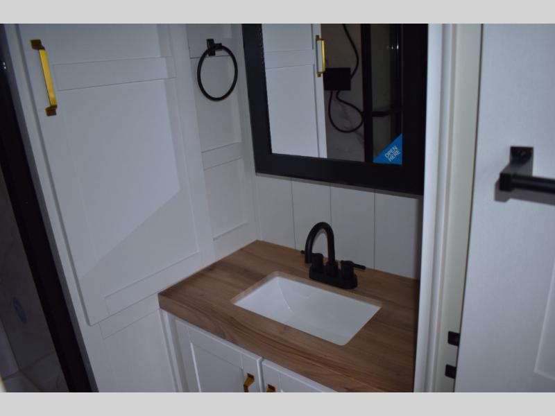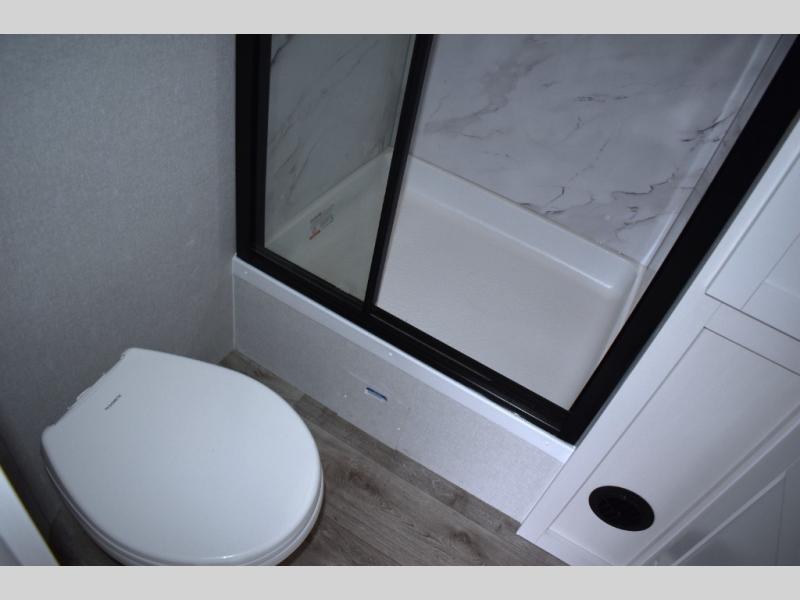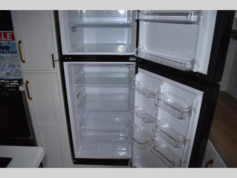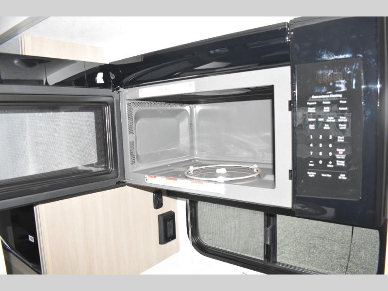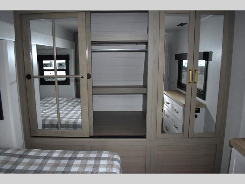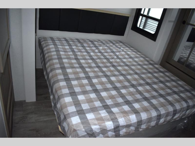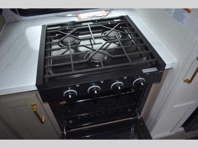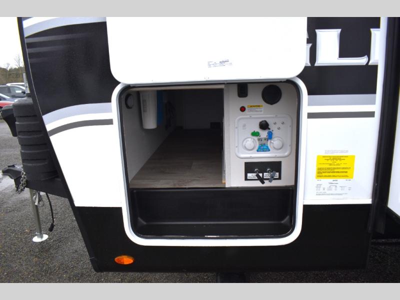 You will feel right at home camping in this travel trailer! It features a front private bedroom with an Olympic queen bed slide for more interior space, a dresser, a front wardrobe to hang your clothes, and a wardrobe that is prepped to add an optional washer and dryer. Start each morning getting squeaky clean in the full bathroom with the shower and then head to the kitchen to fry up some eggs on the stainless steel range. The kitchen island with a multi-functional sink will help make meal prepping easier too, plus there is a hutch to store your dishes. Enjoy a relaxing evening by the fireplace and watch your favorite movie with the entertainment center while sitting on either the rear tri-fold sofa or the theater seating!