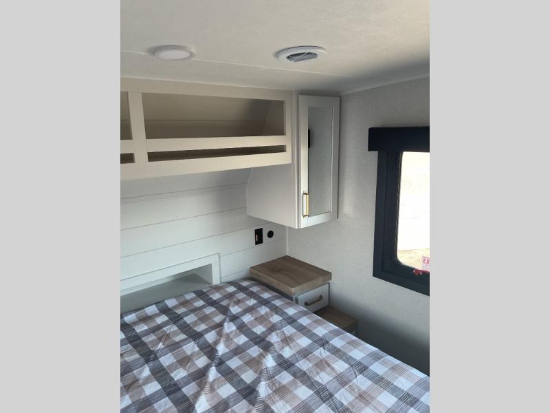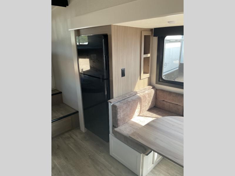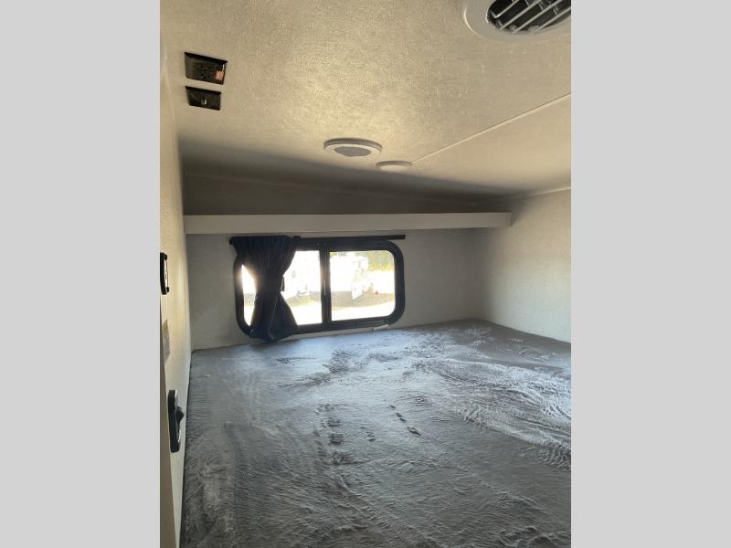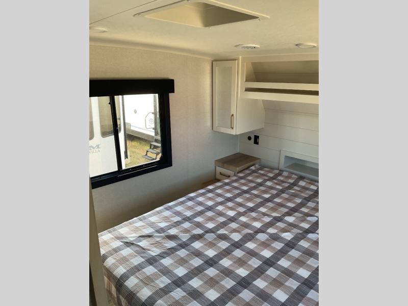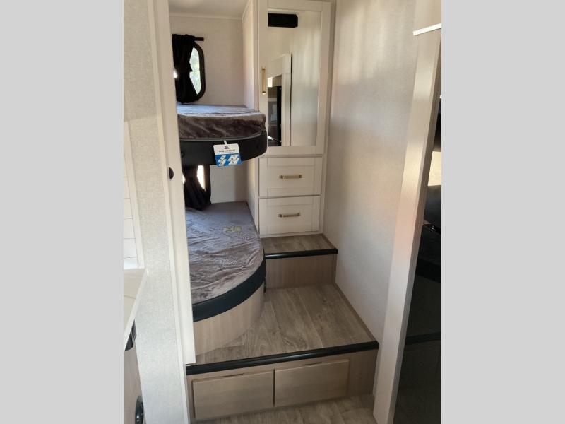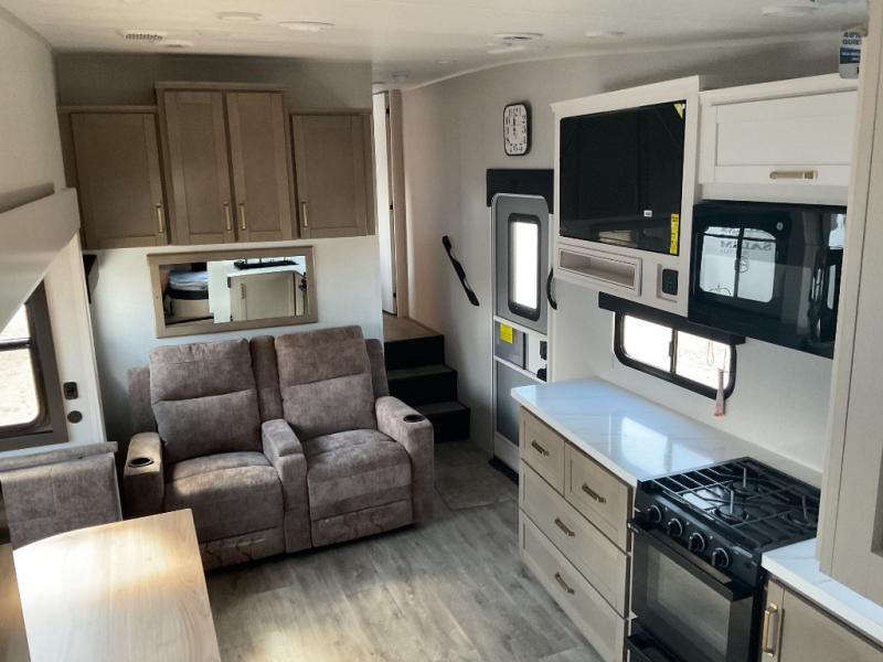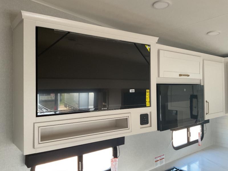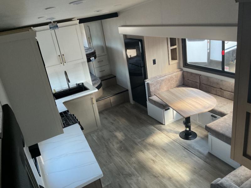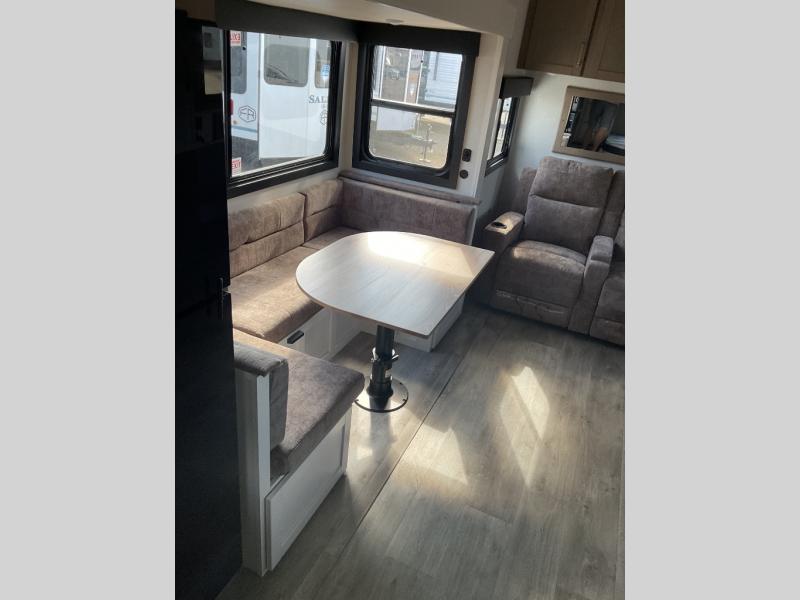 If you're needing a fifth wheel with more sleeping space, this unit will be perfect for you! There are double-size bunks in the back with a wardrobe for your guests' things and TV prep if you want to add a TV here. The front private bedroom up front will have you feeling right at home with its Olympic queen bed and dual wardrobes, and any additional guests you have can sleep on the U-shaped dinette within the slide out. There is also a theater seat here where you can relax with a good book in the evenings.