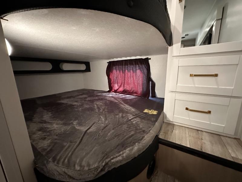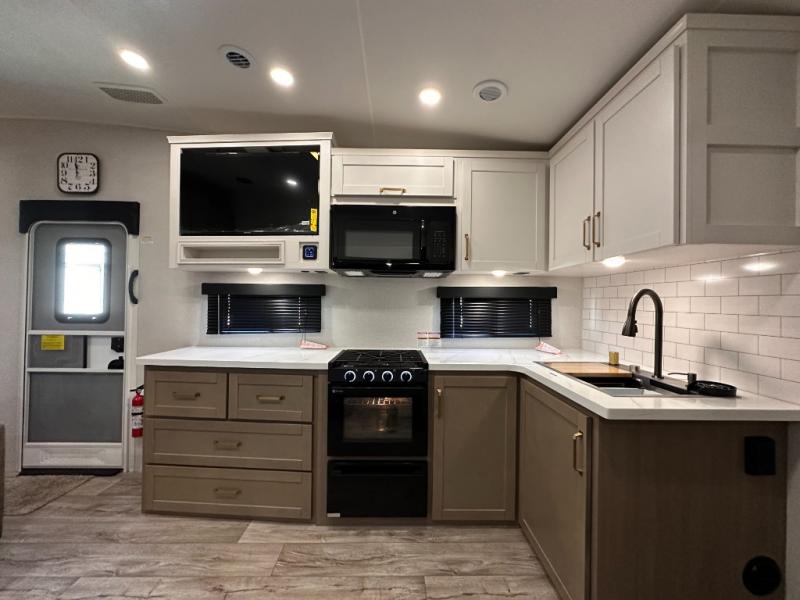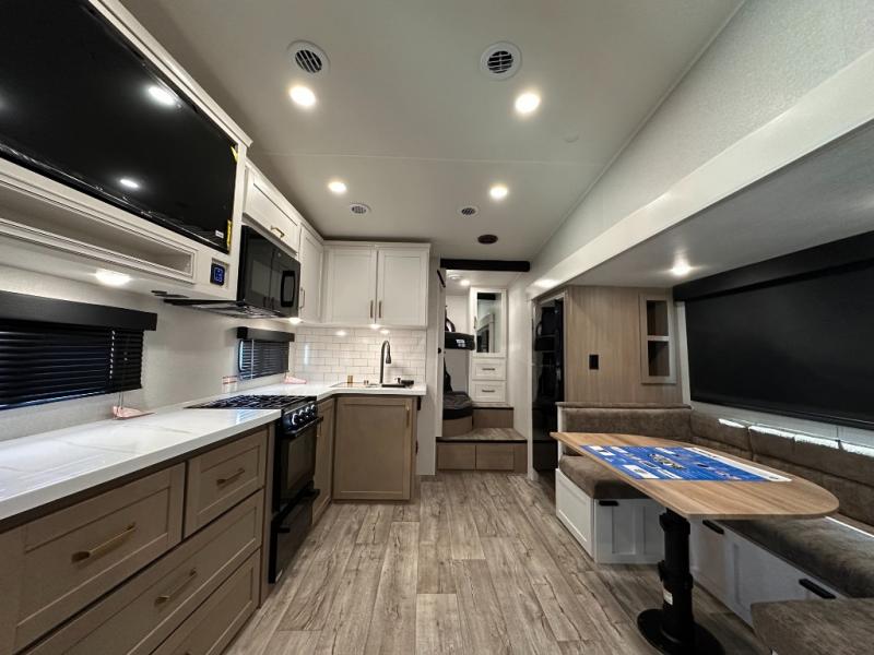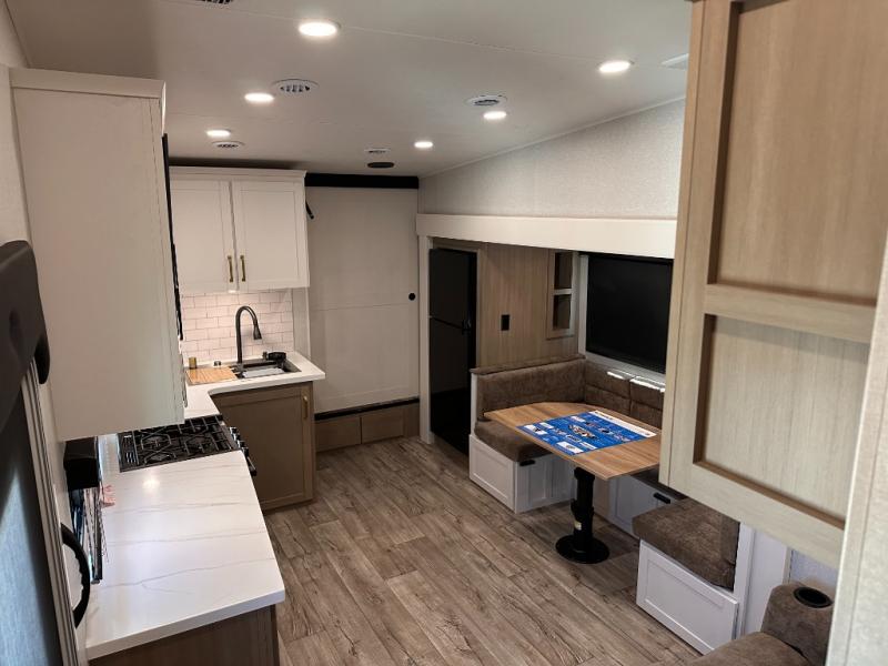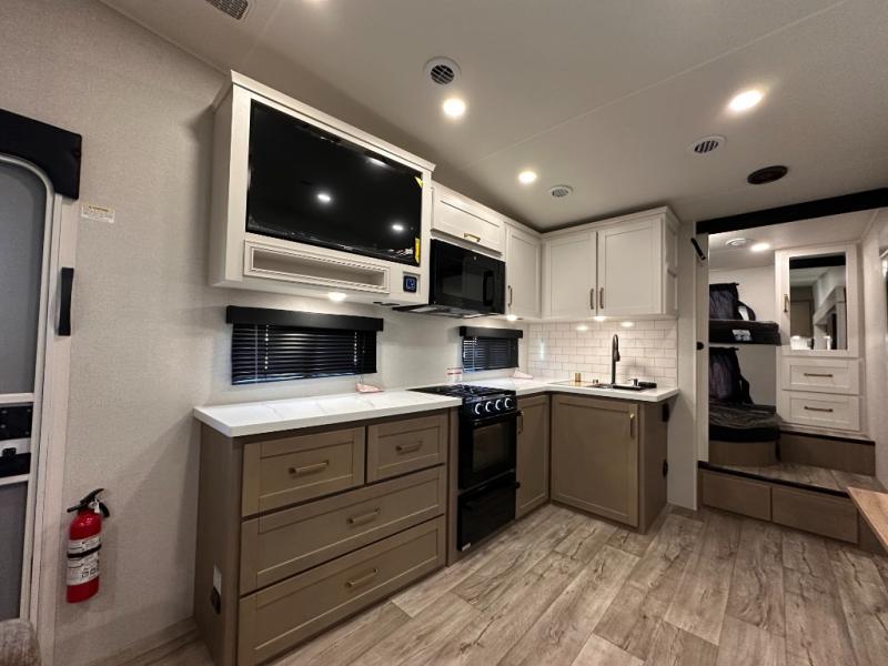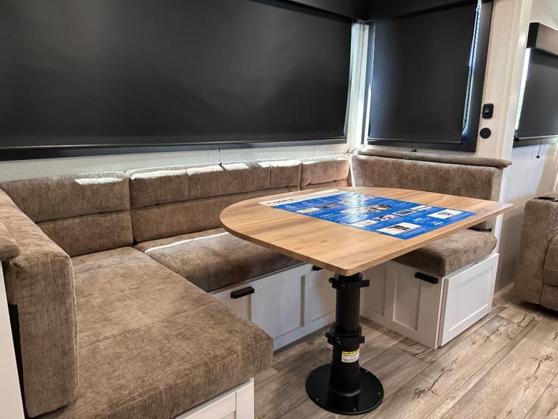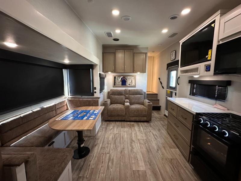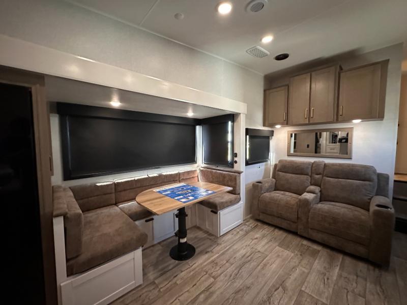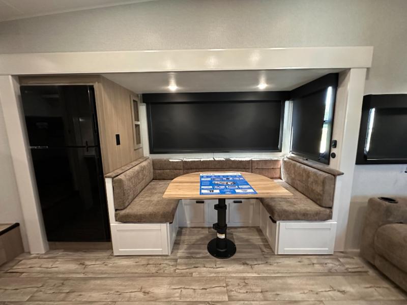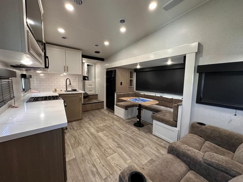 If you're needing a fifth wheel with more sleeping space, this unit will be perfect for you! There are double-size bunks in the back with a wardrobe for your guests' things and TV prep if you want to add a TV here. The front private bedroom up front will have you feeling right at home with its Olympic queen bed and dual wardrobes, and any additional guests you have can sleep on the U-shaped dinette within the slide out. There is also a theater seat here where you can relax with a good book in the evenings.