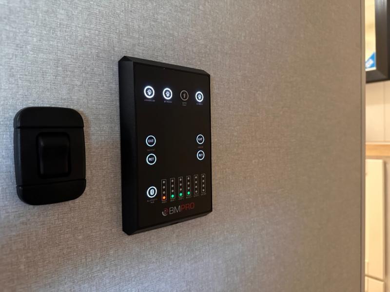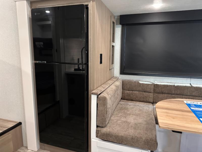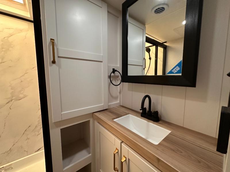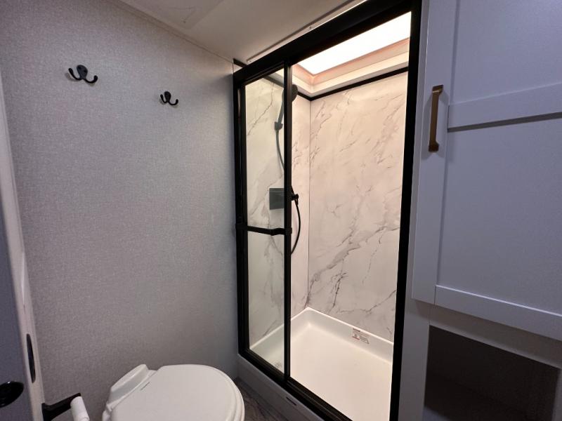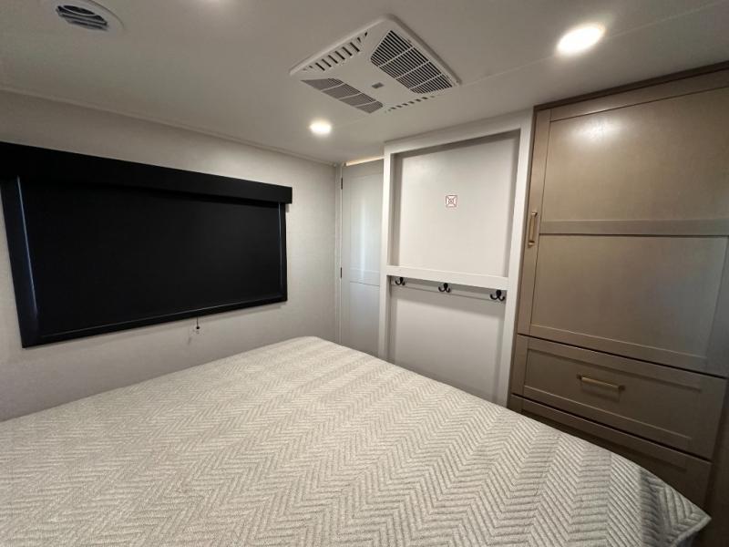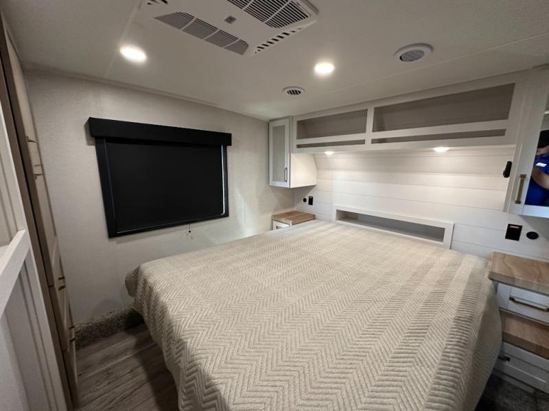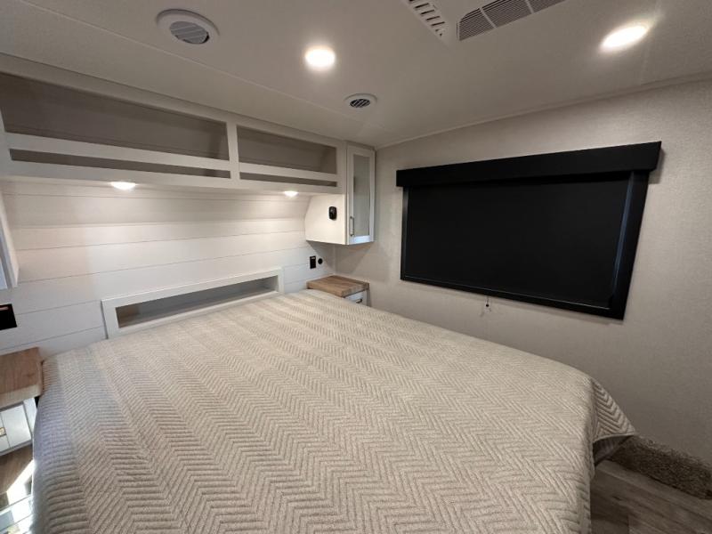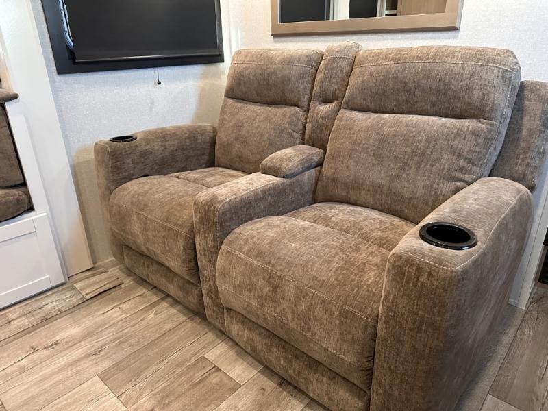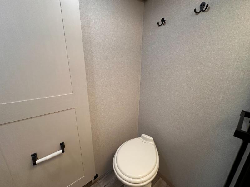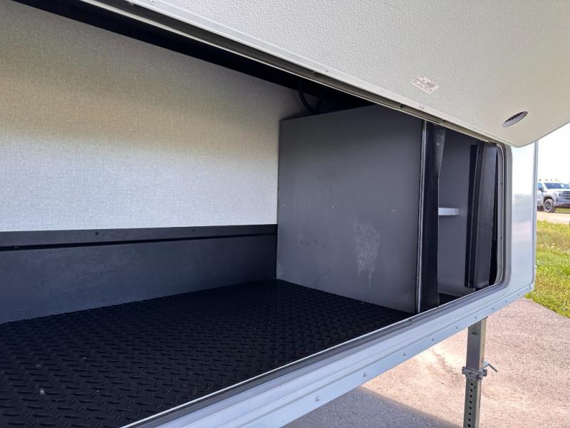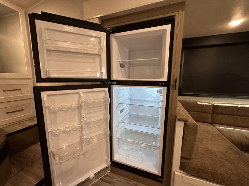 If you're needing a fifth wheel with more sleeping space, this unit will be perfect for you! There are double-size bunks in the back with a wardrobe for your guests' things and TV prep if you want to add a TV here. The front private bedroom up front will have you feeling right at home with its Olympic queen bed and dual wardrobes, and any additional guests you have can sleep on the U-shaped dinette within the slide out. There is also a theater seat here where you can relax with a good book in the evenings.