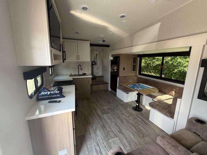With any Eagle HT fifth wheel or travel trailer by Jayco you will enjoy a smooth drive thanks to the 4 Star Handling Package, Goodyear Endurance tires, and MORryde CRE-3000 rubberized suspension. The Customer Value Package includes amenities that are sure to make camping easier than ever, like the 60K on-demand water heater, Keyed-Alike lock system, 15,000 BTU "Whisper Quiet" A/C, and more. Handcrafted and glazed door/drawer fronts will make your space feel more like home, along with residential vinyl flooring throughout, GE appliances, and blackout roller shades with reflective side throughout to keep the sun out when you want to sleep in. Each model also includes a NuVo H2O water treatment system with filters included, interior and exterior "Blue Sync" audio connect with MB Quart Sound for your TV and phone, and 100% no floor vents for added comfort and convenience!